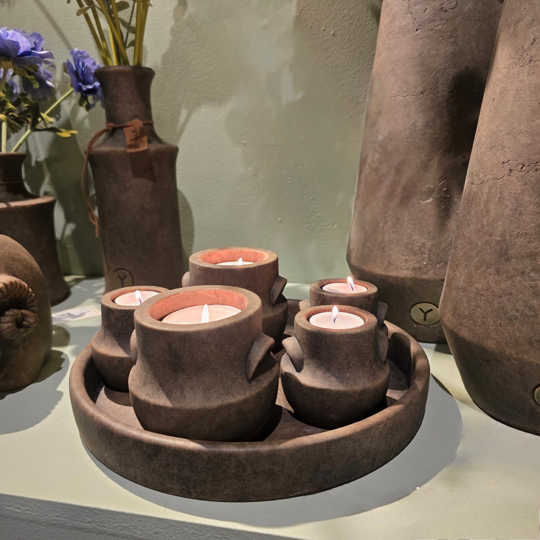 De ronde schaal met een diameter van 30 cm is gevuld met vijf bijpassende waxinehouders in diverse hoogtes en vormen. Samen vormen ze een complete set die direct zorgt voor sfeer en warmte in je interieur.