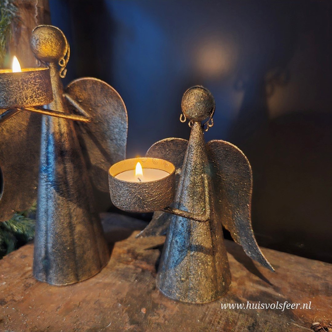 Engel met waxinelichthouder.