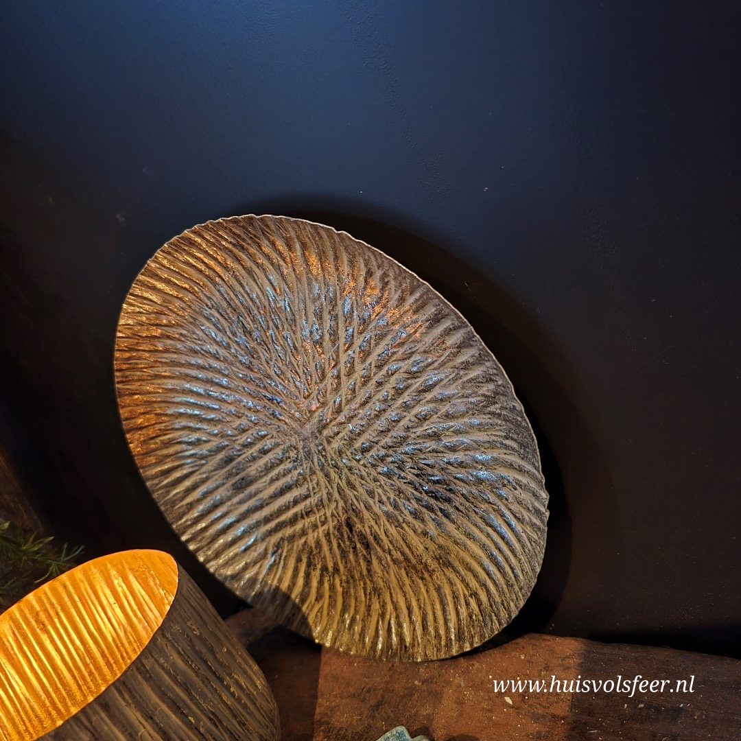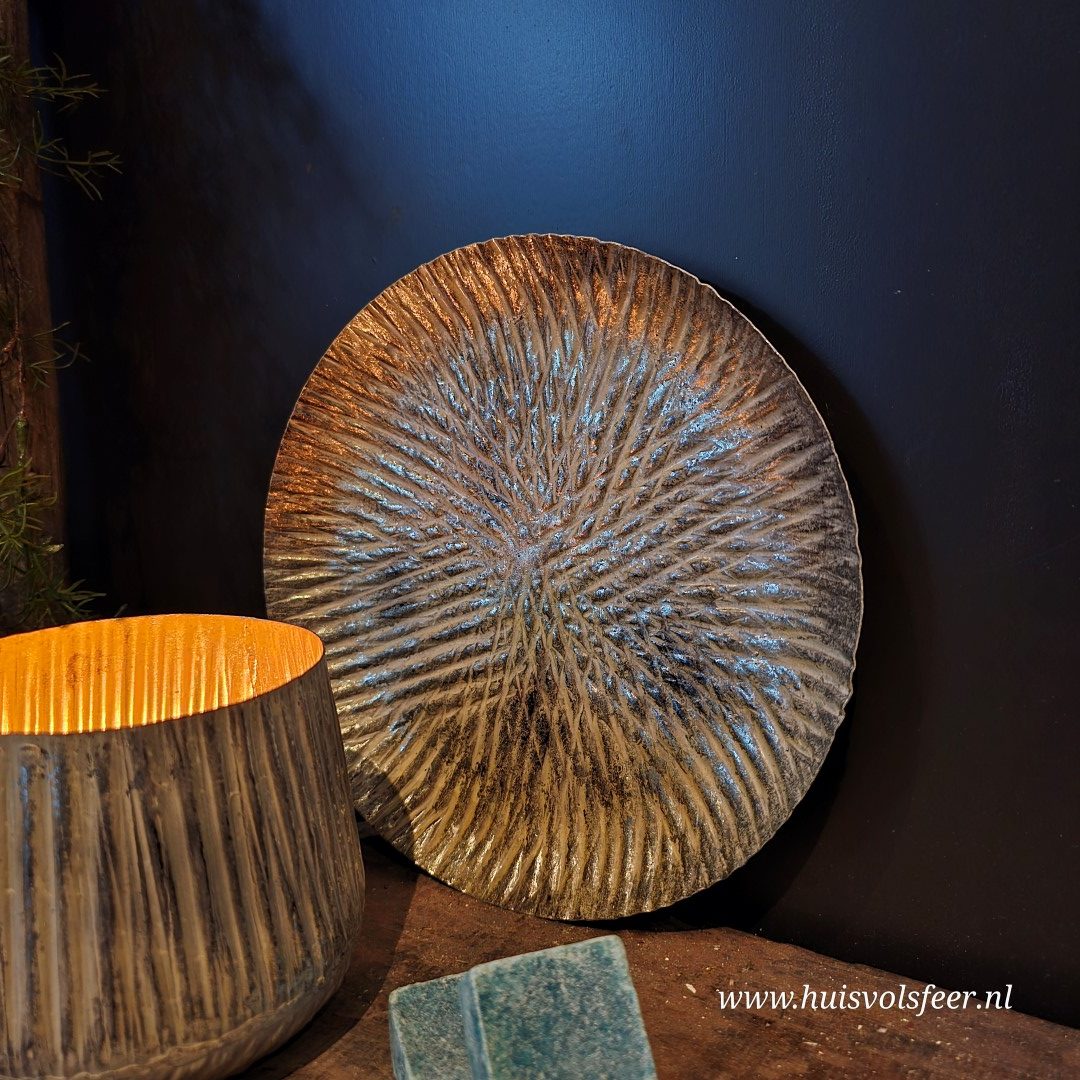 Deze prachtige metalen schaal in goud met witte accenten straalt luxe en sfeer uit. De subtiel bewerkte structuur zorgt voor een mooi spel van licht en schaduw, waardoor de schaal een echte blikvanger is in elk interieur.