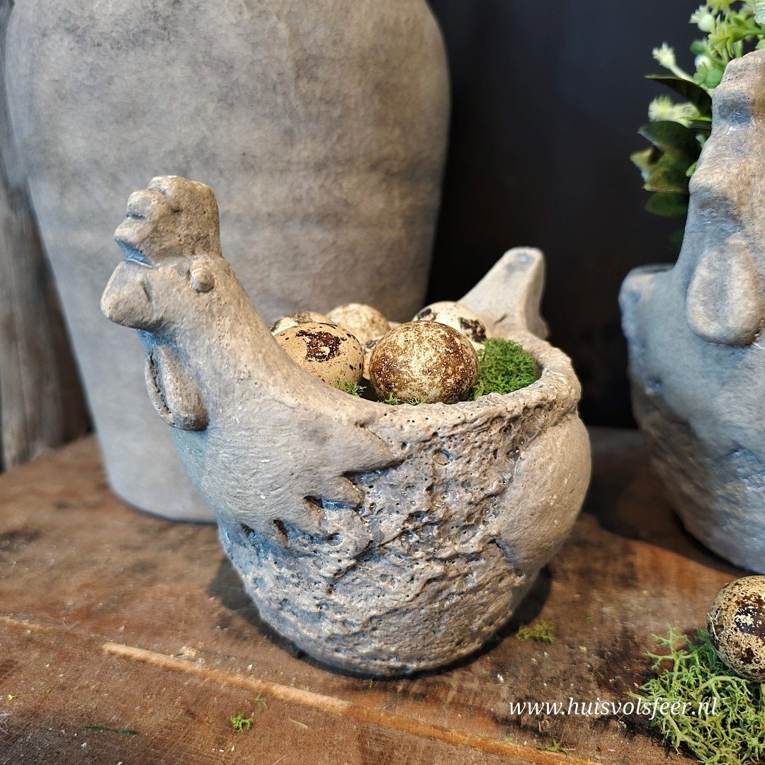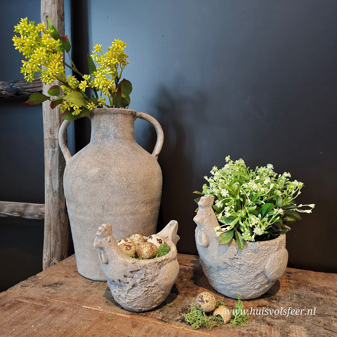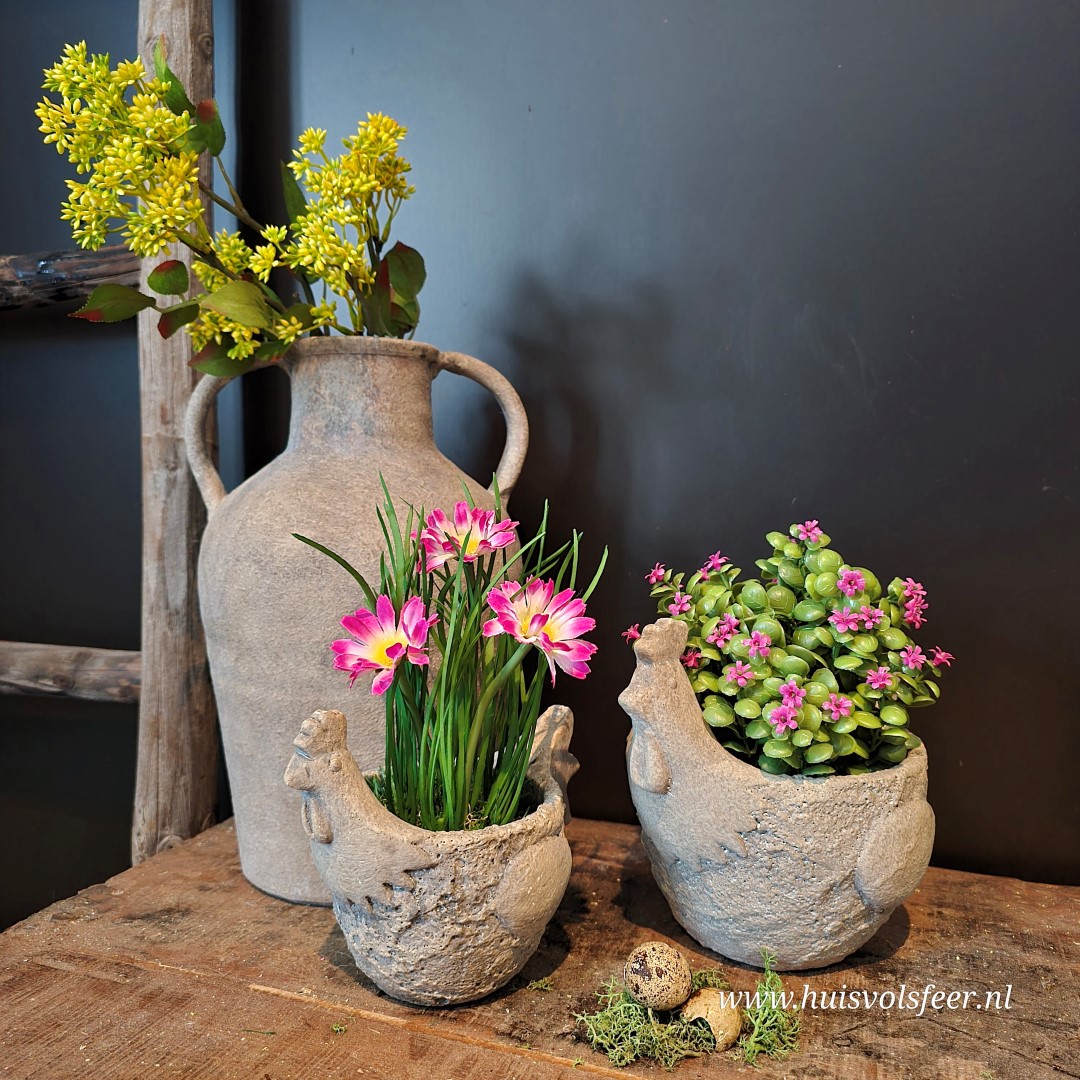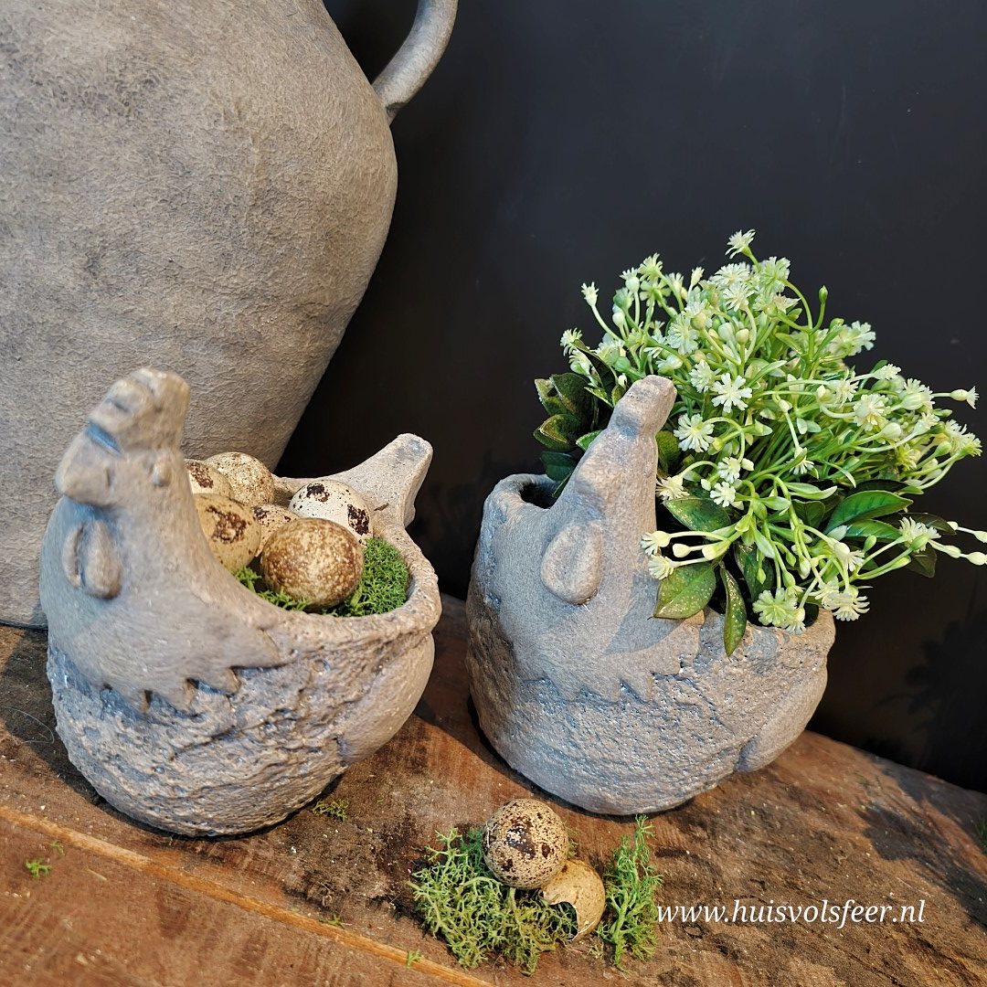 Bloempot Kip Cloe (klein) is een charmant decoratief potje met een speelse, landelijke uitstraling. De zachte grijstint en de rustieke structuur geven dit kipje een natuurlijke look die perfect past bij een voorjaars- of Paasdecoratie. Leuk met een klein plantje, mos of decoratieve eitjes.