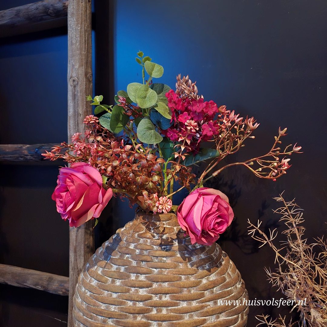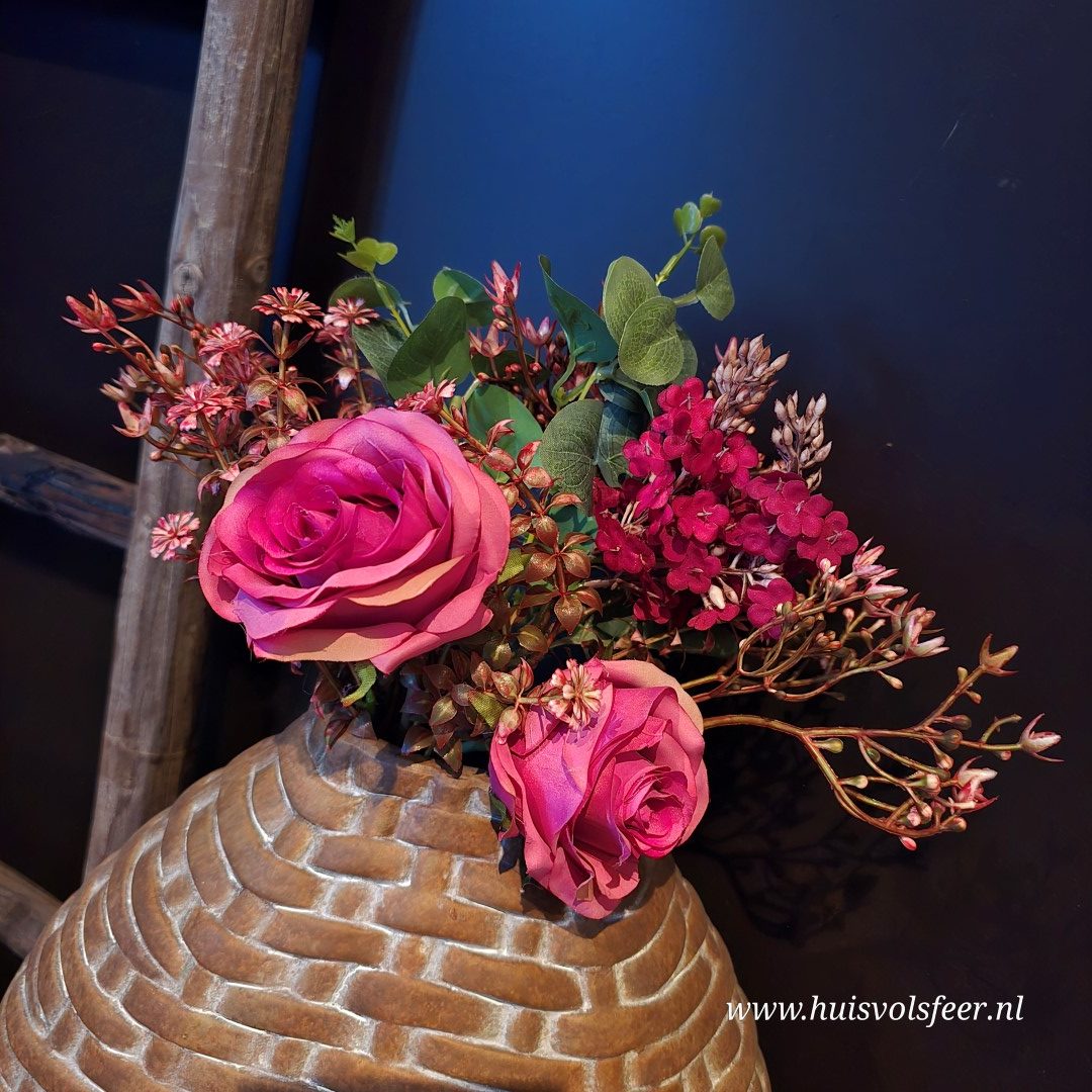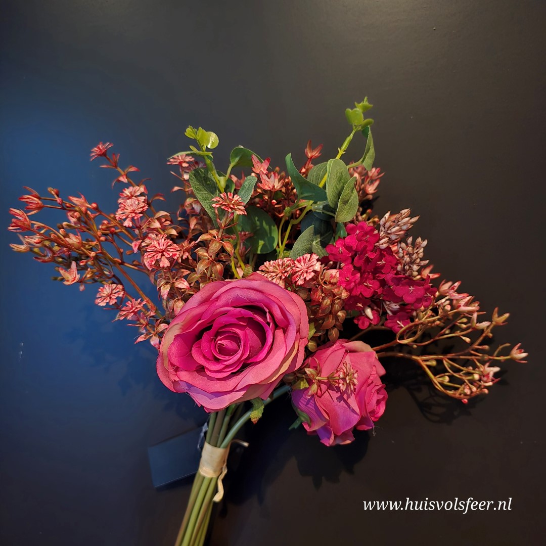 Dit stijlvolle Boeket Beau Fuchsia is een rijk en warm zijdeboeket met diepe fuchsia- en bordeauxtinten, gecombineerd met fris groen. Een echte blikvanger die moeiteloos sfeer brengt in een landelijk, sober of warm interieur. Dankzij de hoogwaardige zijden materialen oogt het boeket levensecht en blijft het het hele jaar door mooi.