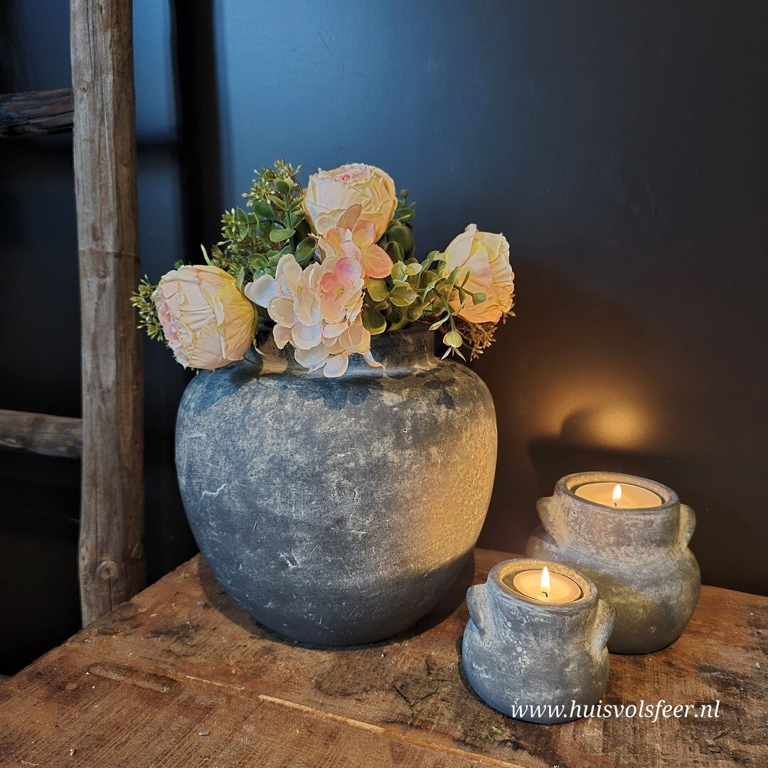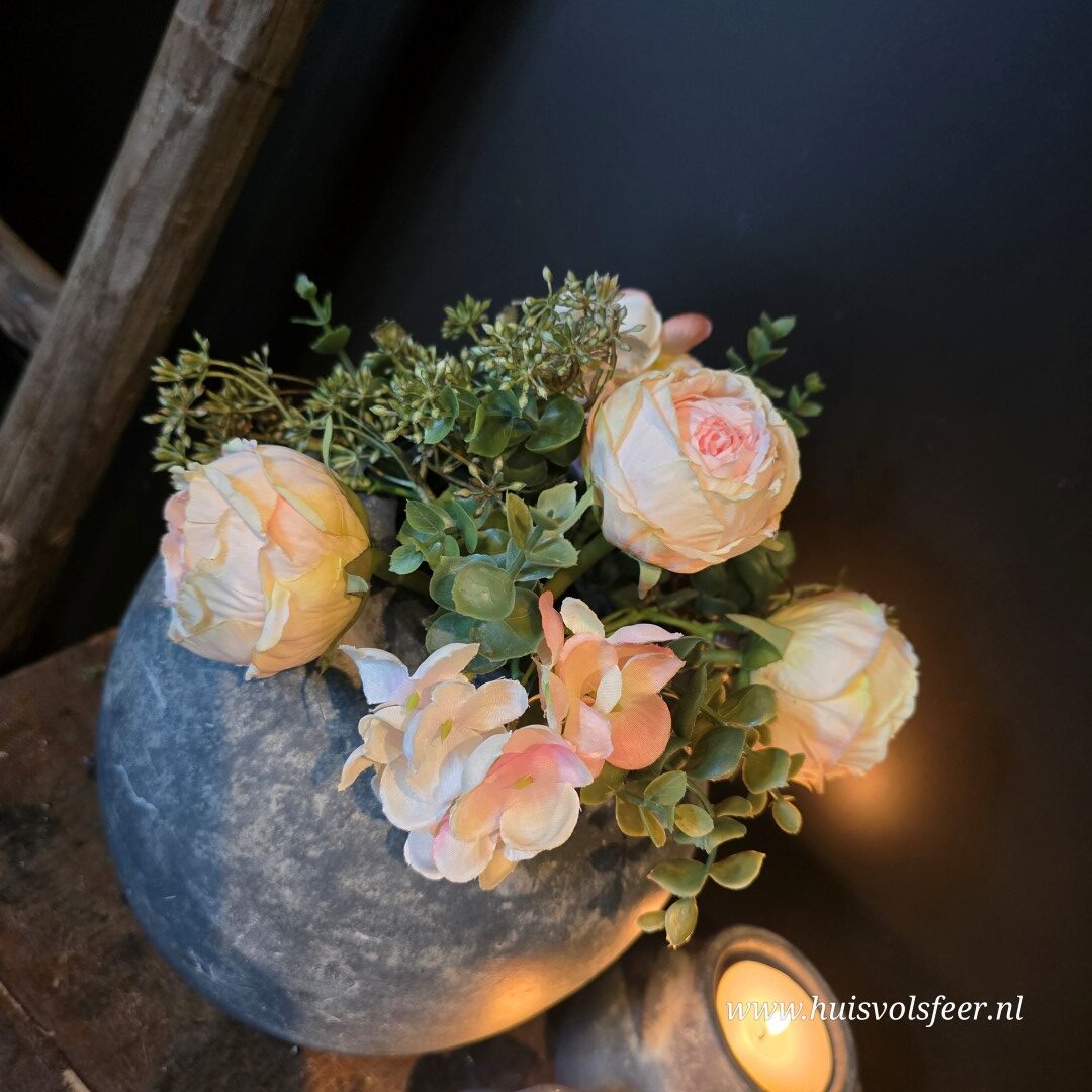 Dit romantische zijden (kunst) boeket geeft direct een warme en landelijke uitstraling aan je interieur. De combinatie van zachte off-white en lichtroze bloemen met groen blad zorgt voor een natuurlijk en stijlvol geheel. Perfect om een pot, kruik of schaal mee te vullen en zo een sfeervol hoekje in huis te creëren.