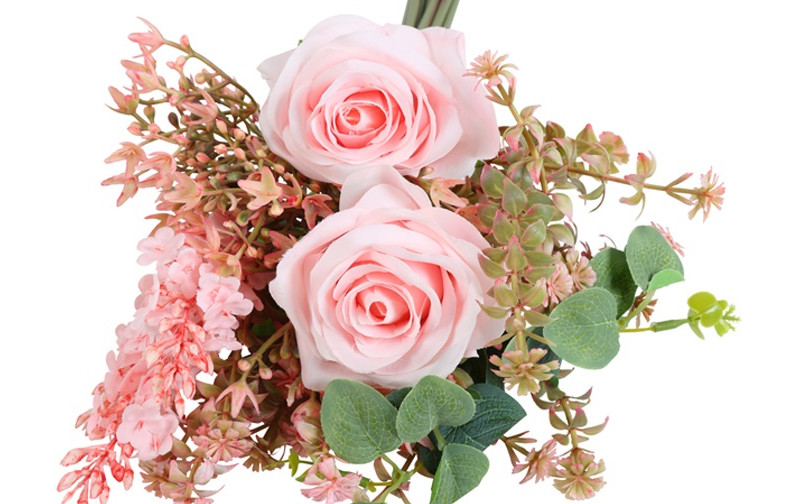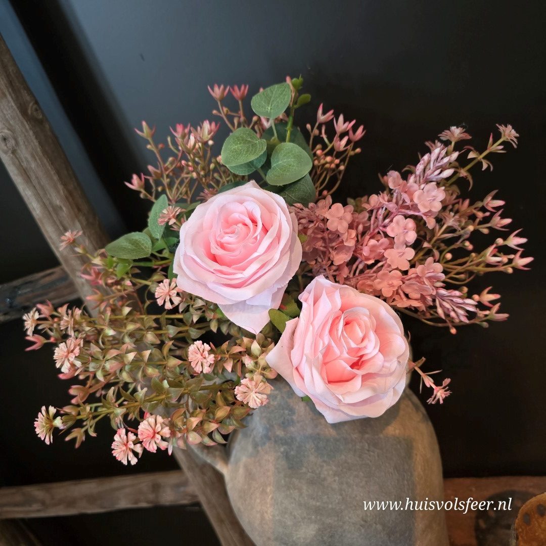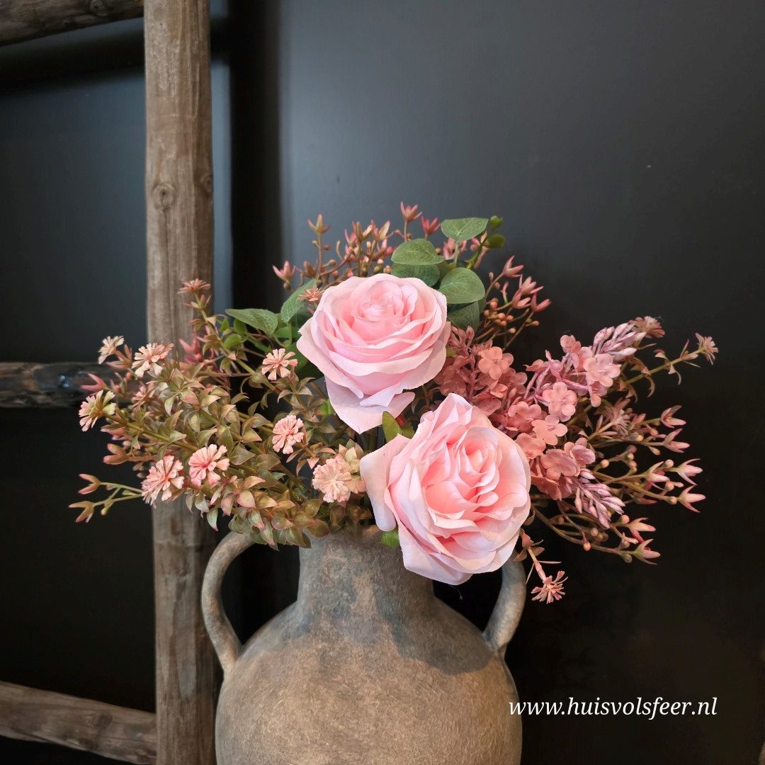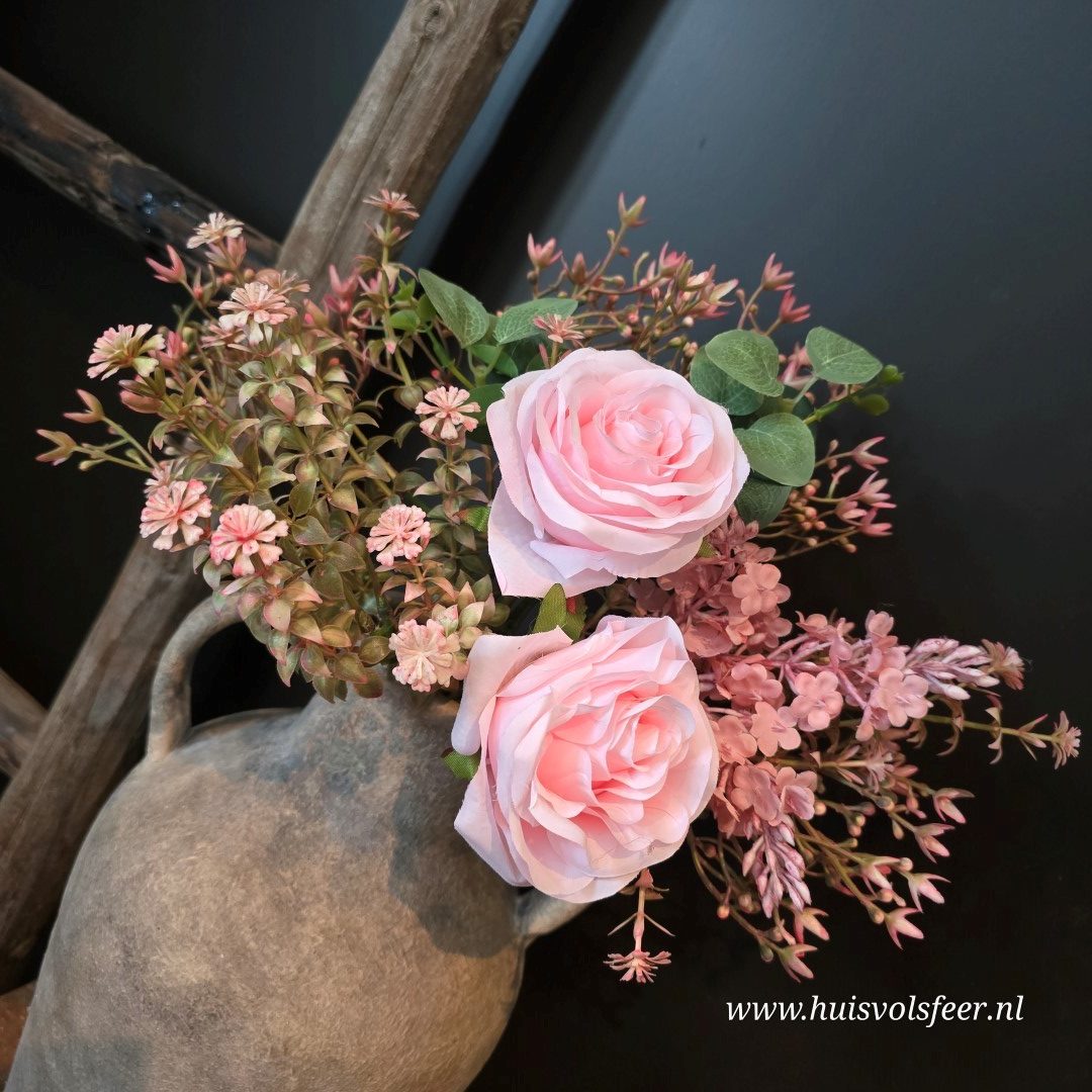Een romantisch en vol zijdeboeket in zachte roze tinten, samengesteld met rozen en fijne wilde bloemetjes. De combinatie van verschillende structuren en groentinten geeft het boeket een natuurlijke, luchtige uitstraling. Perfect om in een kruik, vaas of pot te plaatsen voor een warme en sfeervolle touch in huis.