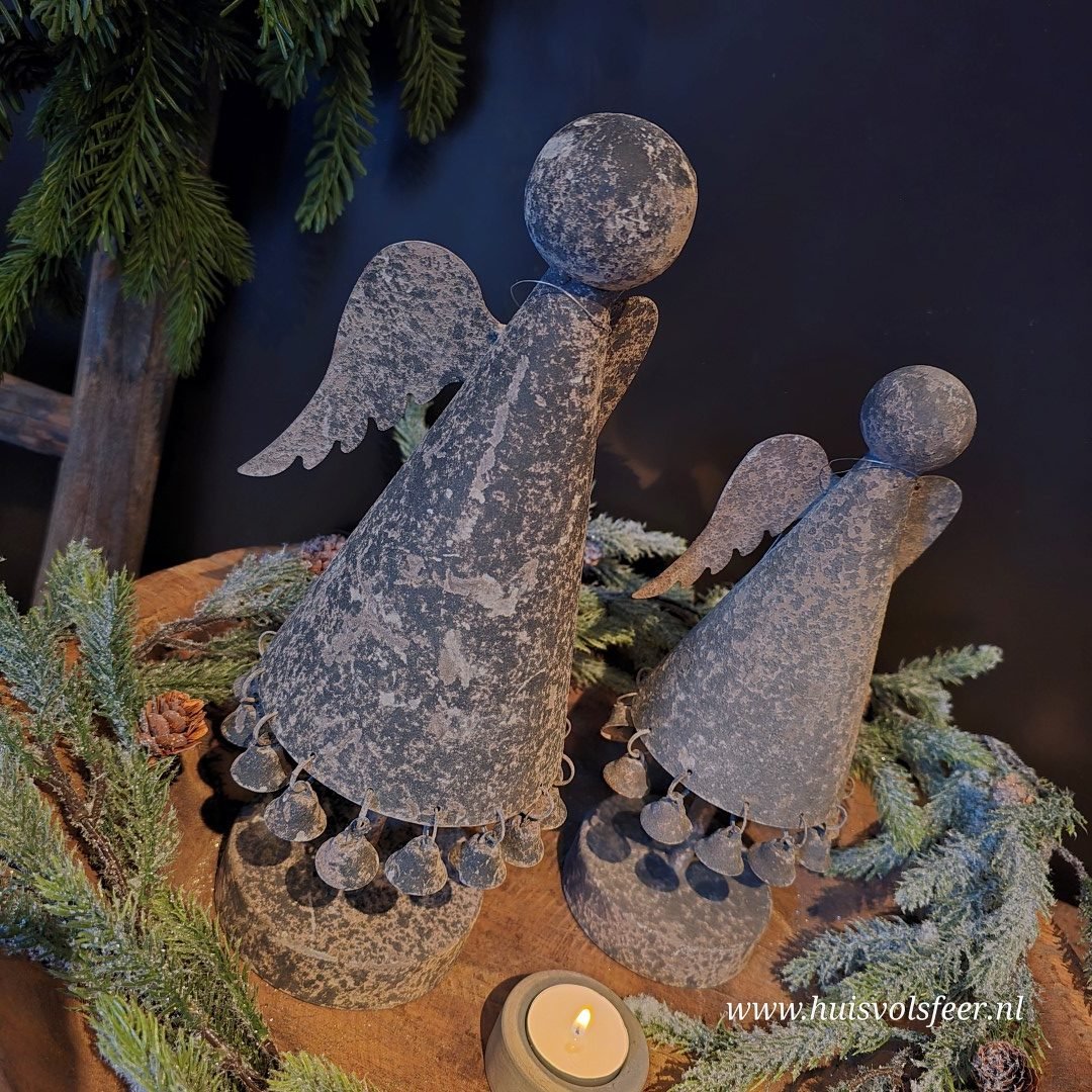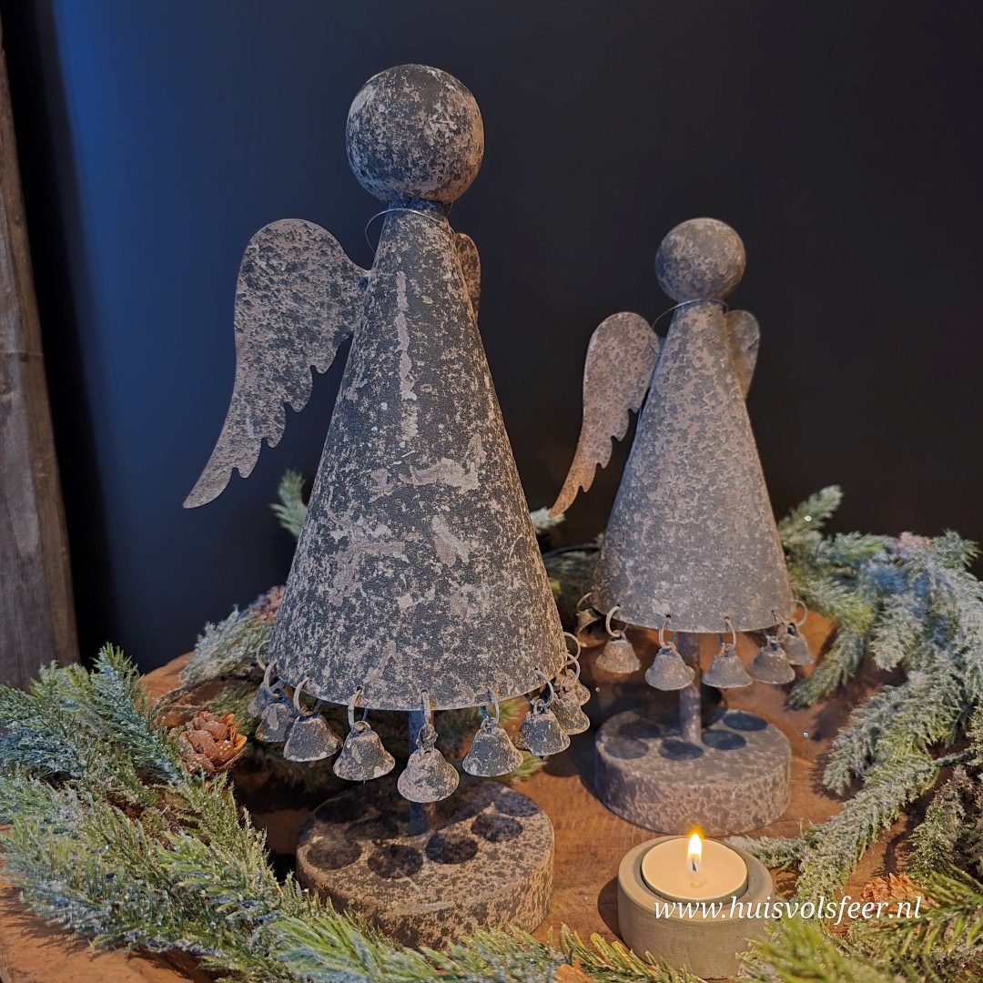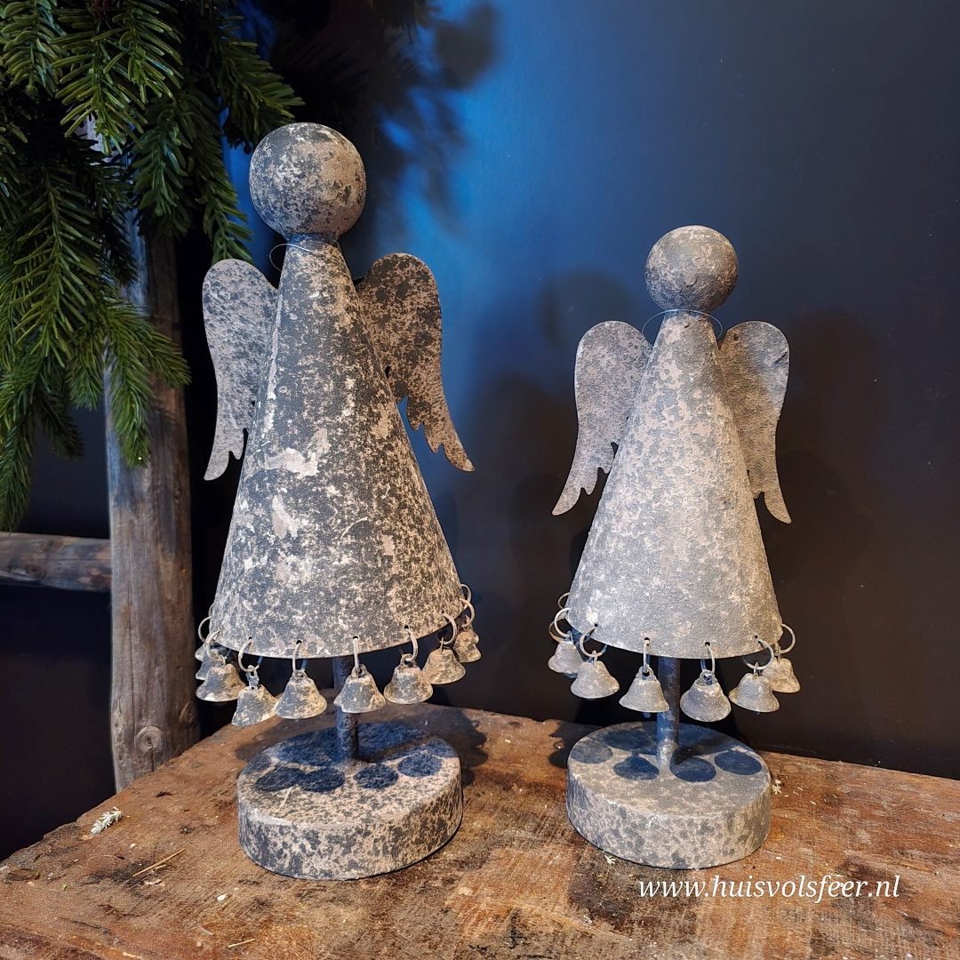 De engel heeft een verweerde Old Grey kleur en is versierd met kleine belletjes aan de jurk, wat zorgt voor een subtiel speels en warm effect. Dankzij het robuuste design past dit item perfect binnen een landelijke, sobere of industriële woonstijl.