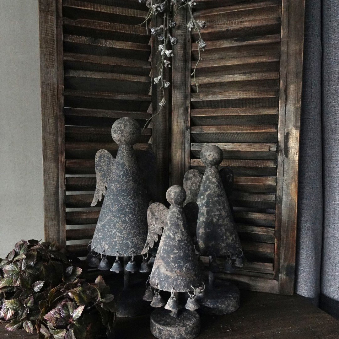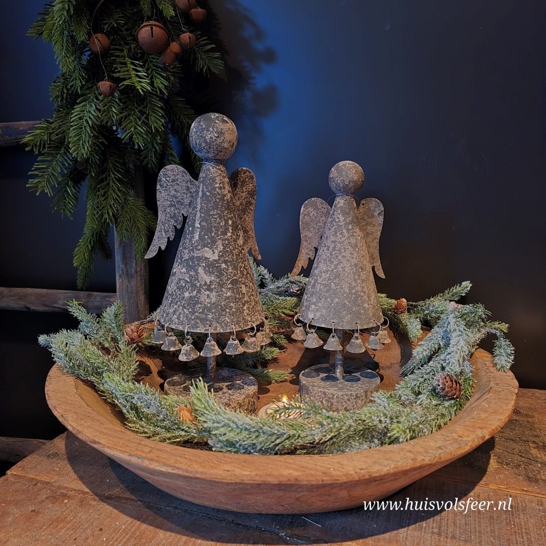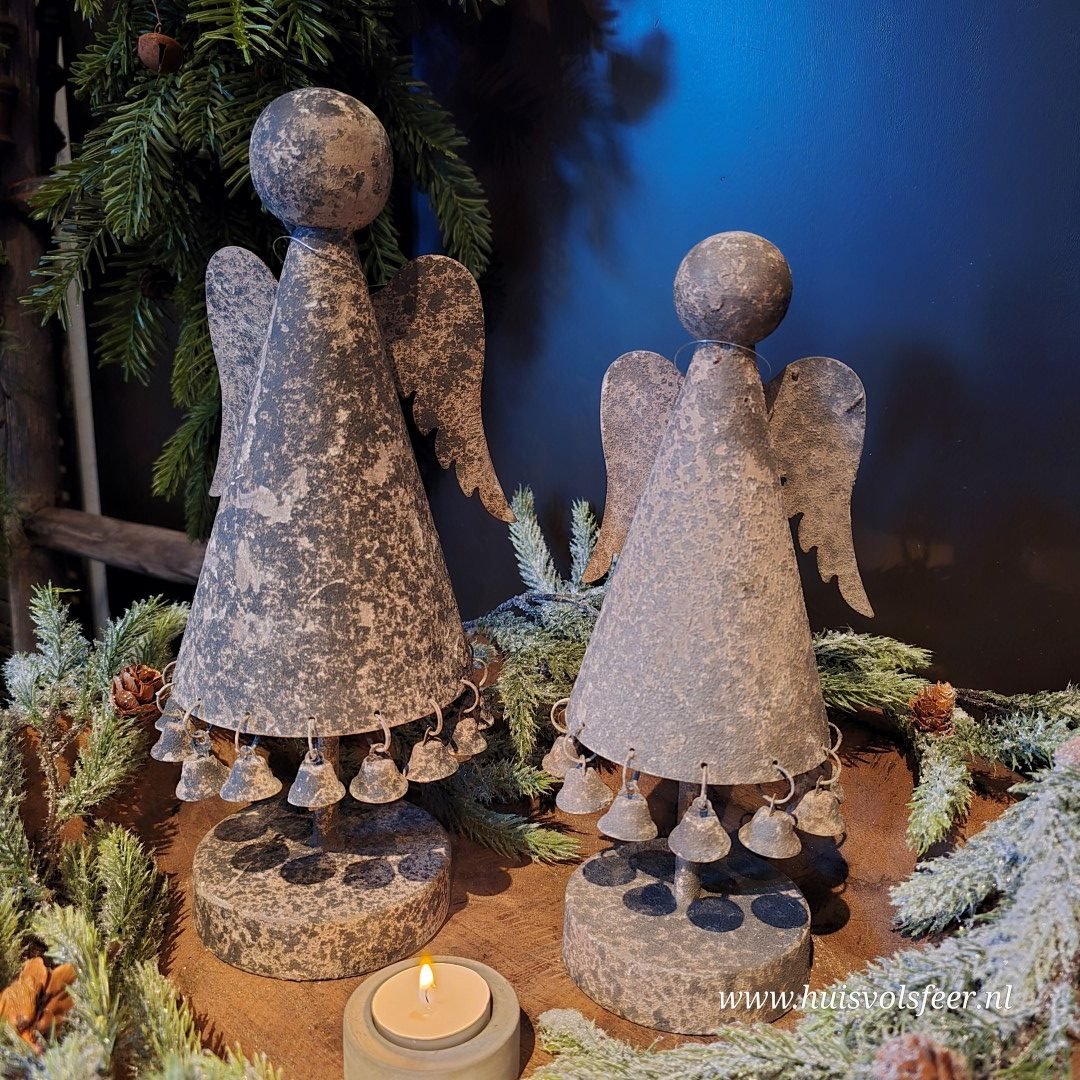 De engel heeft een verweerde Old Grey kleur en is versierd met kleine belletjes aan de jurk, wat zorgt voor een subtiel speels en warm effect. Dankzij het robuuste design past dit item perfect binnen een landelijke, sobere of industriële woonstijl.