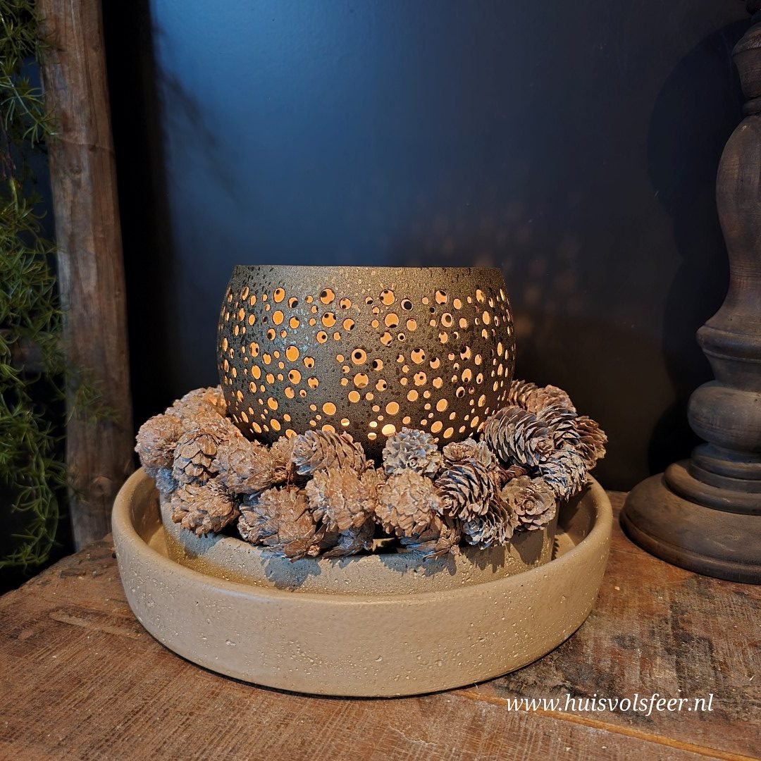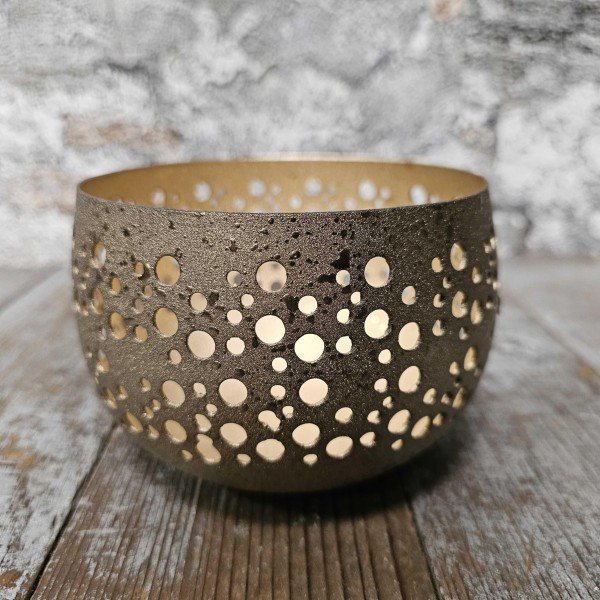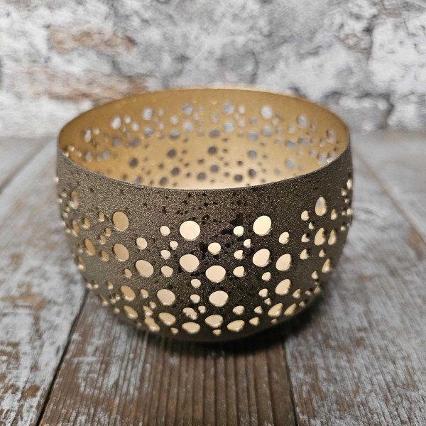 Gemaakt van aluminium in een subtiele goudkleurige afwerking, met speelse ronde openingen die het kaarslicht sfeervol laten doorschijnen. Het lichtspel creëert een prachtige gloed op tafel of dressoir – perfect voor lange avonden vol sfeer.