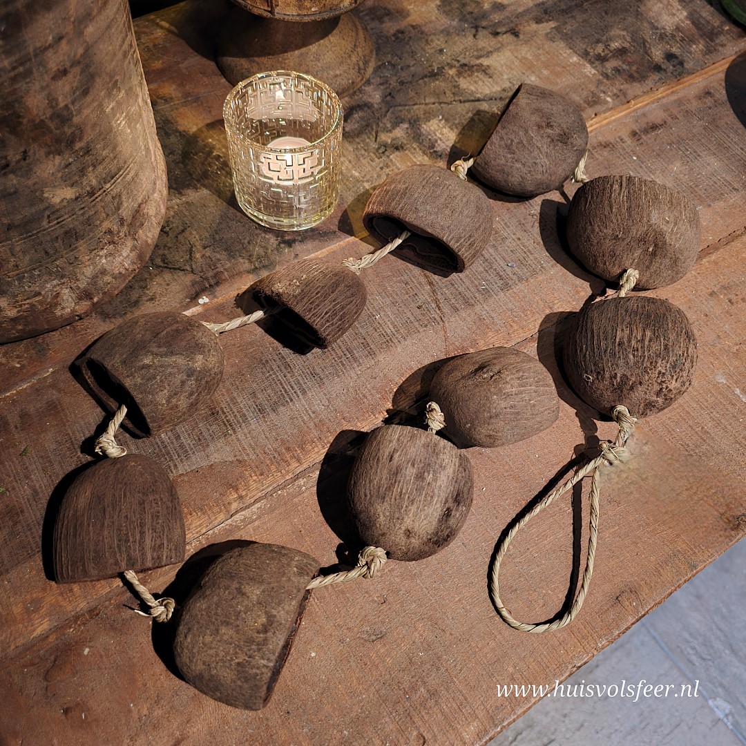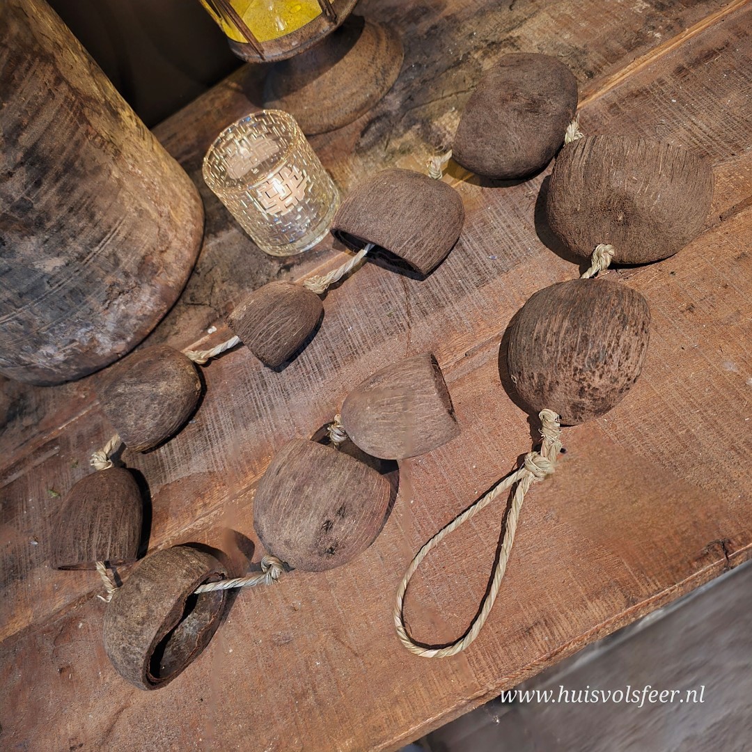 Prachtige natuurlijke guirlande van Palm Pod (kokosnoten) in een warme, sobere tint. De open kokosvormen geven deze slinger een stoere en pure uitstraling.