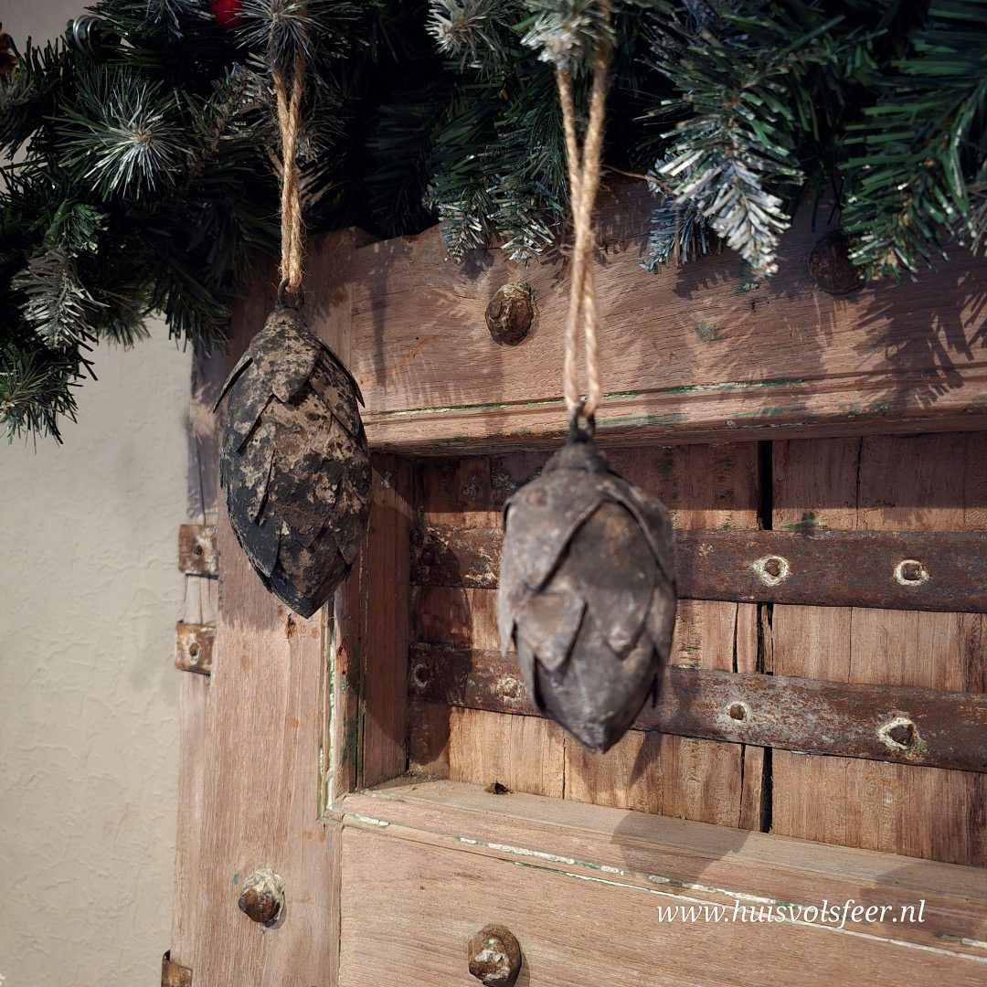 Het verweerde, matte metaal geeft dit ornament een stoere, authentieke uitstraling—perfect passend binnen een sober, doorleefd interieur.