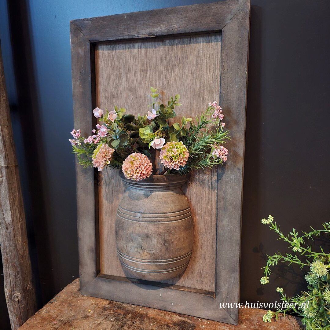 Dit houten wandbord met kruik is gevuld met een vrolijk boeketje van dahlia en pompom, gecombineerd met groen voor een frisse en natuurlijke uitstraling. De ronde bloemvormen geven het wandbord een speels karakter, terwijl het hout zorgt voor rust en warmte.
