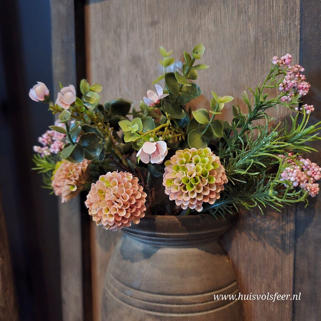 Materiaal: hout, kruik, zijden bloemen en takken