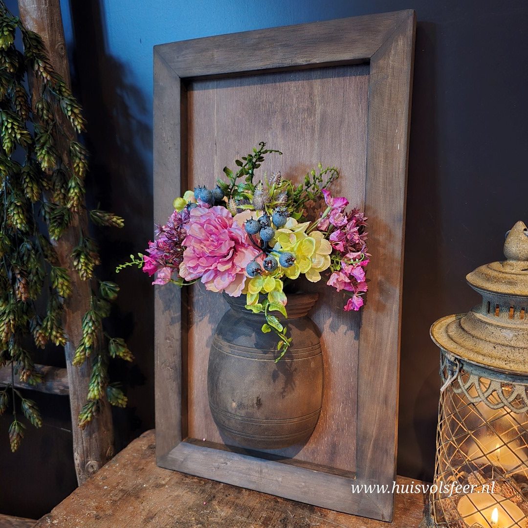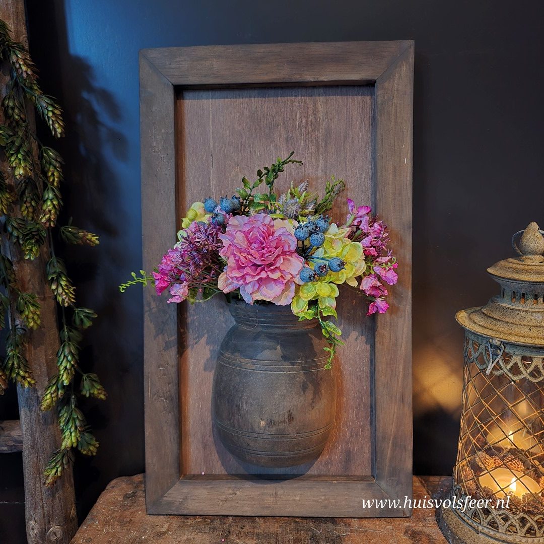 Materiaal: hout, kruik, zijden bloemen en takken