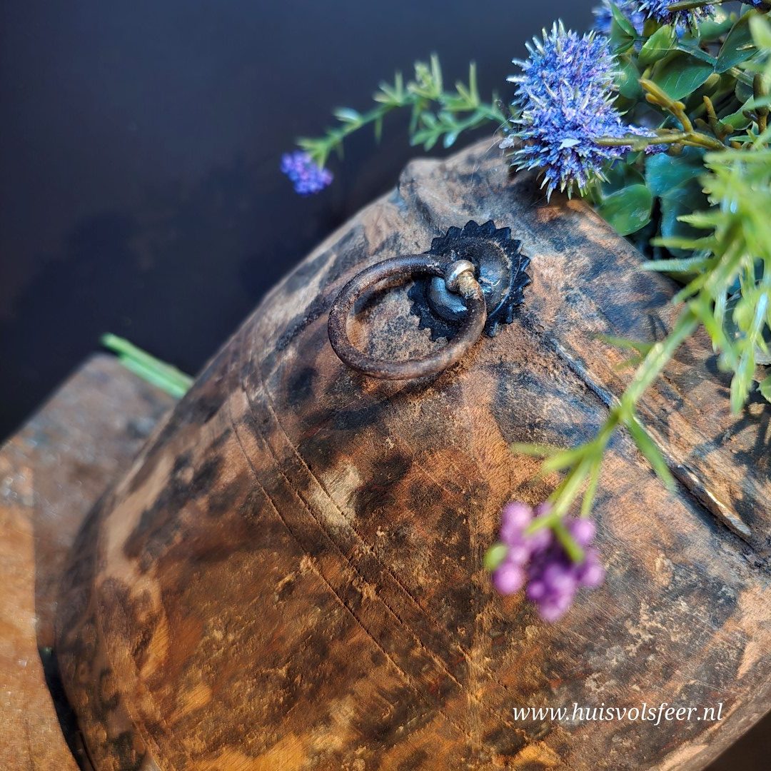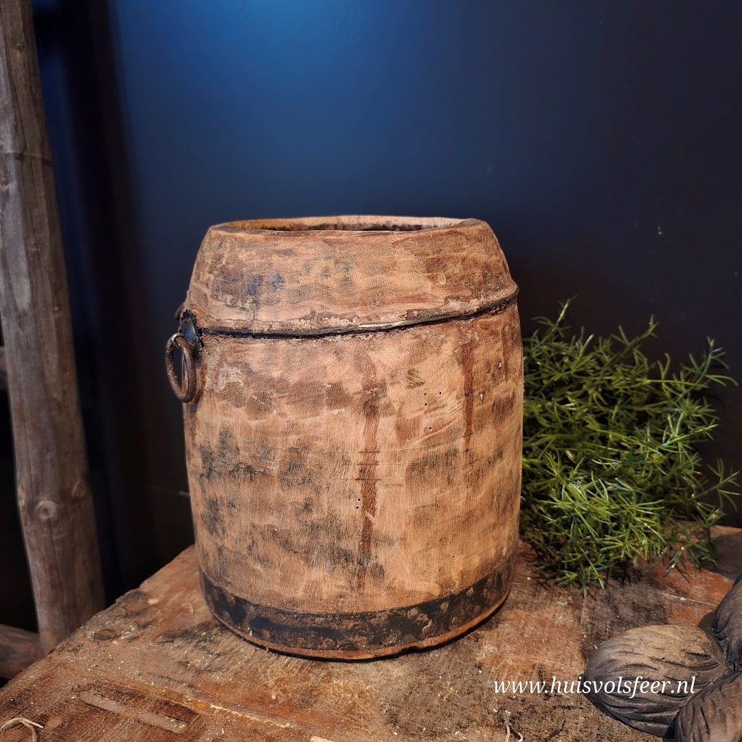 Deze authentieke Payaly pot is een karaktervol en doorleefd item met een warme, landelijke uitstraling. De pot is volledig van hout gemaakt en voorzien van originele details, zoals de metalen ring en verweerde afwerking. Sporen van gebruik en leeftijd geven dit stuk zijn unieke charme.