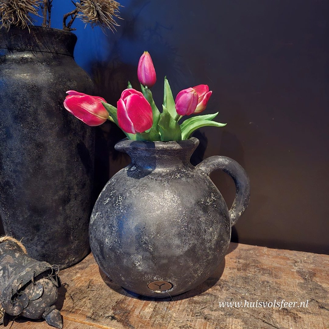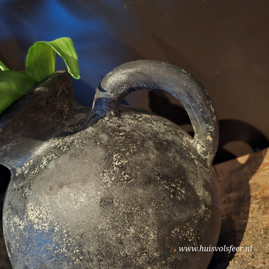 Stoere bolvormige jug vaas met één oor in de herkenbare basaltkleur van Brynxz. De robuuste afwerking en doorleefde uitstraling geven deze vaas een krachtig, landelijk karakter en maken hem een echte sfeermaker in elk interieur.