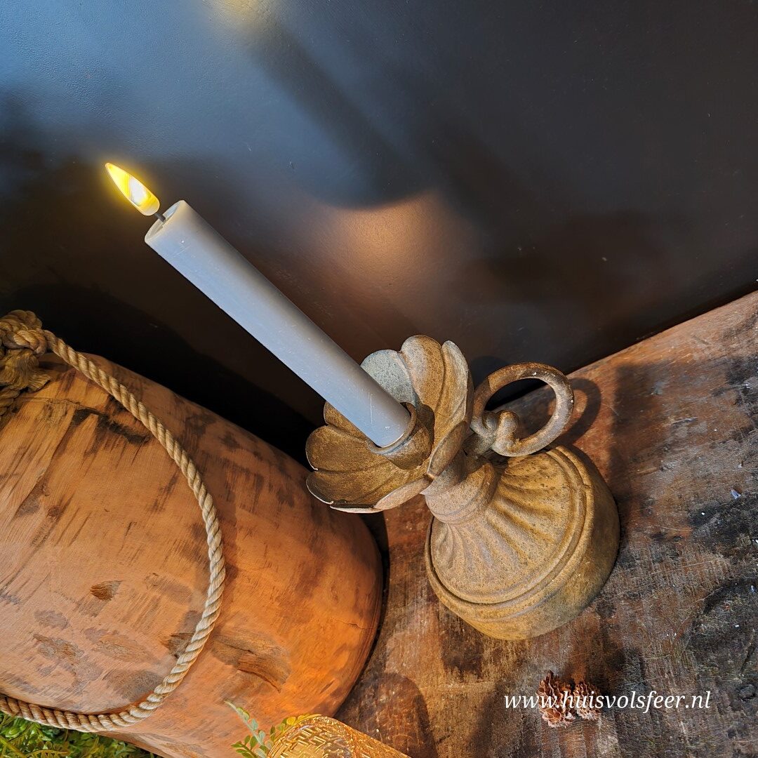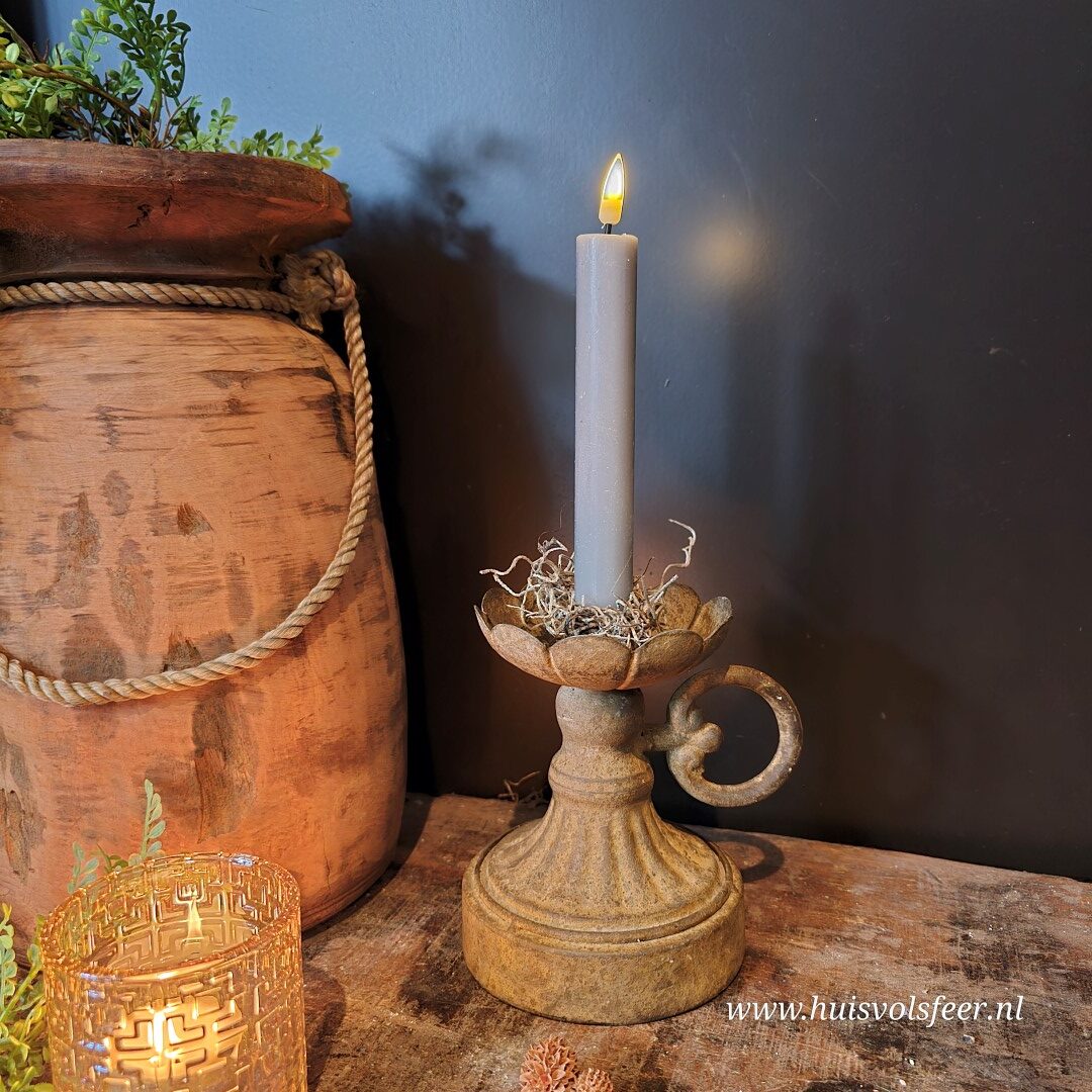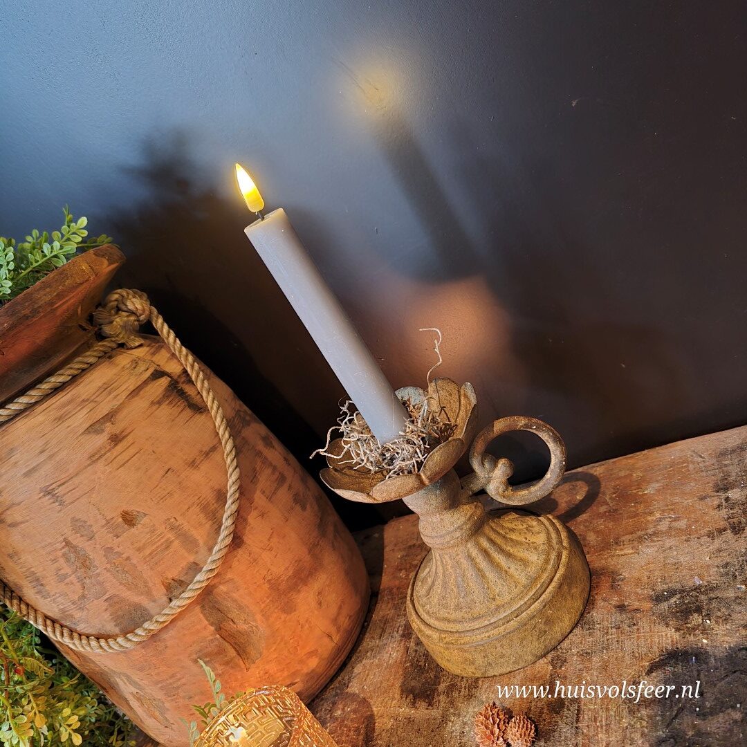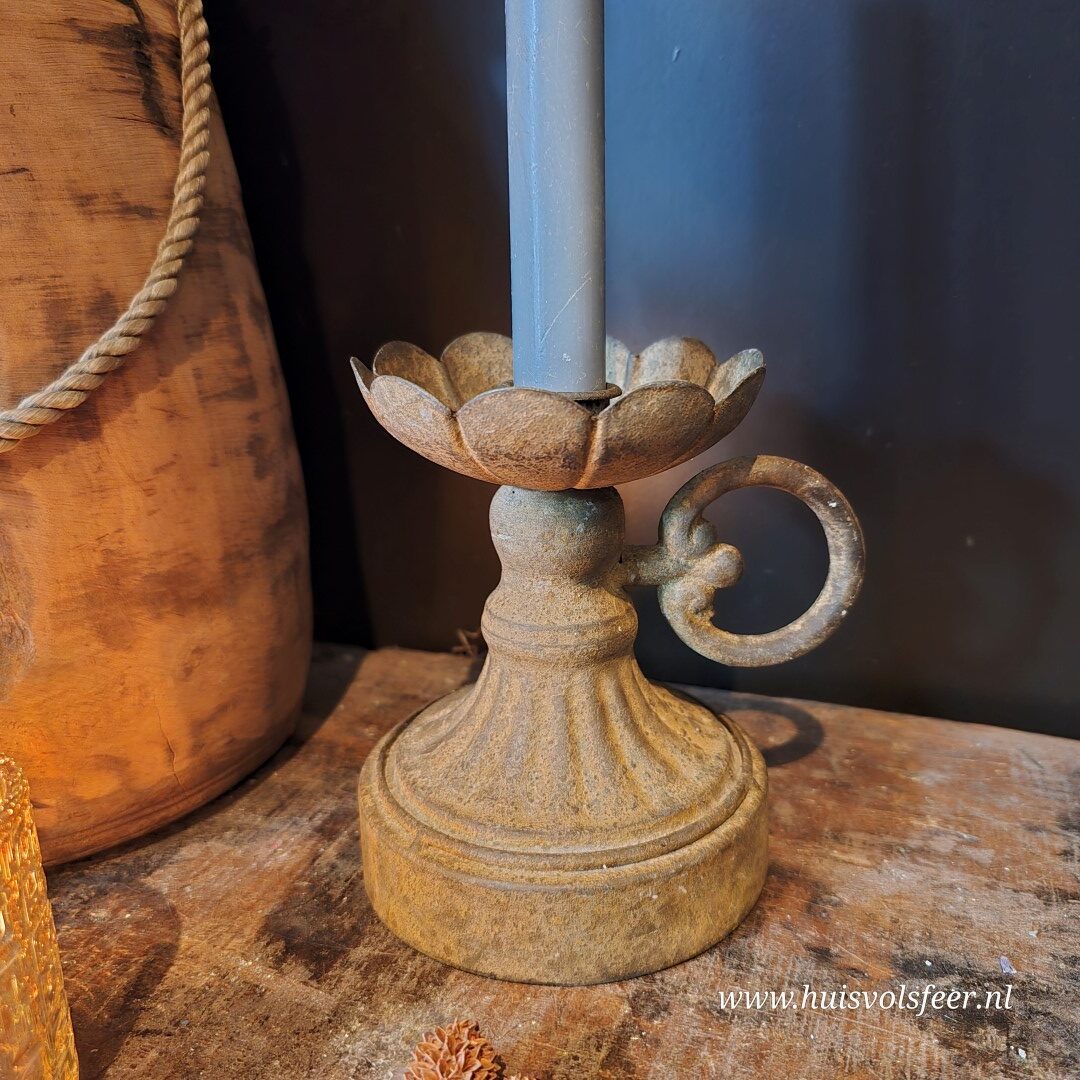Deze roestkleurige kandelaar heeft een stoere en landelijke uitstraling. De doorleefde afwerking en sierlijke vorm geven het geheel een warm en karaktervol effect dat perfect past binnen een landelijk of sober interieur.