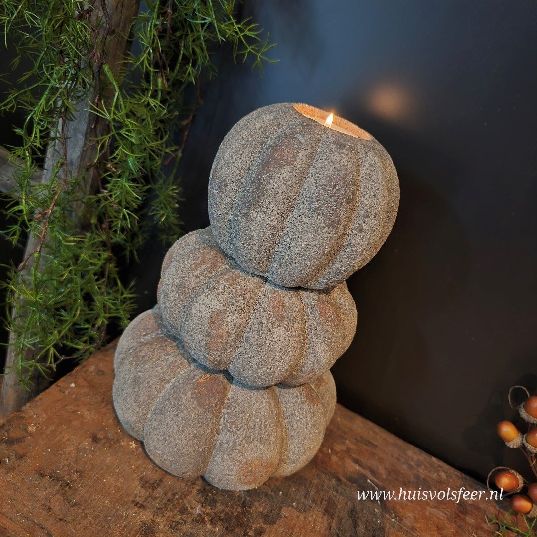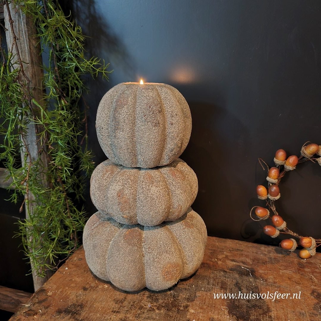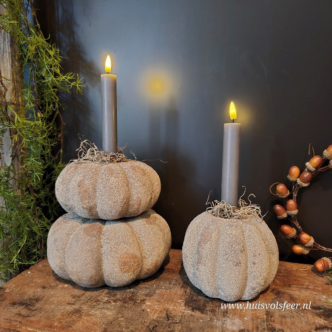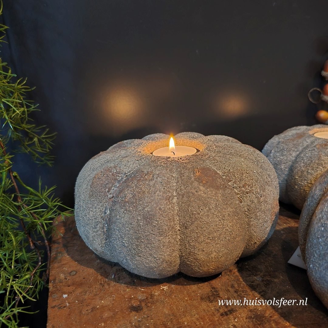 De grootste uit de Pumpkin-serie is een echte sfeermaker. Deze stoere kandelaar van zwaar, verweerd steen is perfect als basisstuk in een sfeervolle setting. Combineer hem met de andere Pumpkin-formaten voor een speels gestapeld effect of zet hem solitair neer als blikvanger. Geschikt voor waxinelichtjes of een dinerkaars. Ook prachtig met een beetje Tillandsia of decoratief mos.