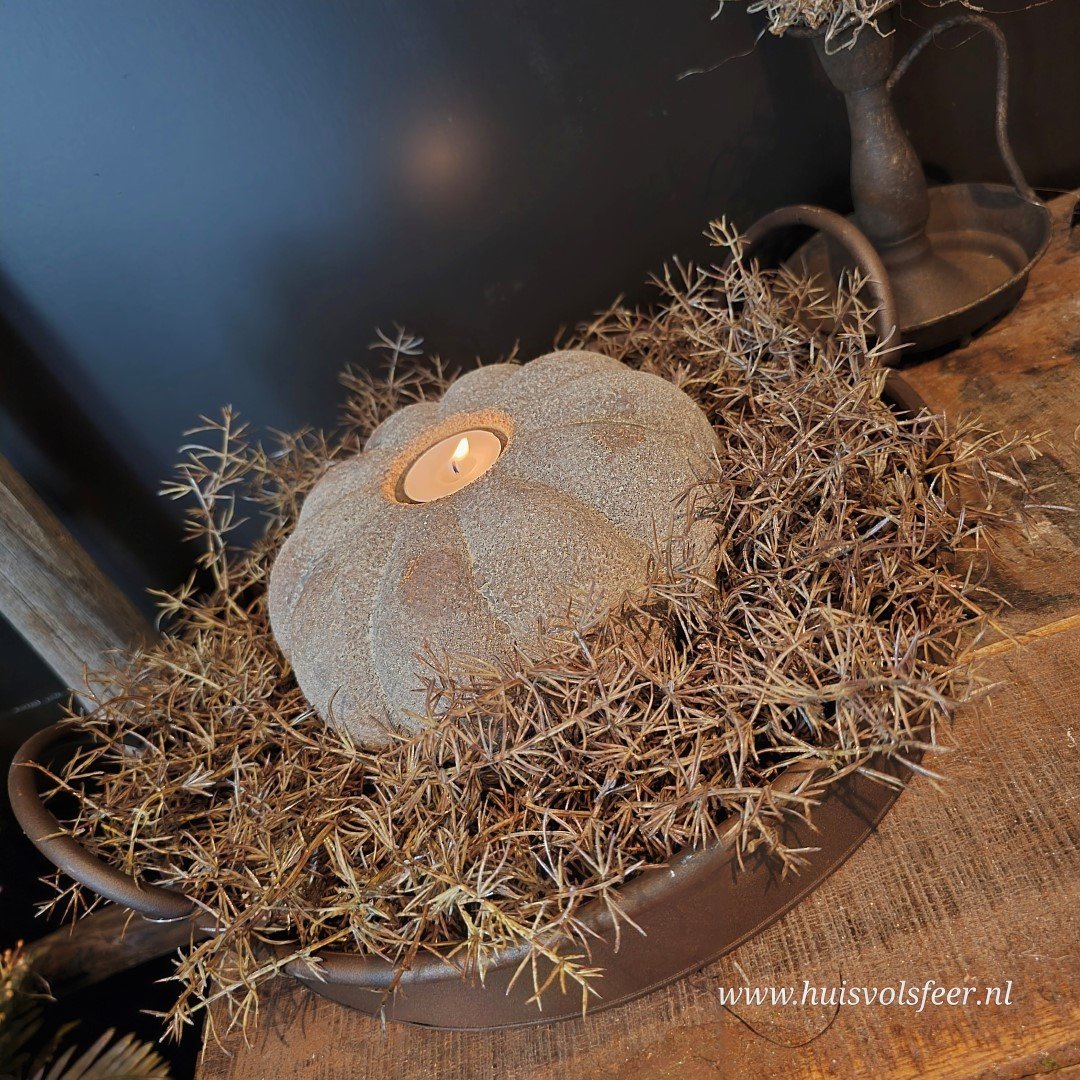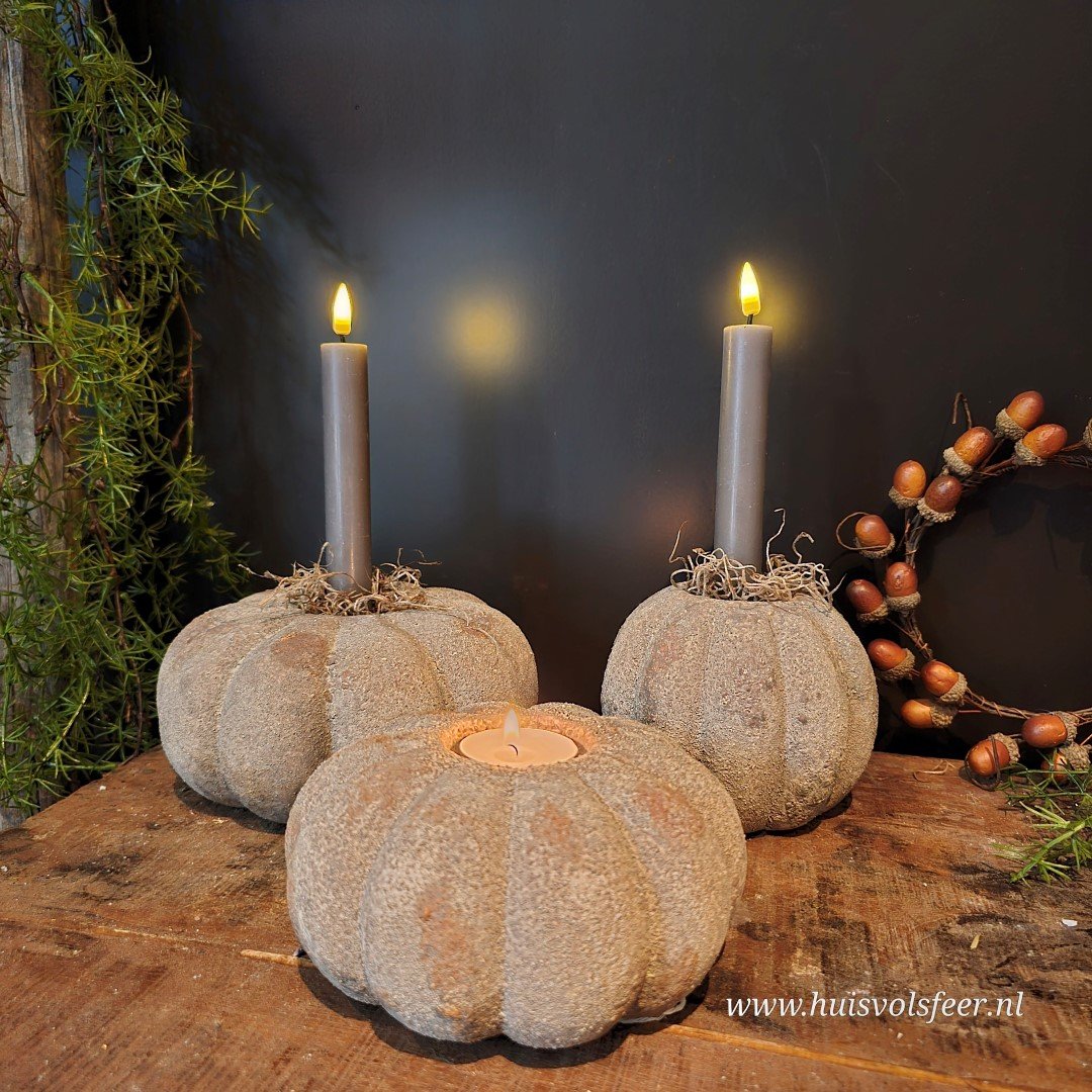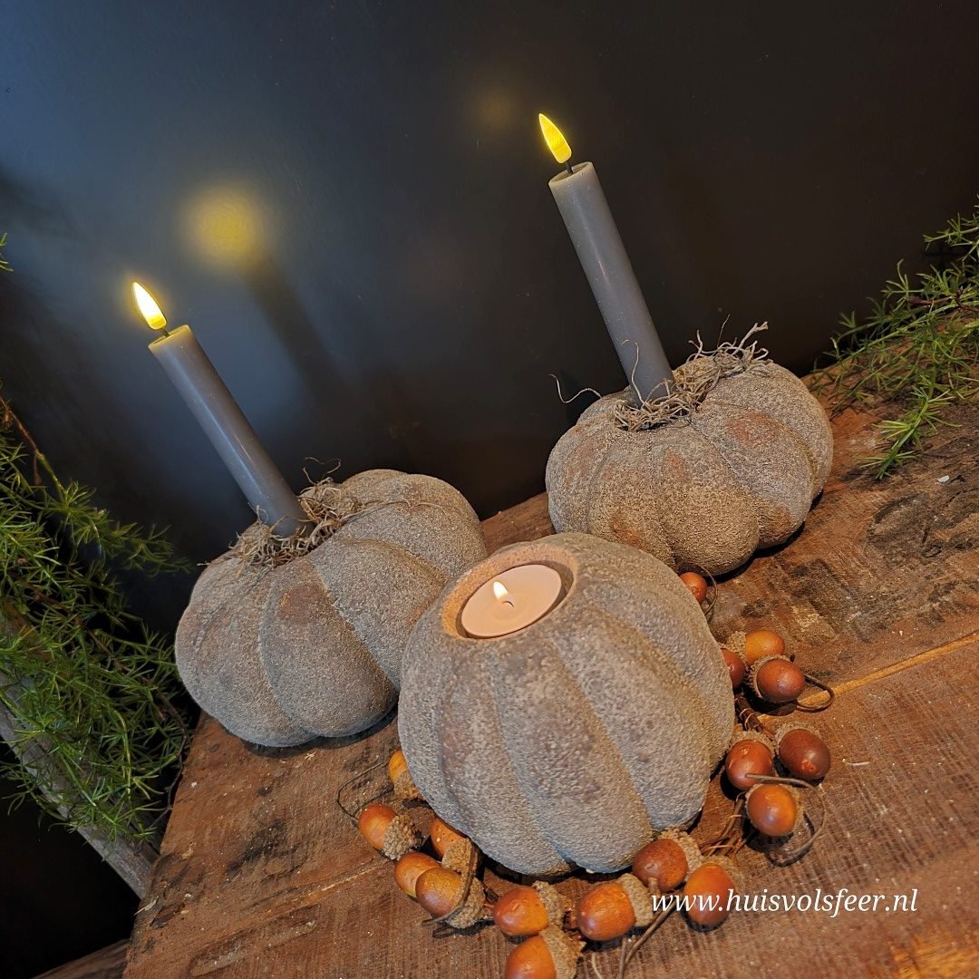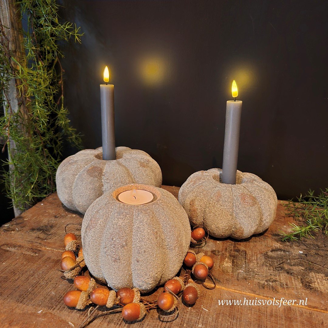 De grootste uit de Pumpkin-serie is een echte sfeermaker. Deze stoere kandelaar van zwaar, verweerd steen is perfect als basisstuk in een sfeervolle setting. Combineer hem met de andere Pumpkin-formaten voor een speels gestapeld effect of zet hem solitair neer als blikvanger. Geschikt voor waxinelichtjes of een dinerkaars. Ook prachtig met een beetje Tillandsia of decoratief mos.