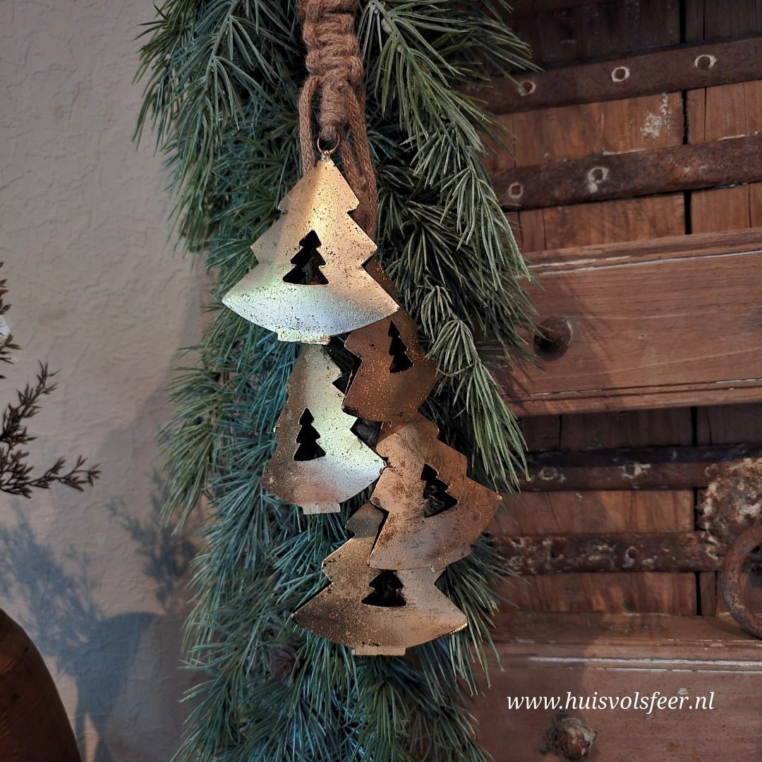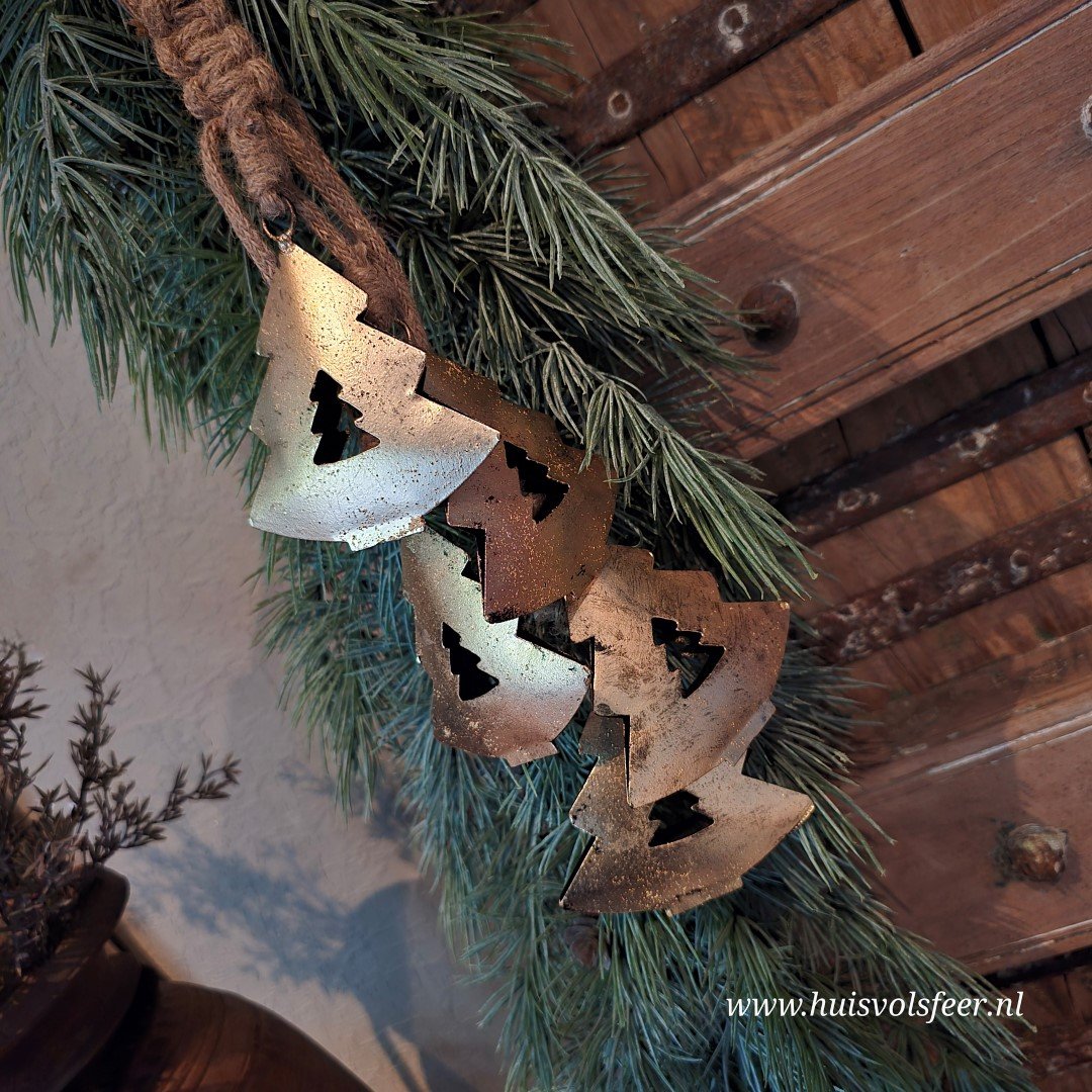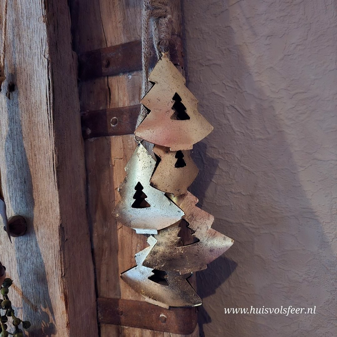 Met zijn speelse vormgeving is deze kerstboom hanger van metaal een echte sfeermaker tijdens de feestdagen. De hanger bestaat uit vijf kerstboompjes in een stoere antiek gouden kleur, bevestigd aan een dik jute touw. De combinatie van metaal en jute zorgt voor een landelijke uitstraling die perfect past bij een robuuste, natuurlijke kerststijl.