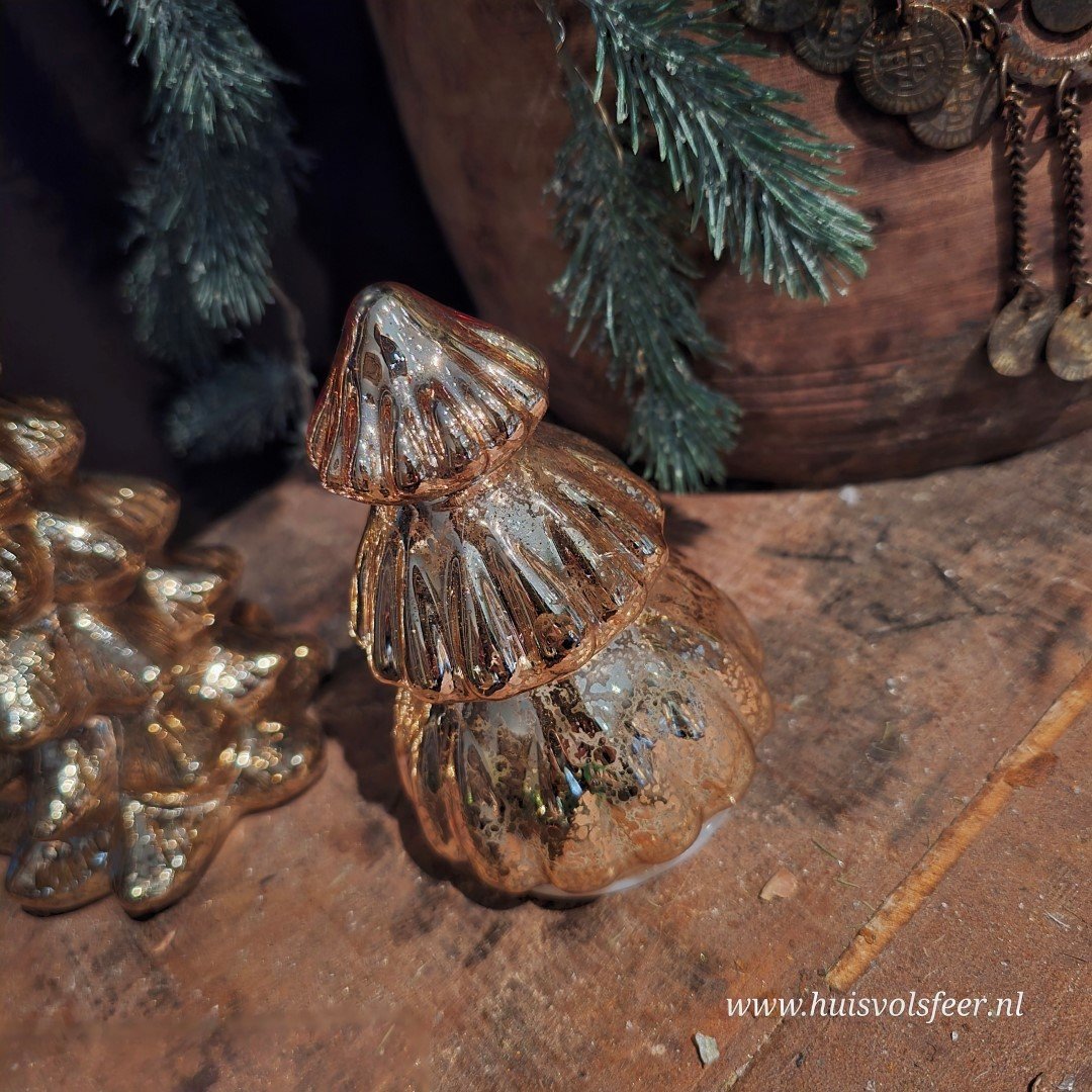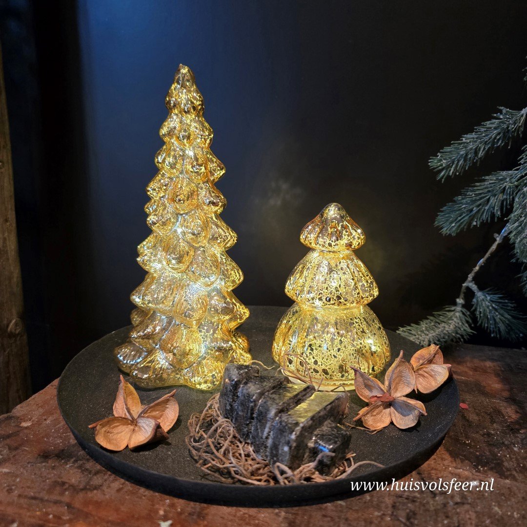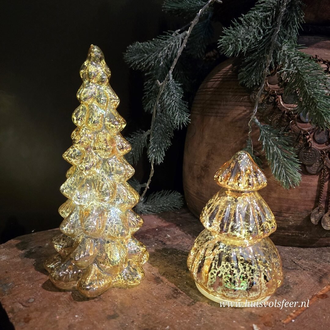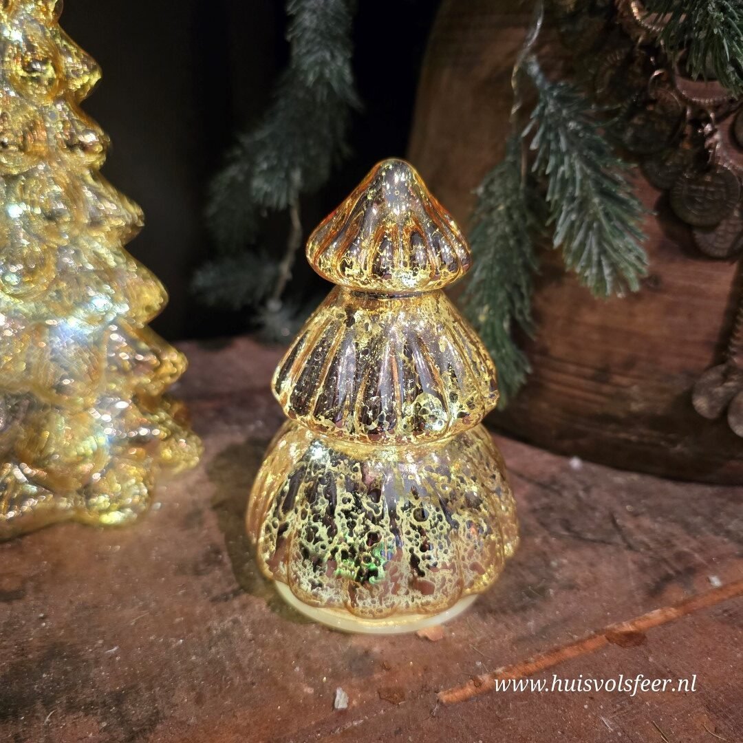 Warme goudkleurige kleur kerstboom van glas. Binnenin heeft de boom led verlichting, welke ook beschikt over een timer.