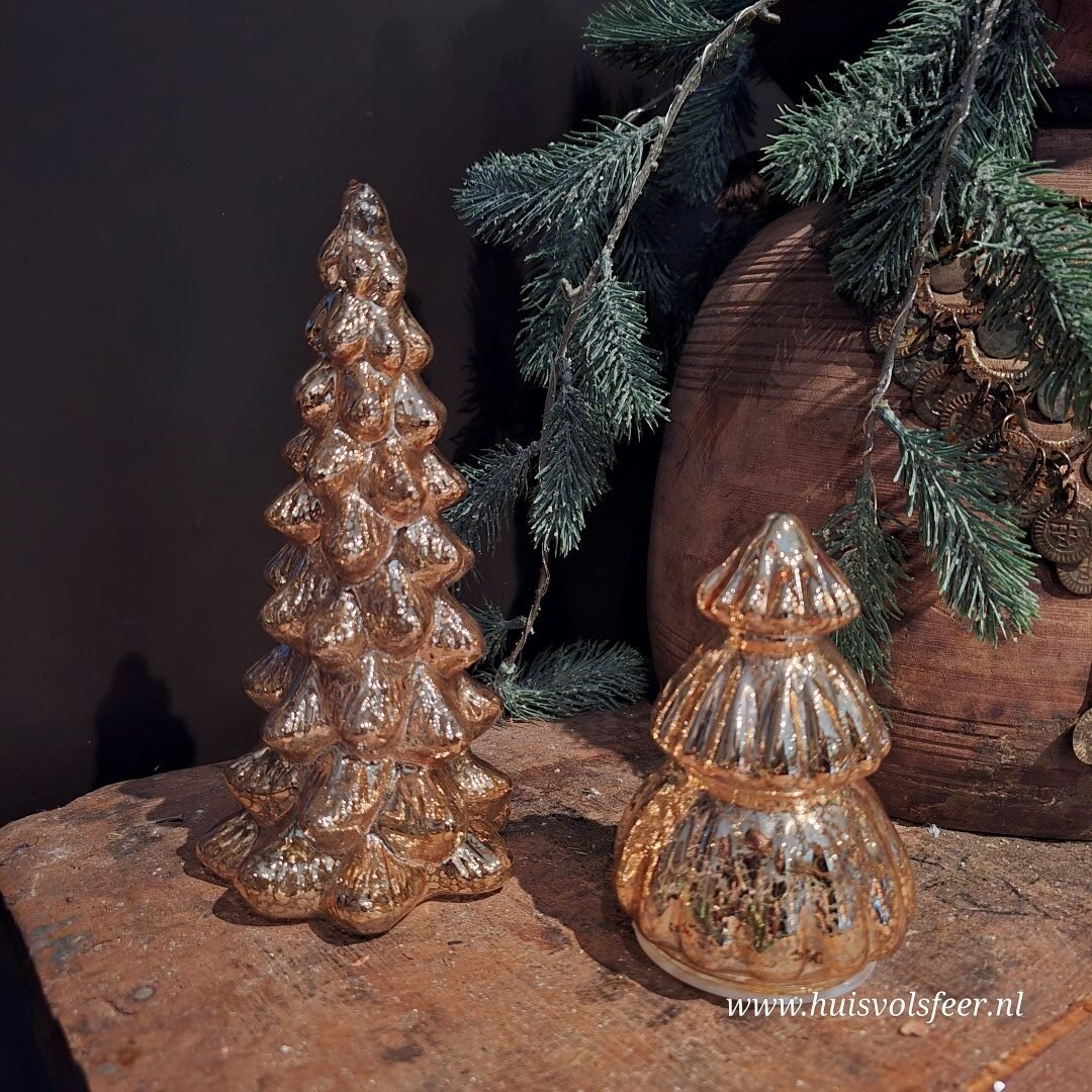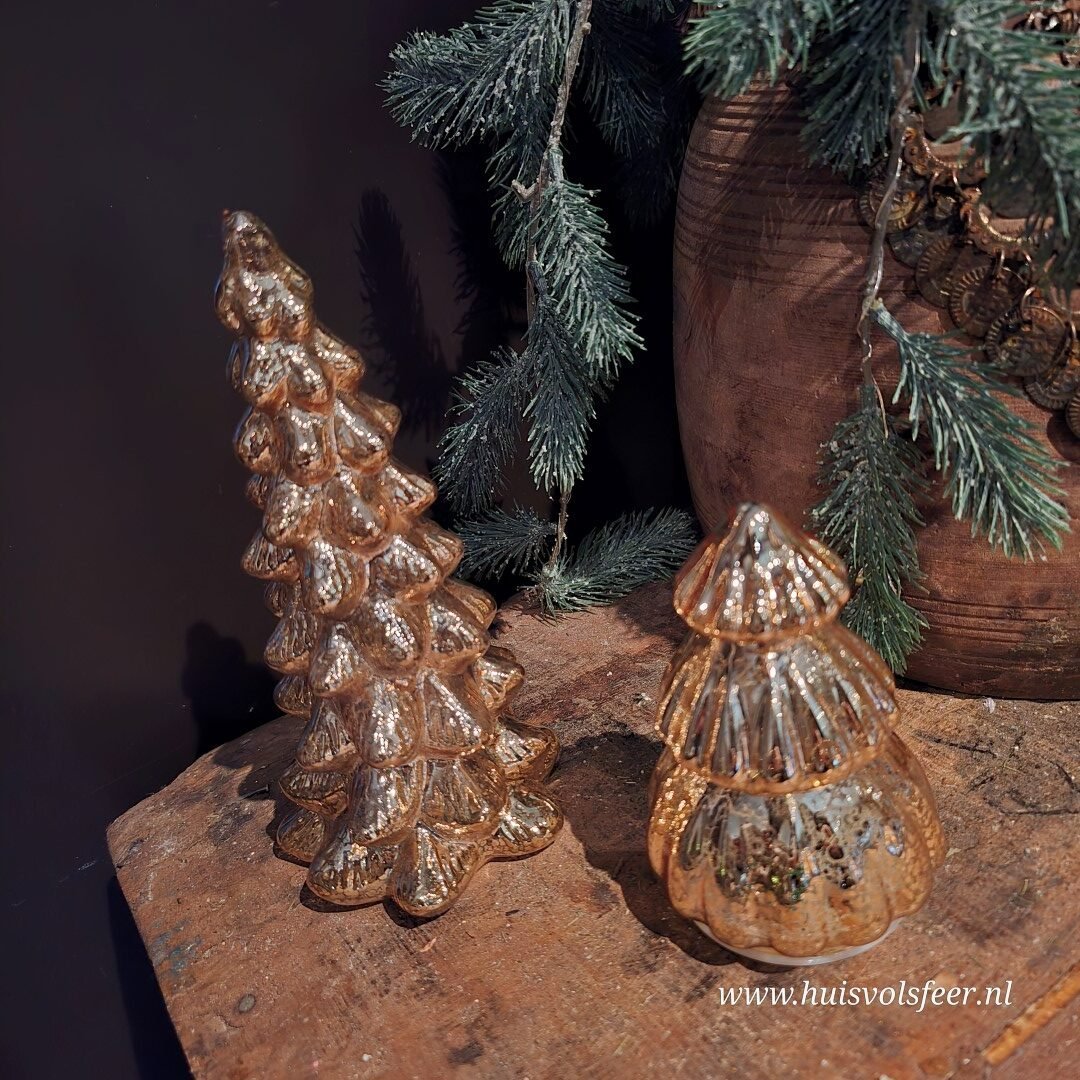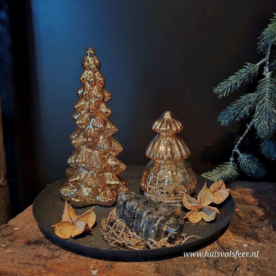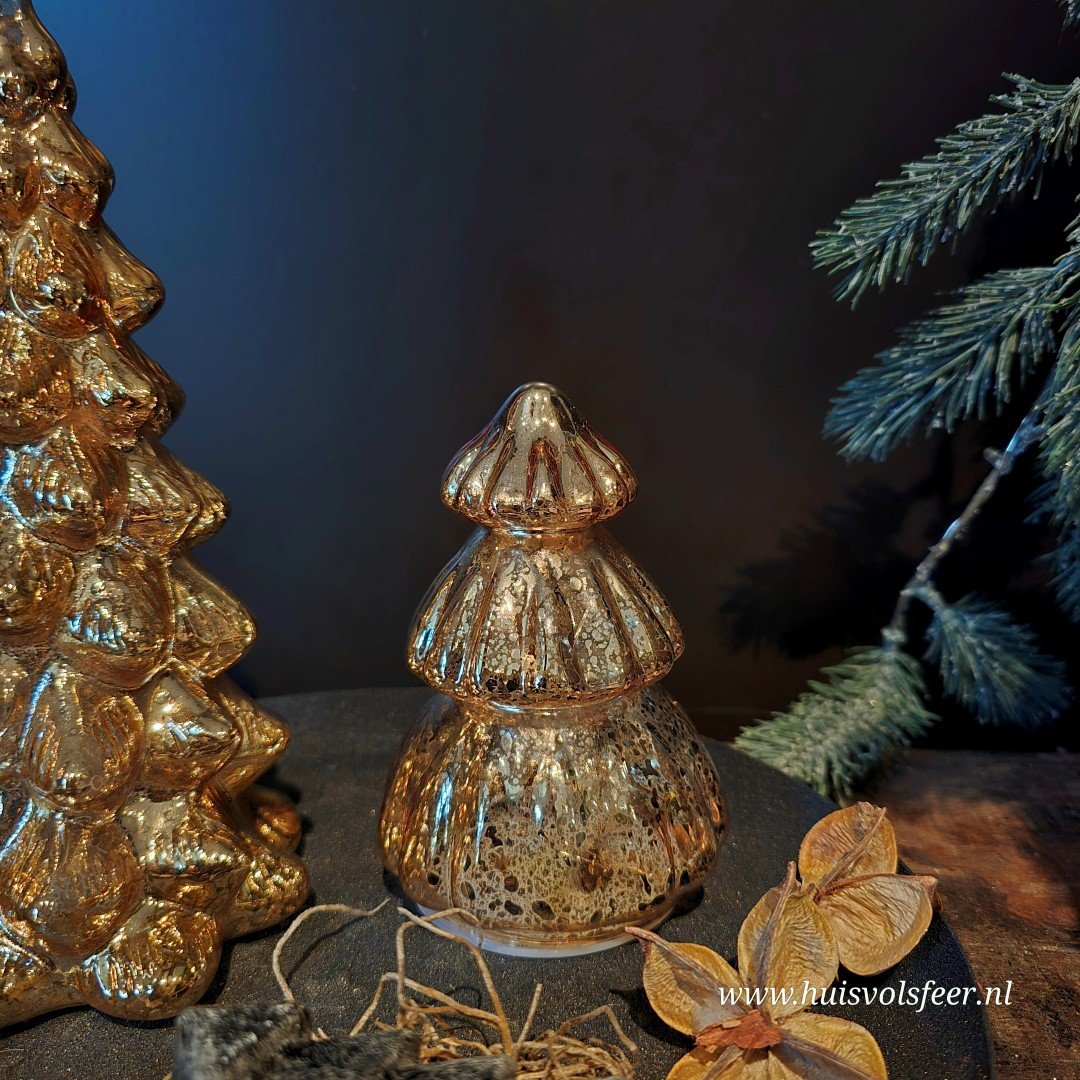 Warme goudkleurige kleur kerstboom van glas. Binnenin heeft de boom led verlichting, welke ook beschikt over een timer.