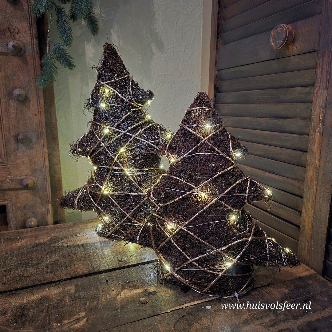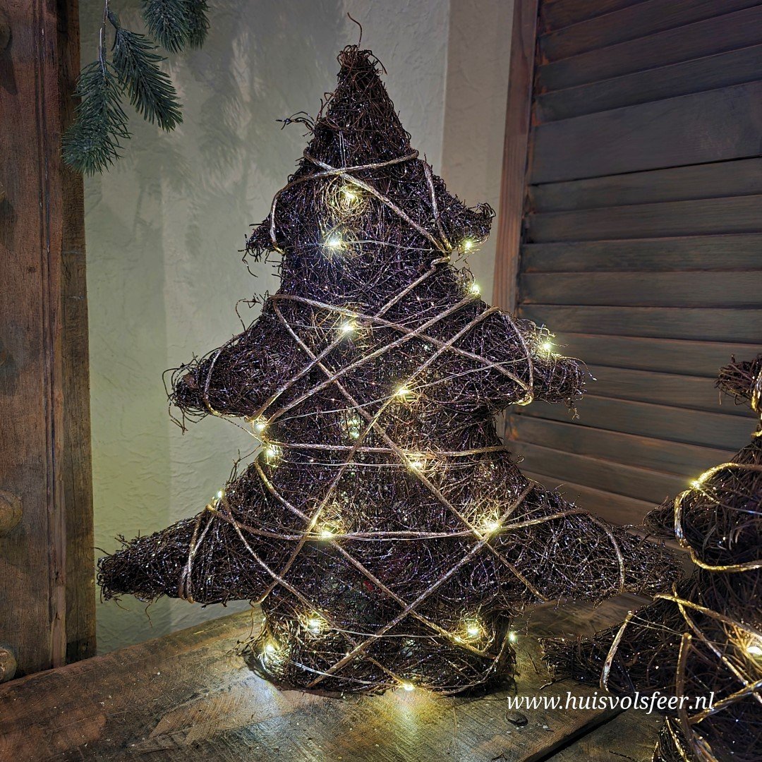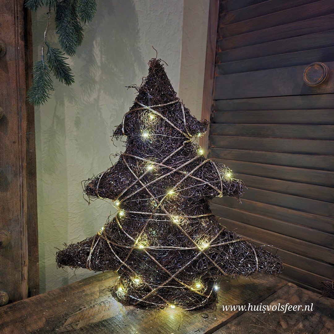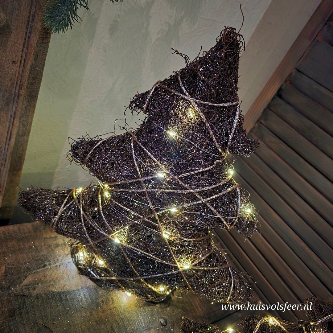 Breng een vleugje natuurlijke elegantie in je kerstdecoratie met deze Decoratieve Boom met LED Verlichting! De boom heeft een authentieke donkerbruine rieten/takjes structuur die wordt benadrukt door een subtiele wikkeling van gouden draad/touw. Deze prachtige combinatie van rustiek en verfijning maakt deze boom een veelzijdige blikvanger in elk interieur. De ingebouwde LED-verlichting met een handige timerfunctie zorgt voor een zachte, warme gloed die perfect aansluit bij de feestelijke sfeer.