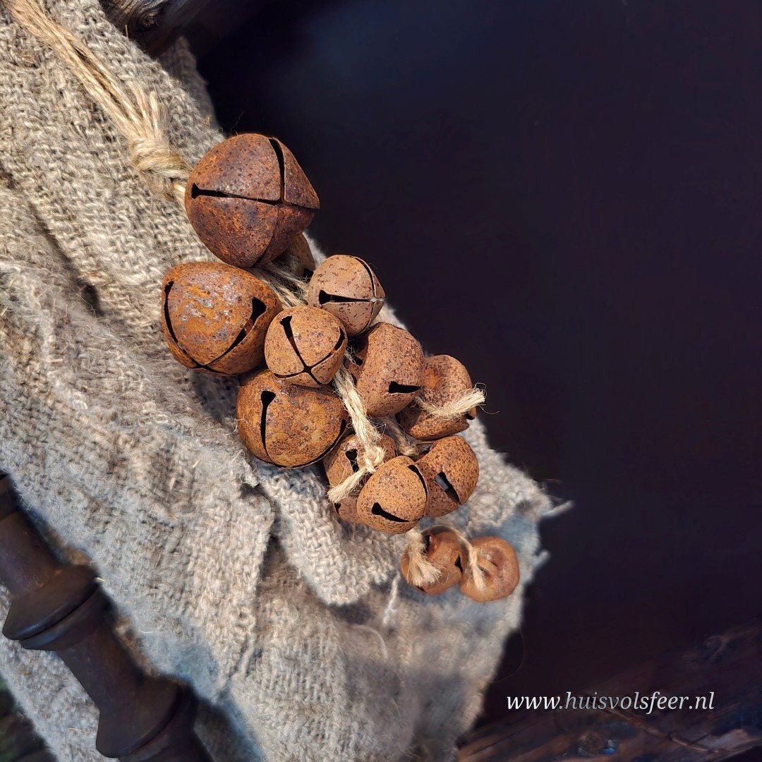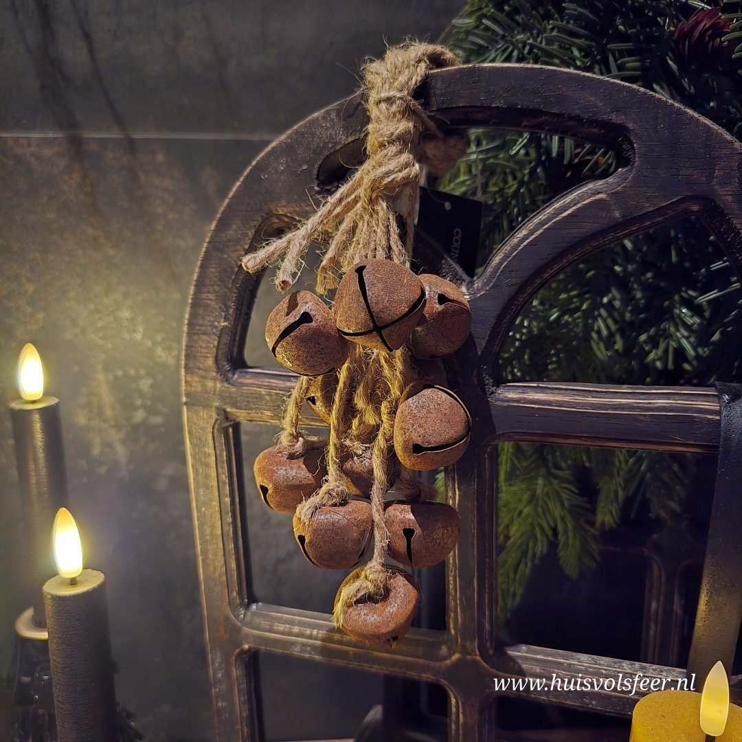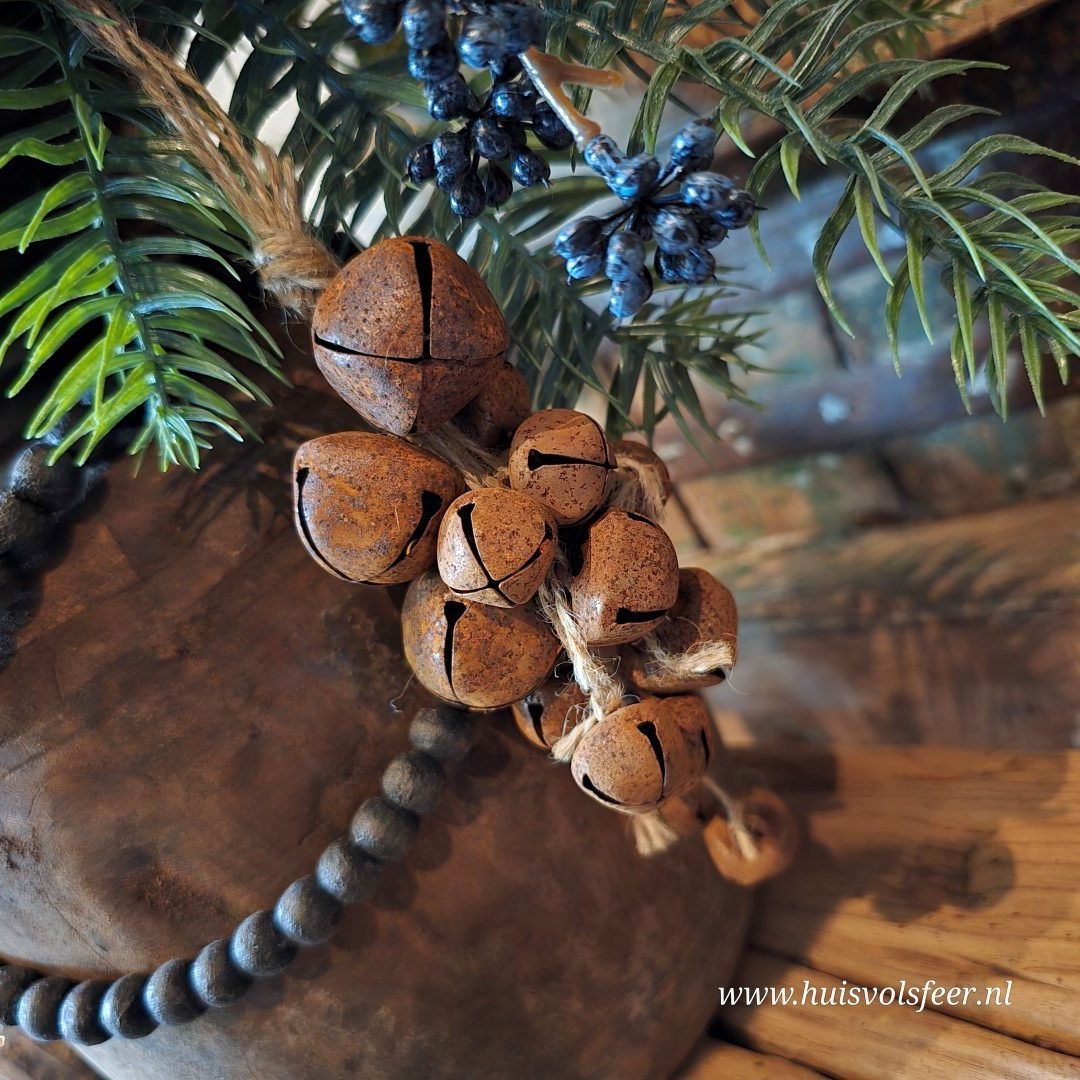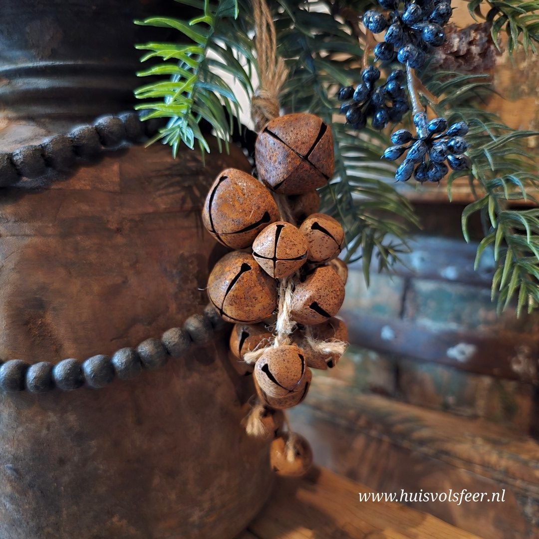 Decoratieve hanger met roestkleurige belletjes, gebundeld als een sfeervol trosje.