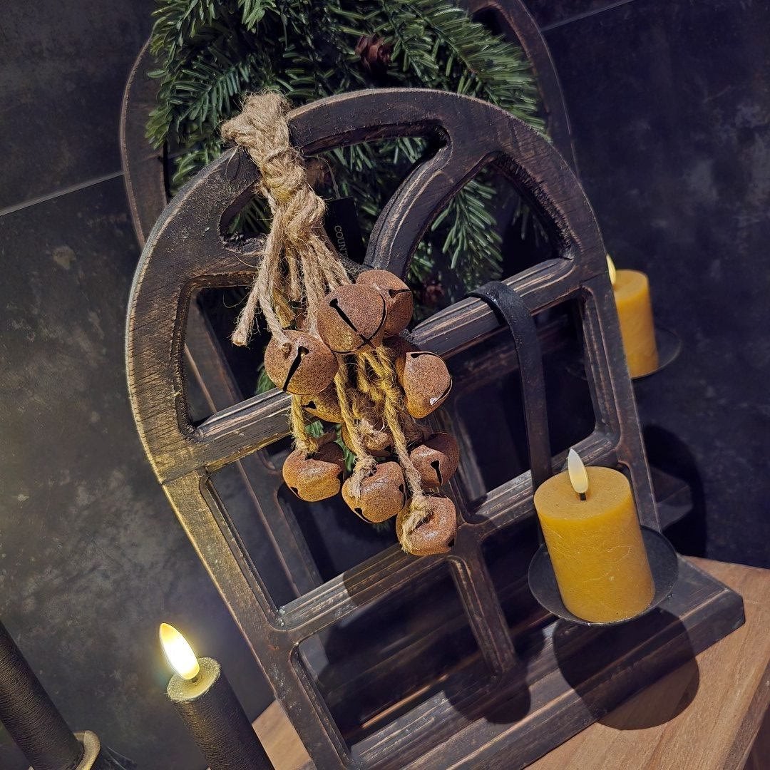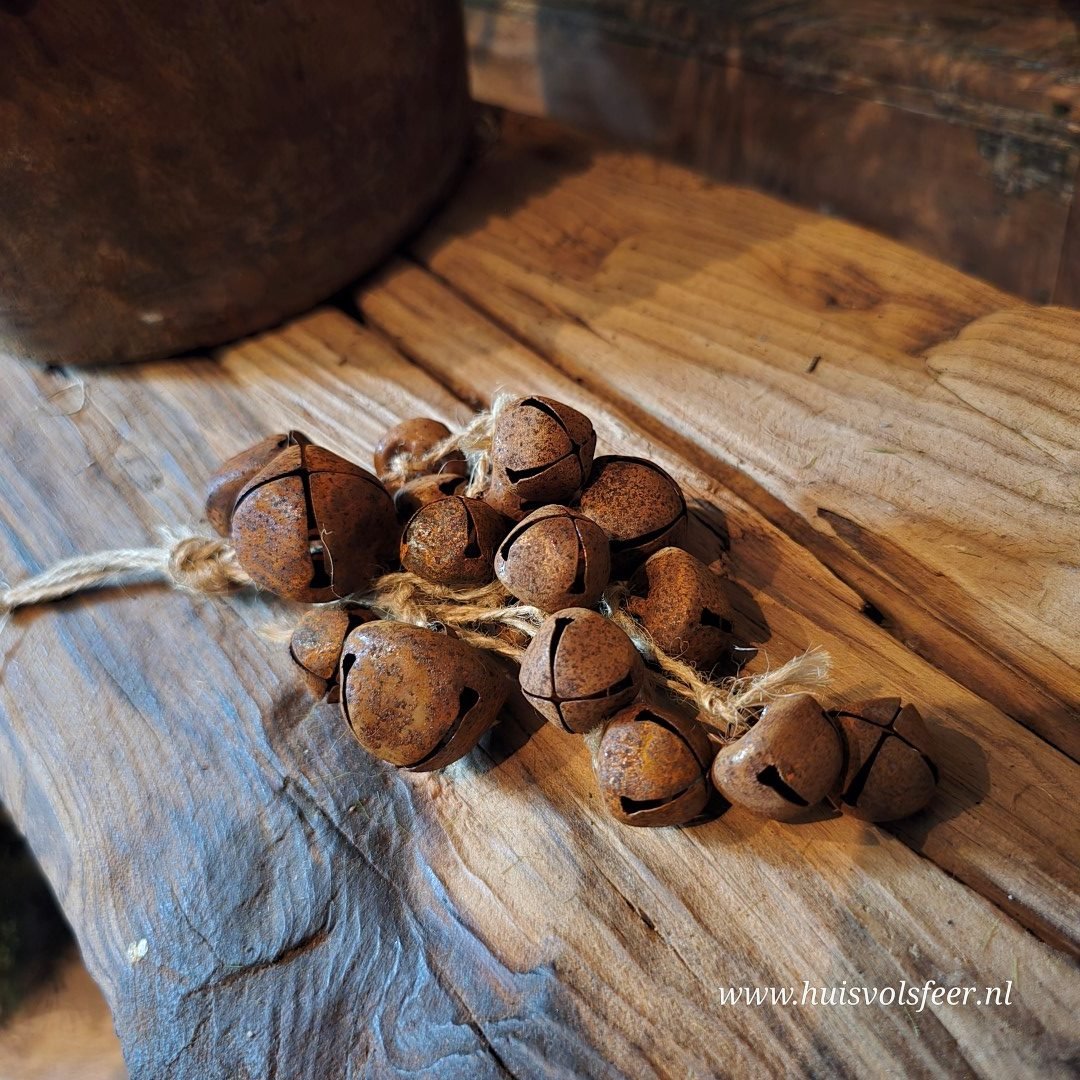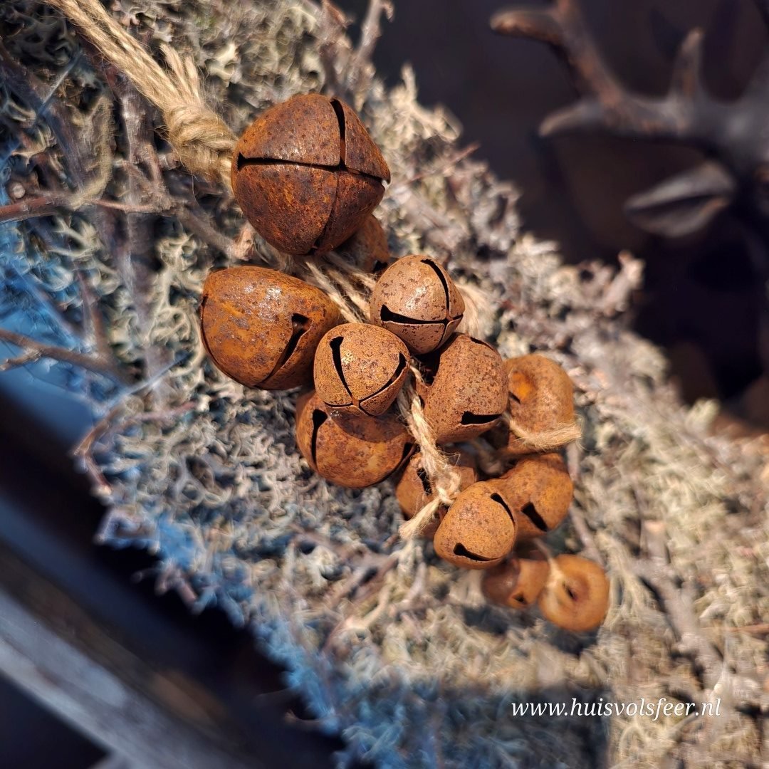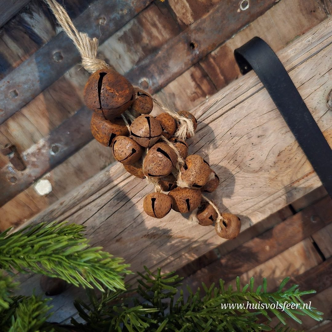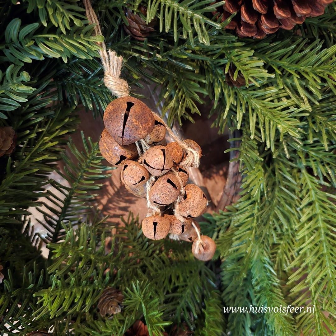 Decoratieve hanger met roestkleurige belletjes, gebundeld als een sfeervol trosje.