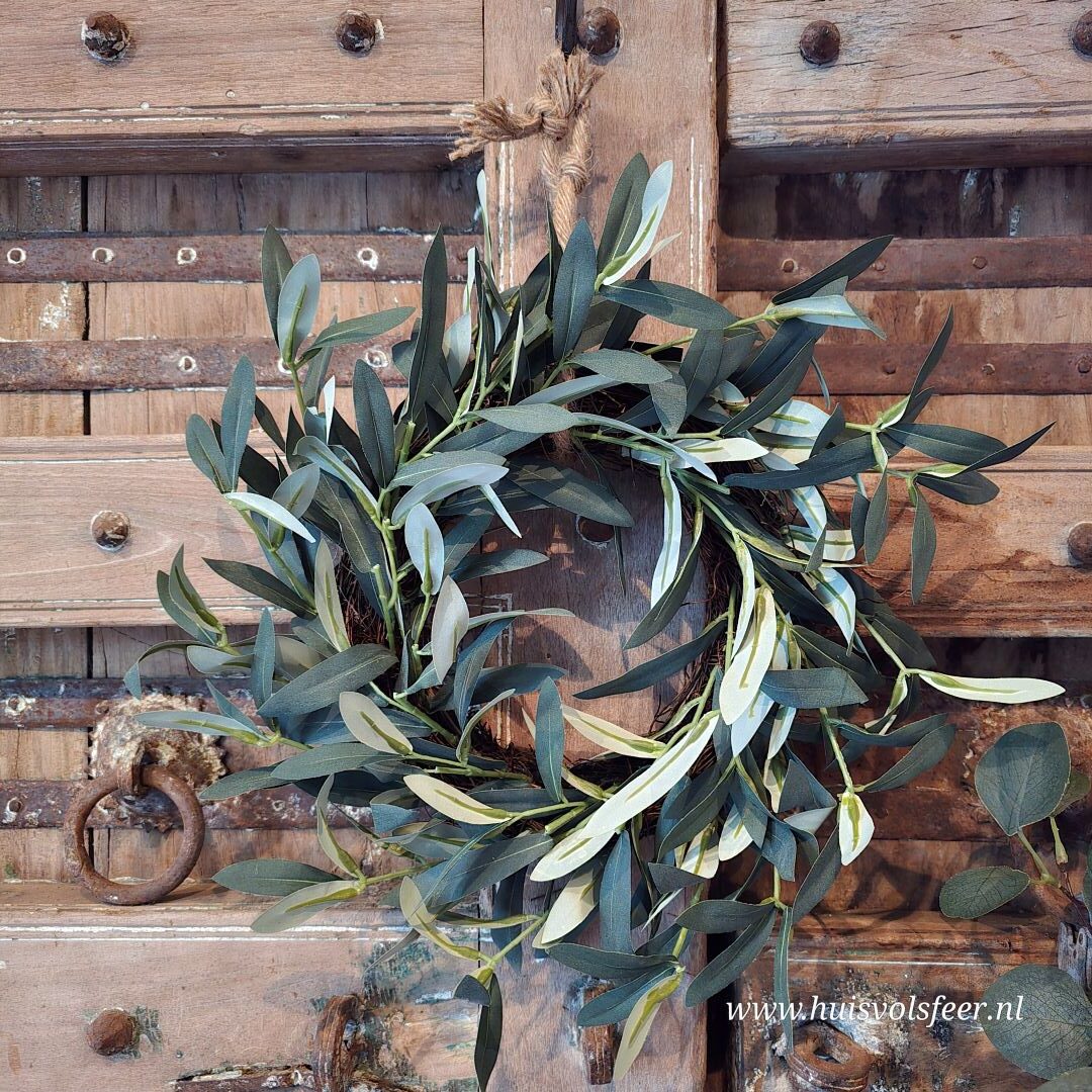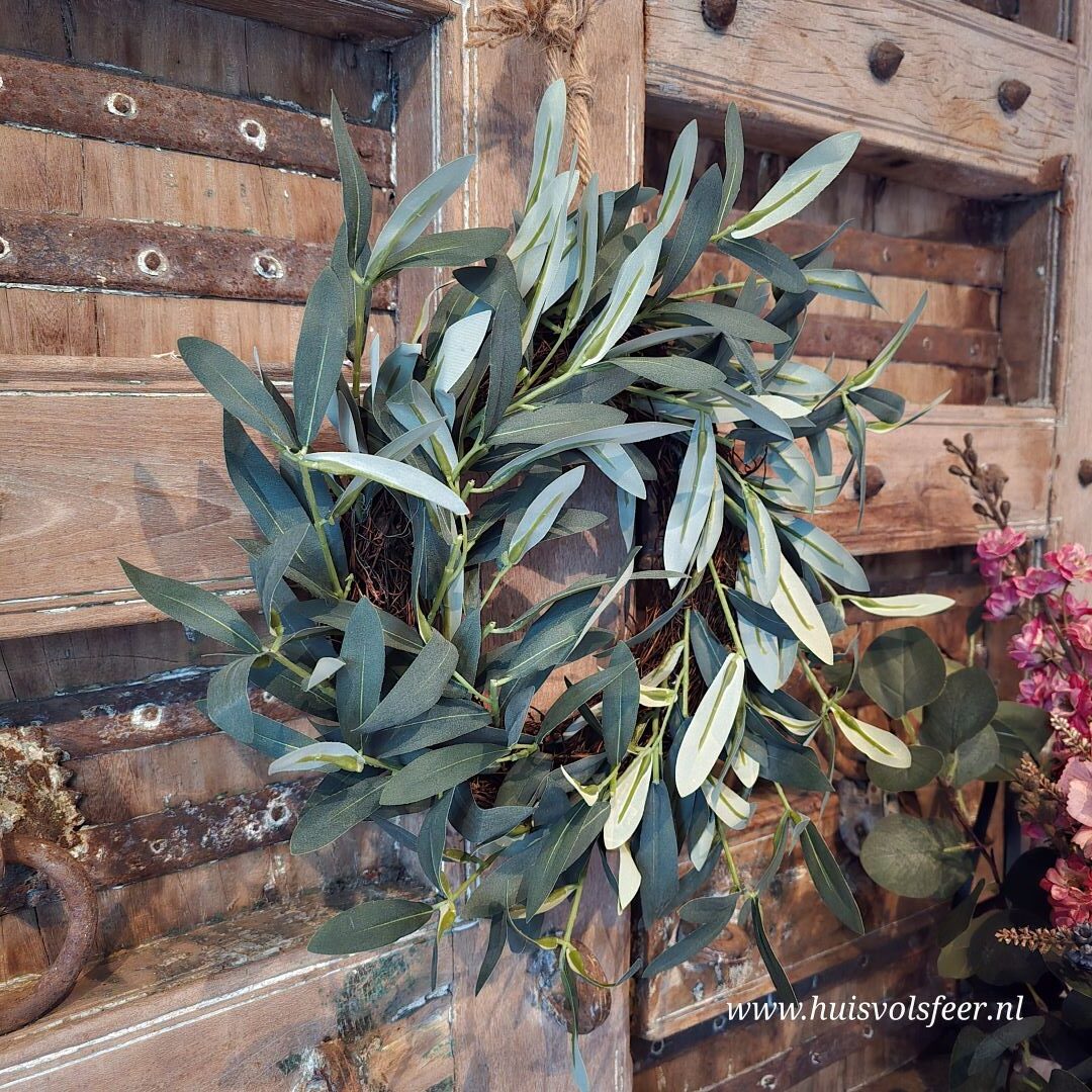 Breng een natuurlijke en rustige sfeer in huis met deze prachtige Krans Olive. Deze stijlvolle zijde krans is opgebouwd uit verfijnde olijftakken in verschillende groentinten, wat zorgt voor een realistische en frisse uitstraling.