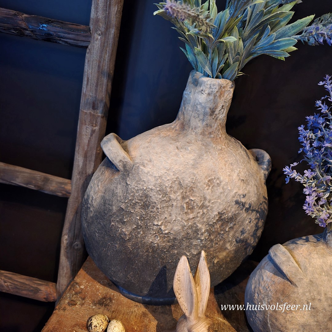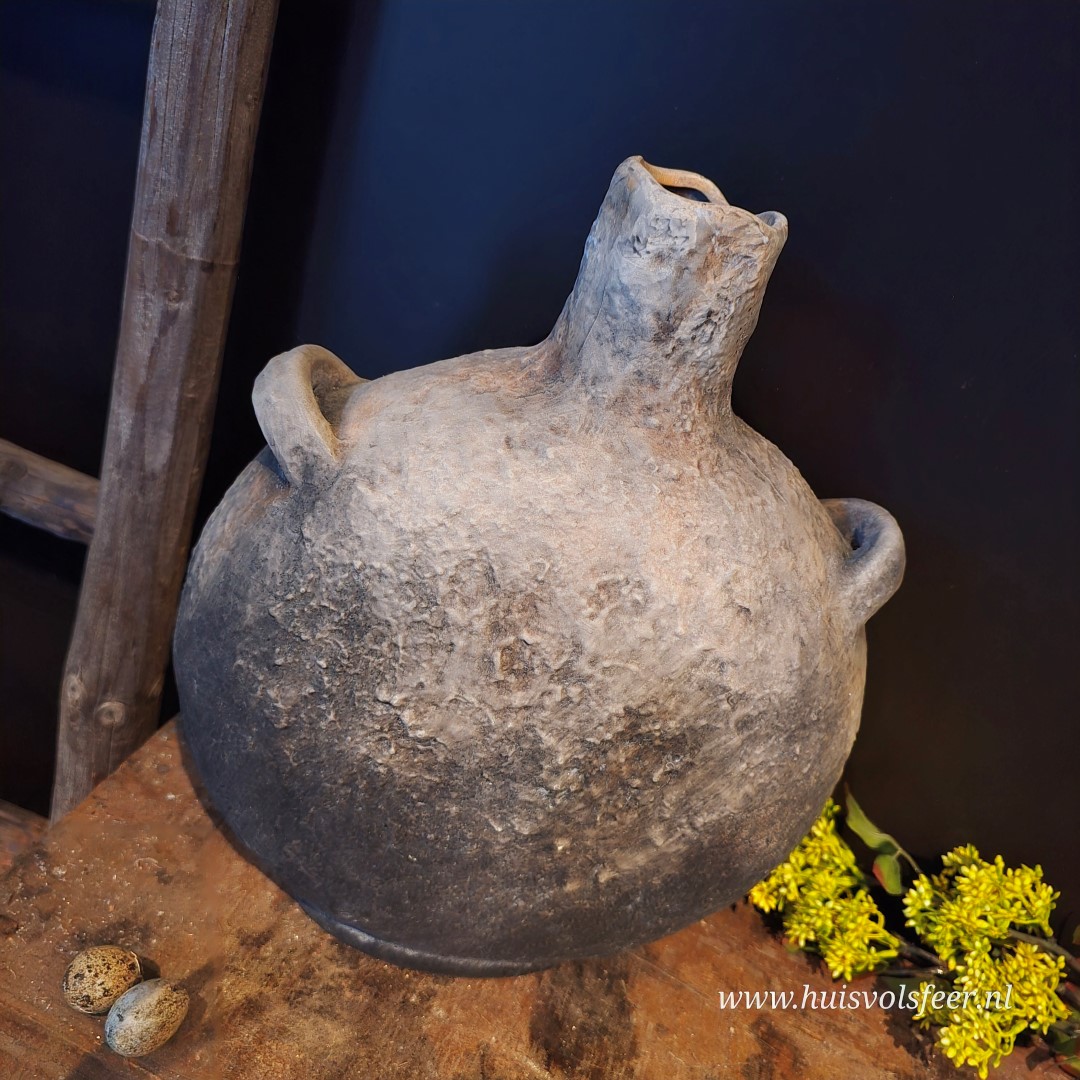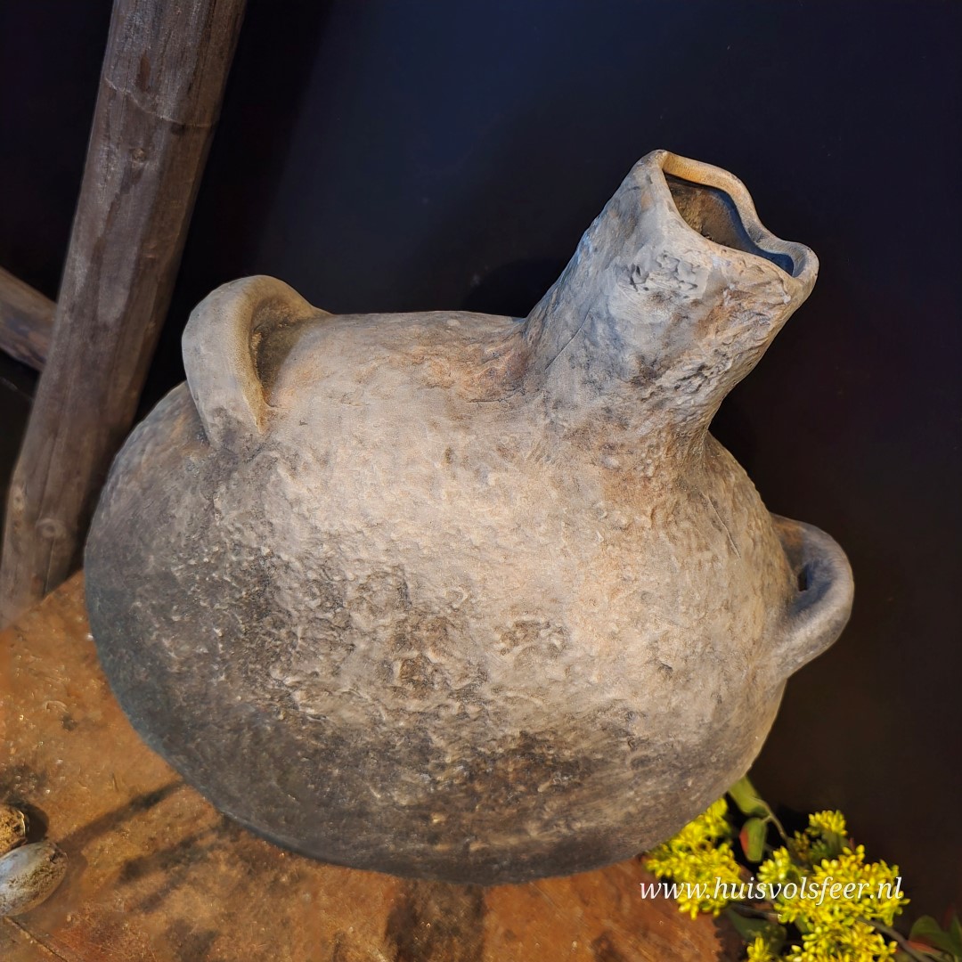 De kruik Hamza in maat M is een echte blikvanger dankzij zijn royale formaat en robuuste vorm. De handvatten en de licht verweerde grijze afwerking geven deze kruik een tijdloze, landelijke uitstraling met een subtiel stoer randje.