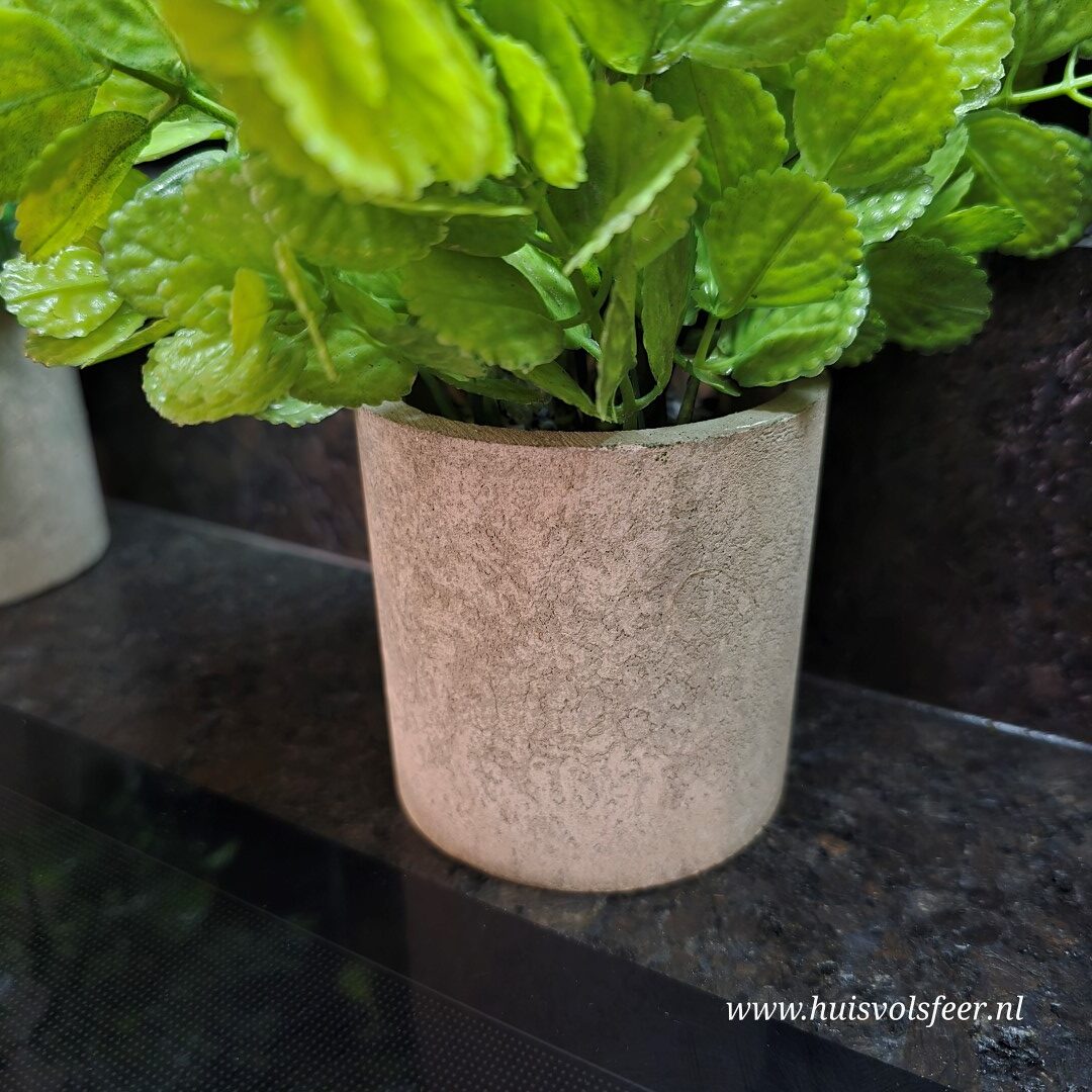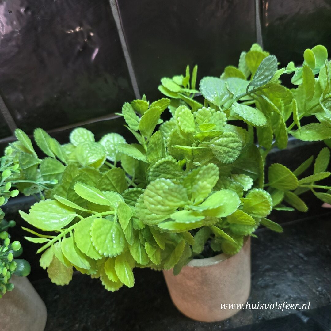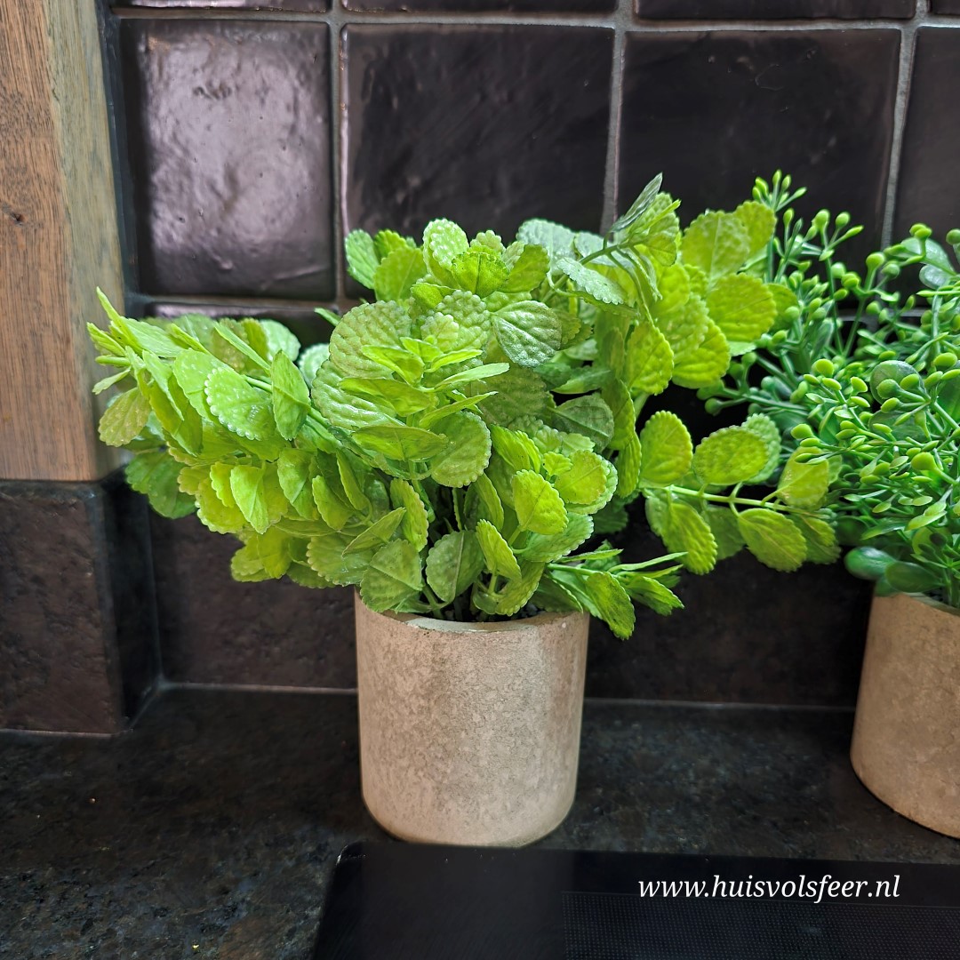 Een sfeervol kunstplantje geïnspireerd op basilicum, geplaatst in een stijlvol zandkleurig stenen potje. Het frisse groene blad zorgt direct voor een natuurlijke en gezellige uitstraling.