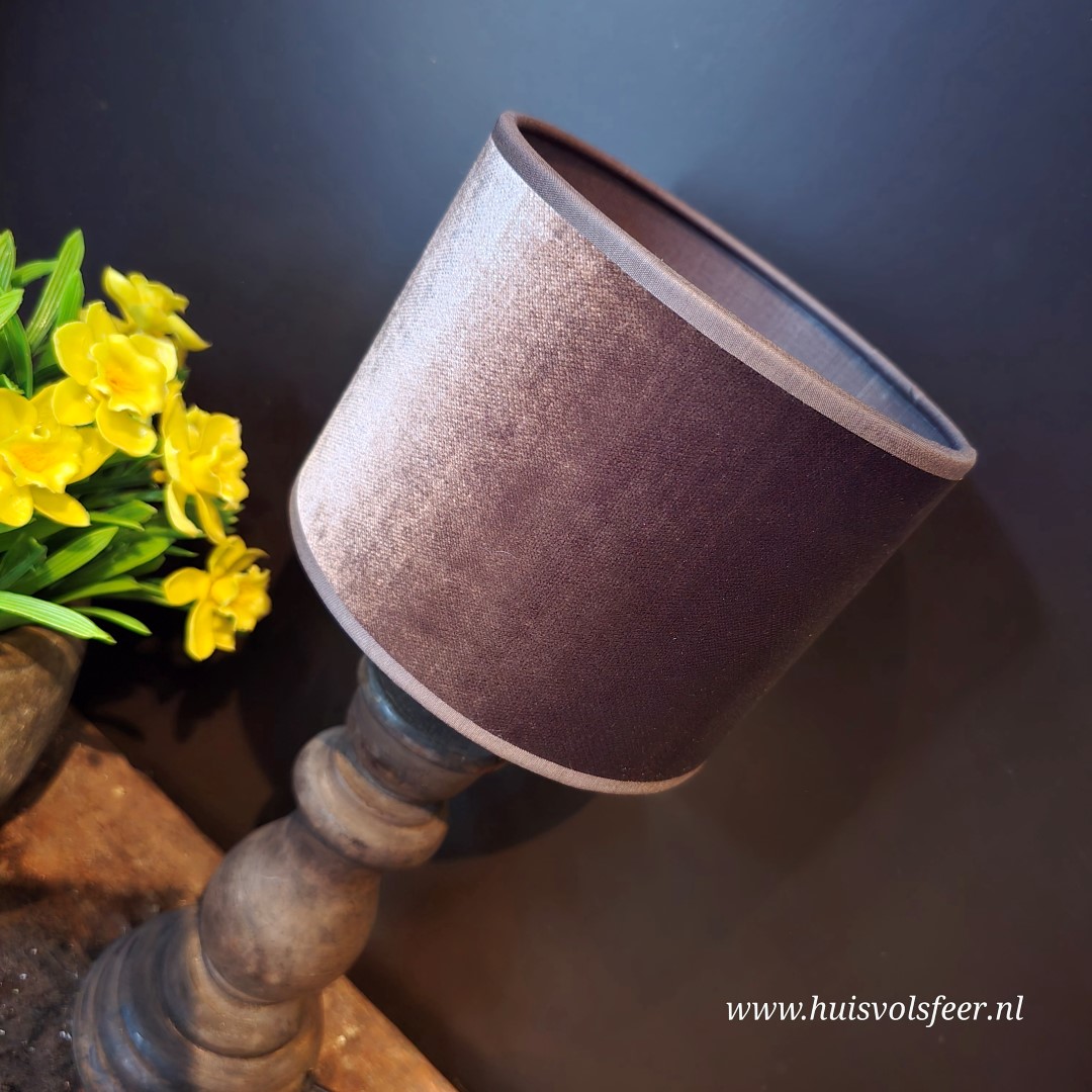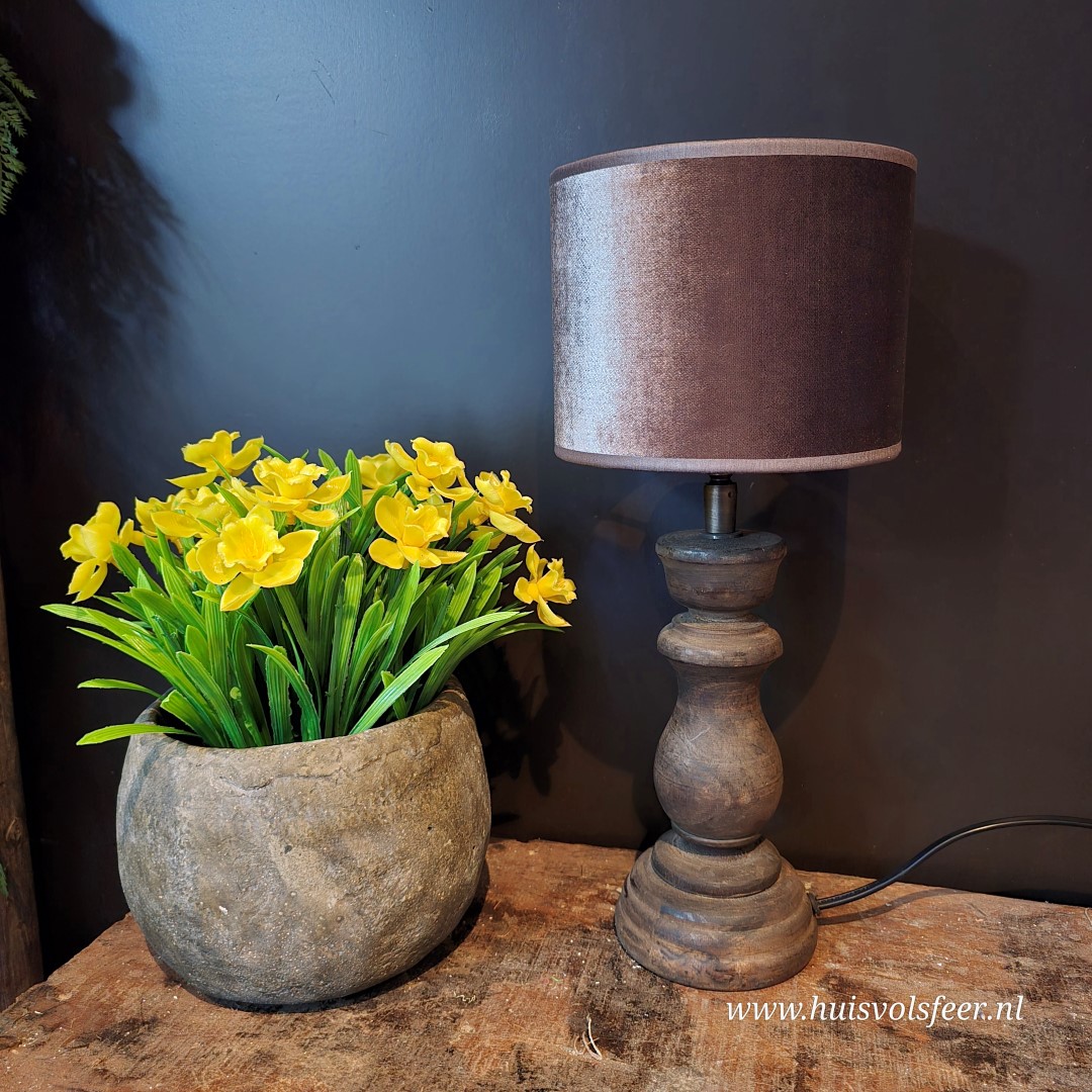De bruine lampenkap met lichte textuur zorgt voor een warm en sfeervol licht. De diepe, warme kleur sluit mooi aan bij de houten voet en geeft de lamp een rustige en natuurlijke uitstraling. Hierdoor laat de lamp zich gemakkelijk combineren met andere landelijke woonaccessoires.