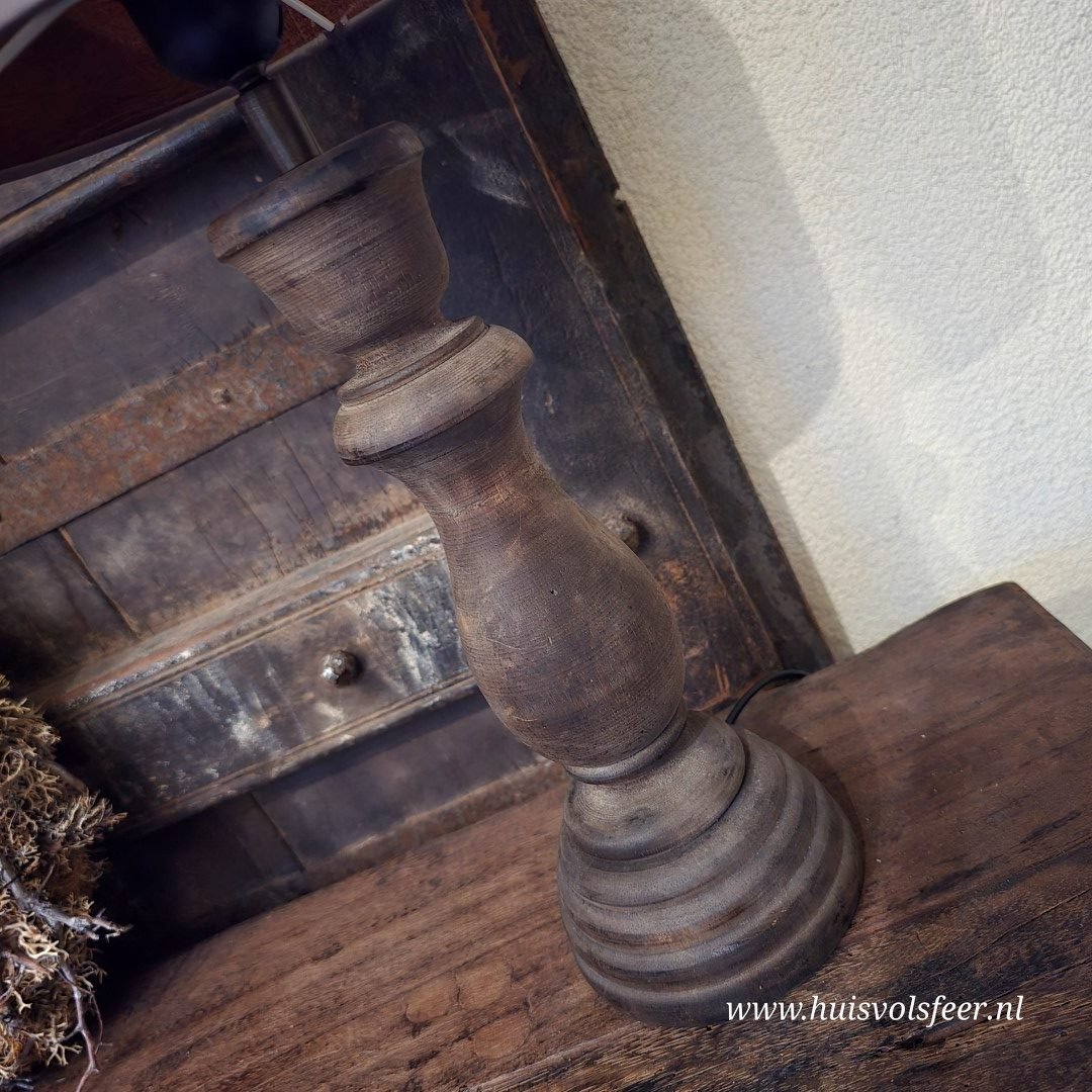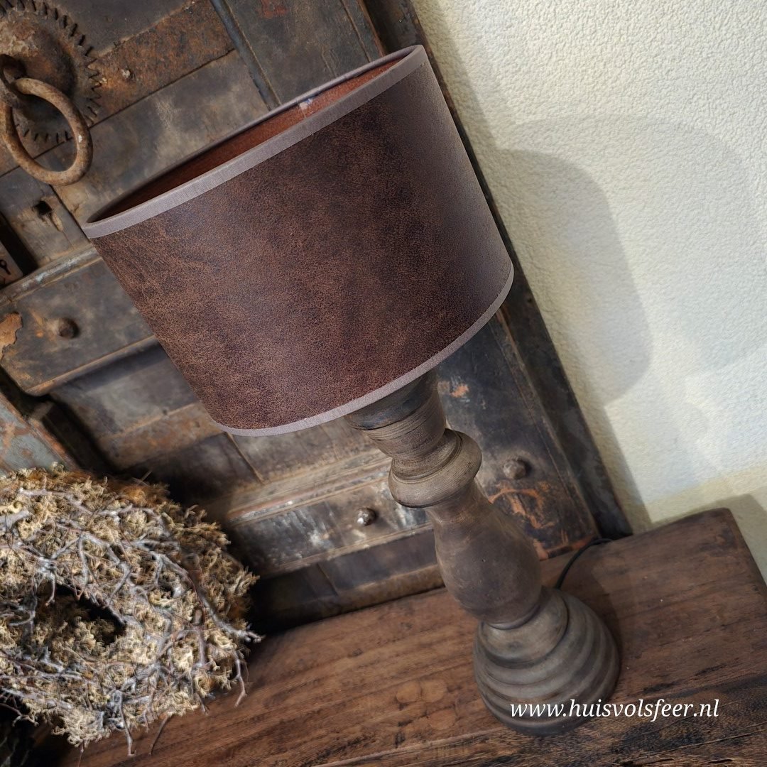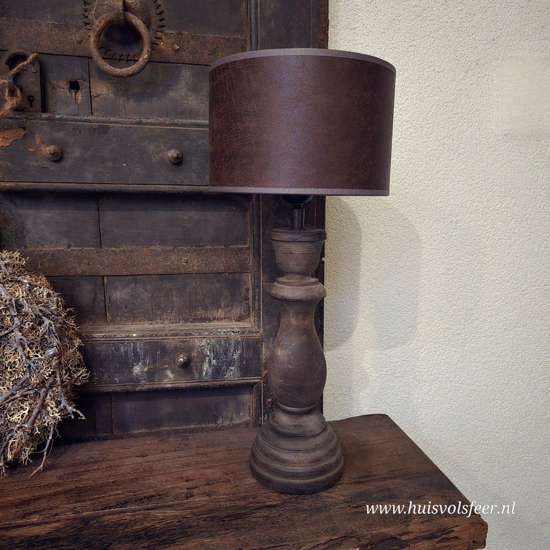 Een sfeervolle baluster lamp met een robuuste houten voet en een bruine kap die perfect past in een landelijk of stoer interieur. De combinatie van het warme hout en de diepe kleur van de kap zorgt voor een gezellige, tijdloze uitstraling.