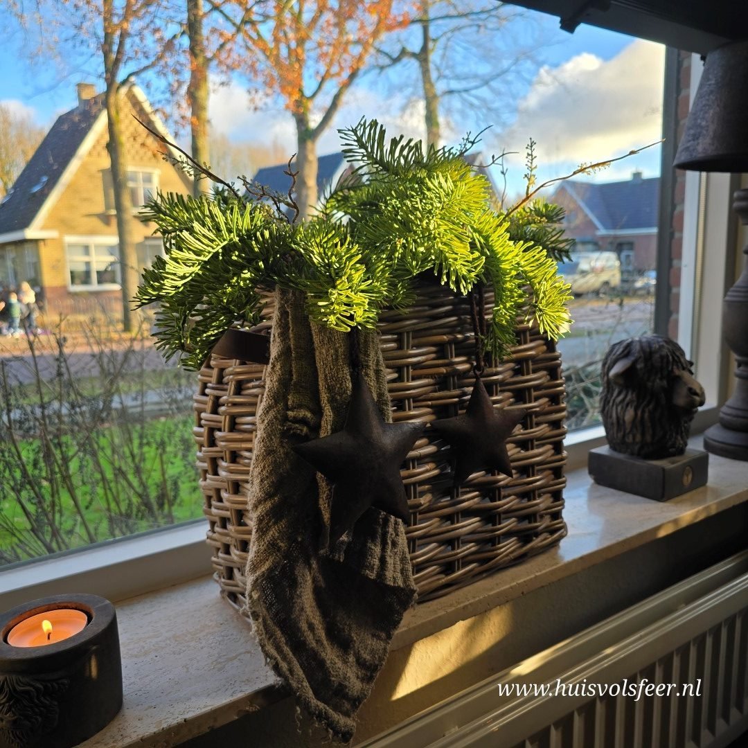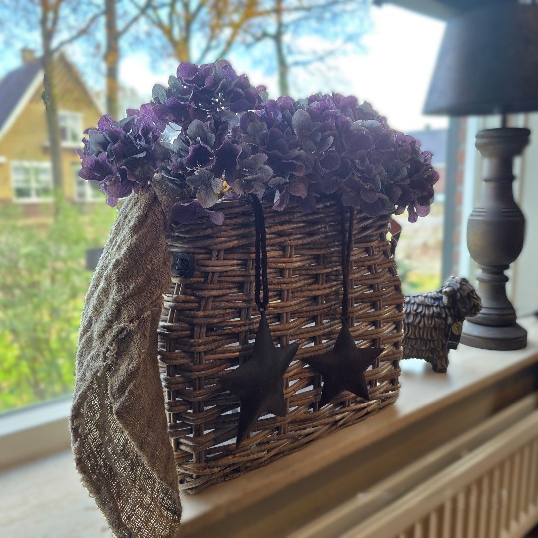 *Ook kunt u de mand goed vullen met: 2x Alnus Grande, 2 takken Sedum spray en 3 takken Juniperus Bronze takken. Hang er een mooie klosketting aan en/ of een shabby doek.