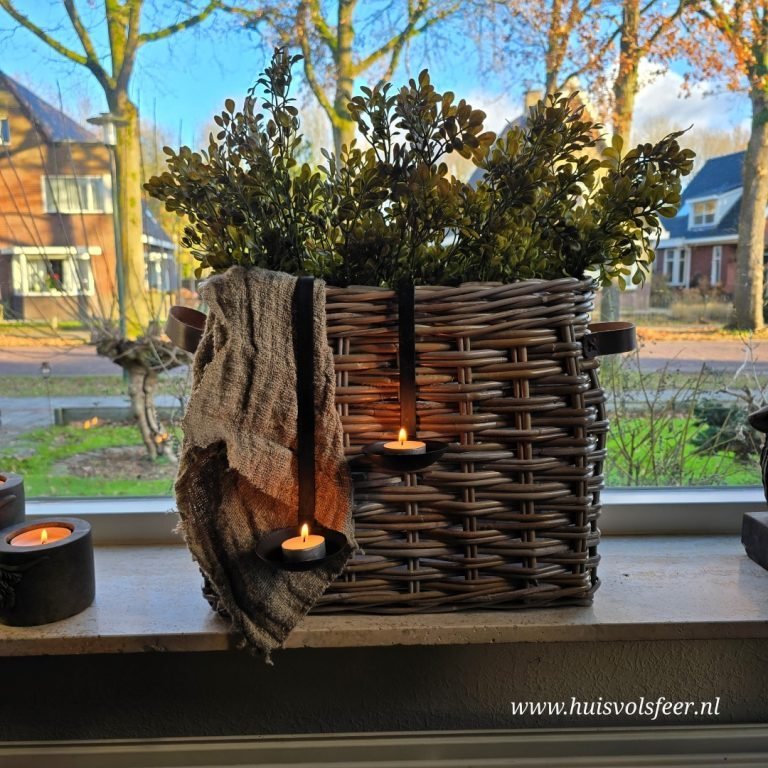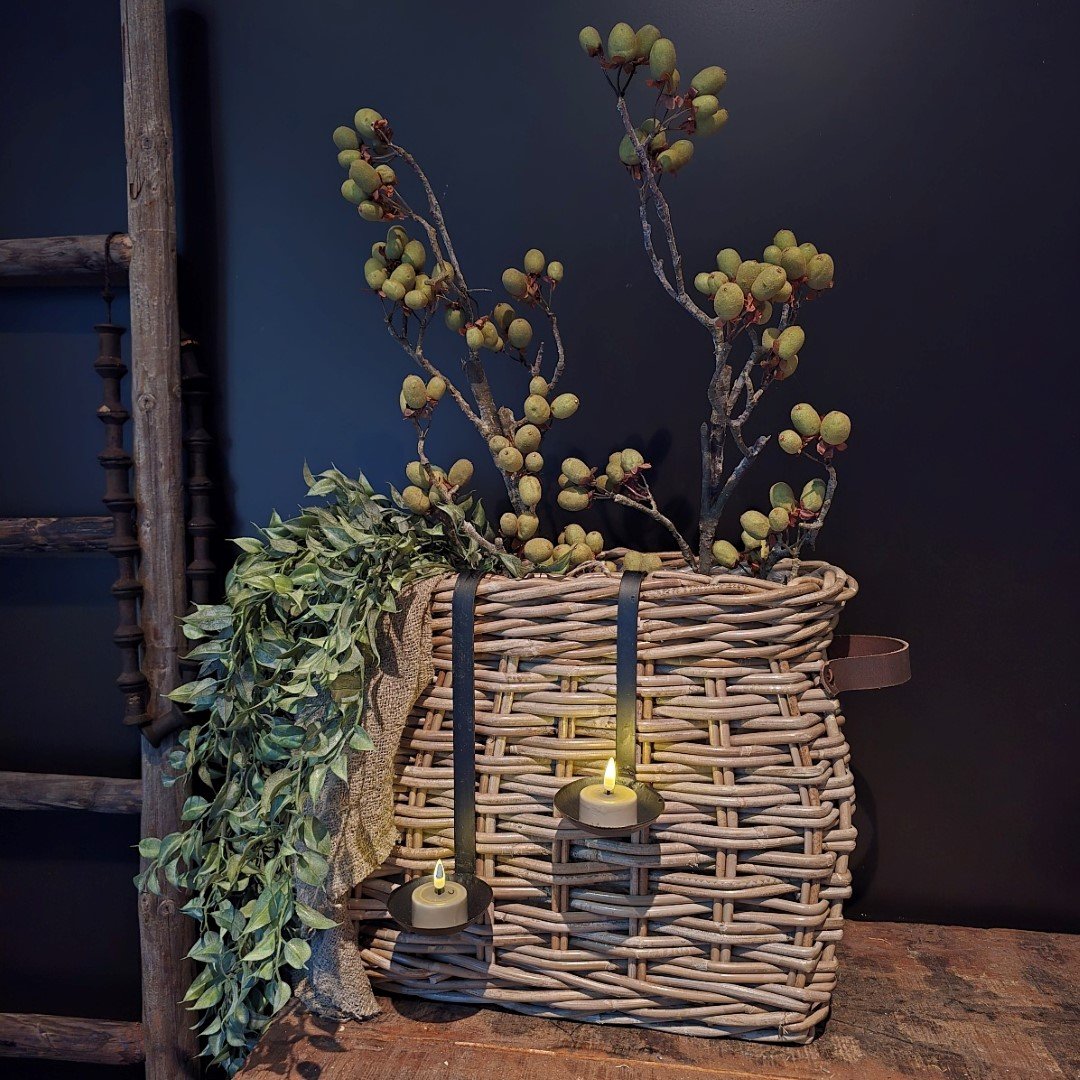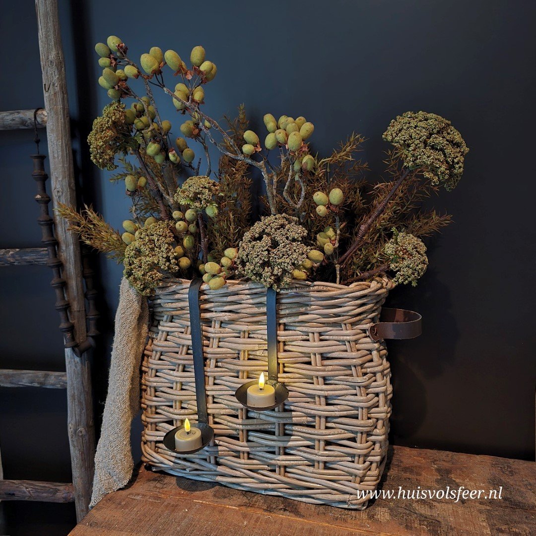 *Deze mand laat zich prachtig combineren met onze Myrica Bush takken, een Lipstick hanger, hanglepels en een shabby doek. Voor een volle en sfeervolle look adviseren we ongeveer 4 bossen van de Myrica Bush (afhankelijk van hoe goed gevuld u de mand wilt) in combinatie met het doek.