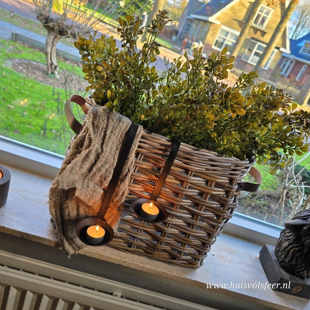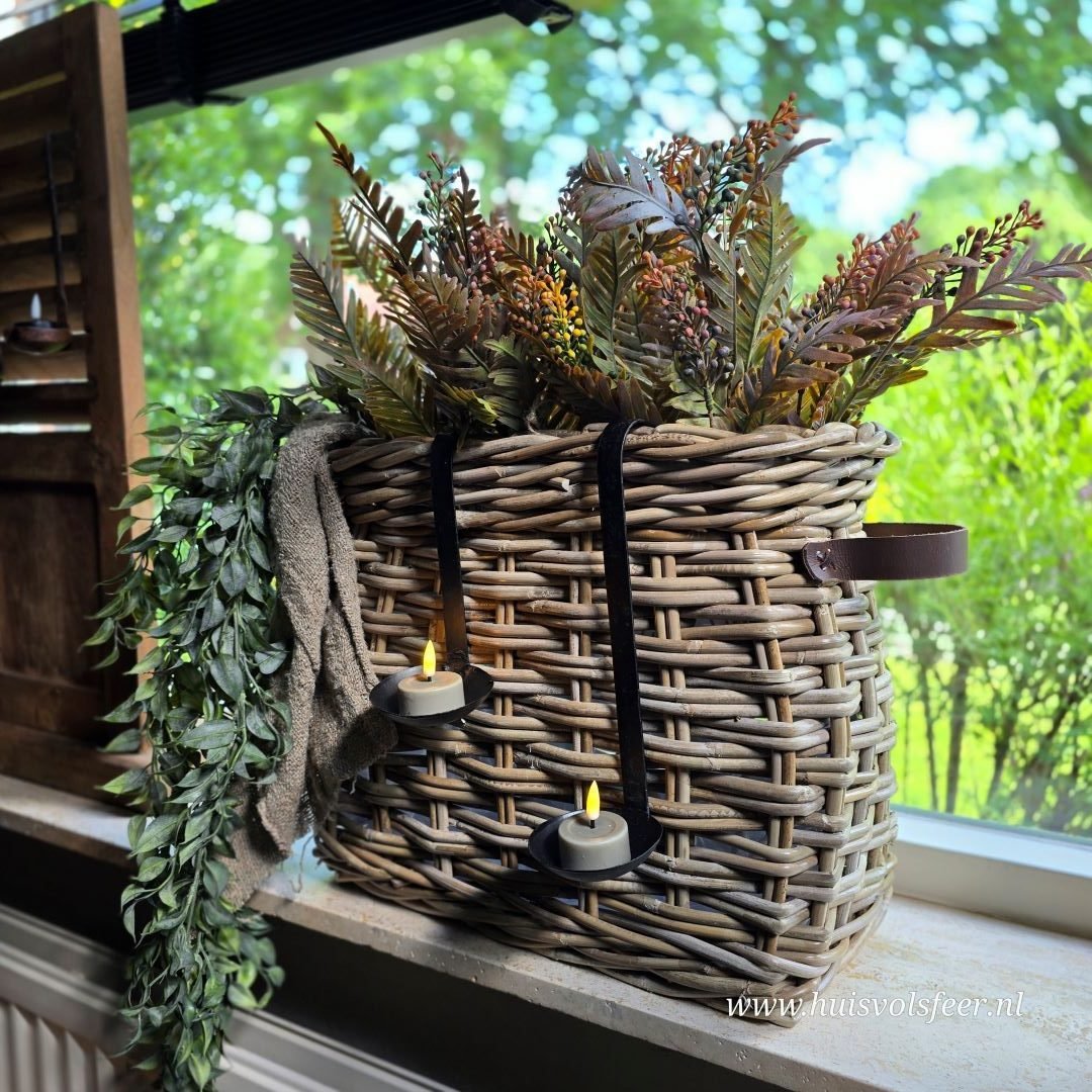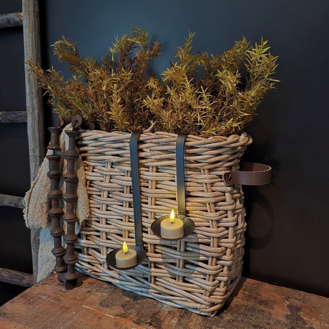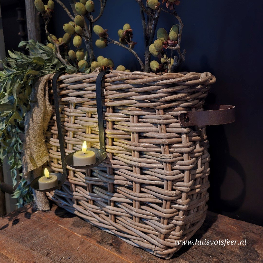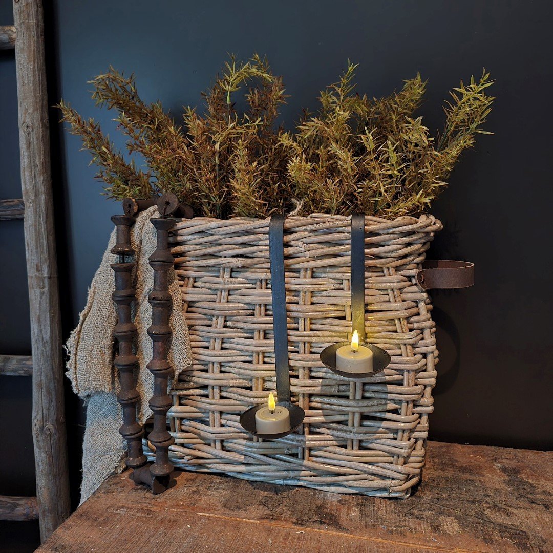 Decoratief detail: De schuin oplopende vorm en het stoere leren hengsel maken deze mand een stijlvol accessoire. Hang er een shabby doek of metalen hanglepels met een (LED) waxinelicht aan voor een extra sfeervol effect.