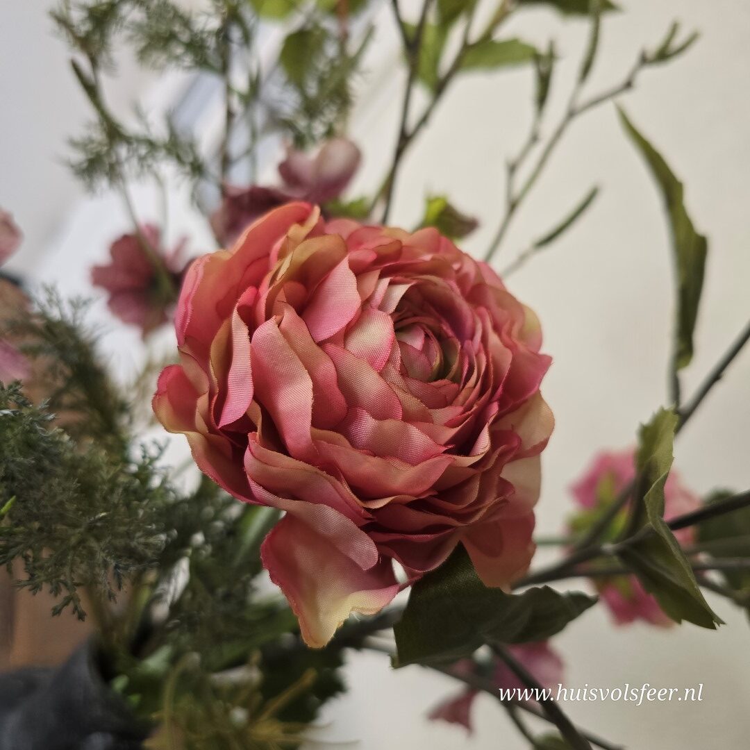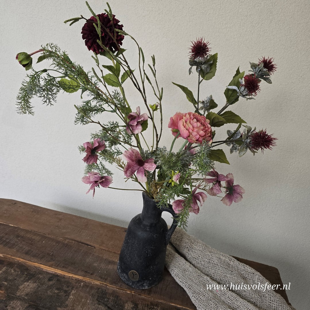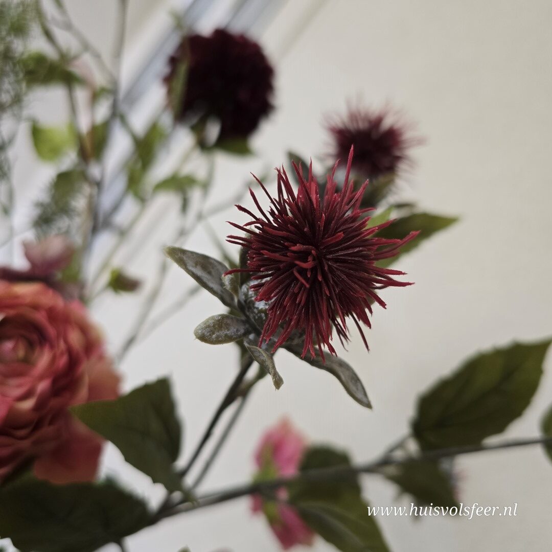 Een karaktervol en stijlvol zijdeboeket met 7 takken van ca. 90 cm hoog. Dit kunstboeket combineert warme rozetinten, diepe bordeaux accenten en verfijnd groen tot een speels en natuurlijk geheel met een licht stoere uitstraling.