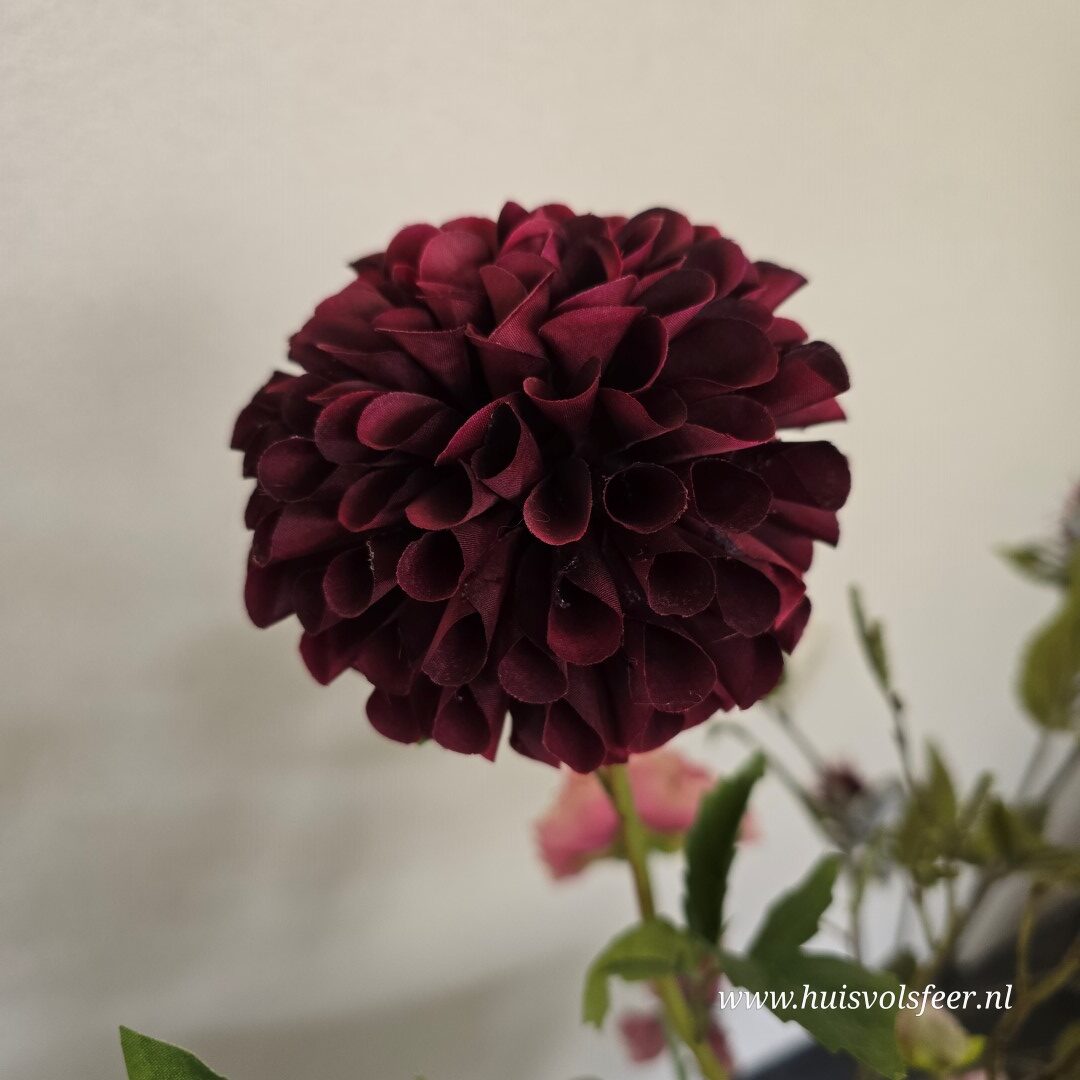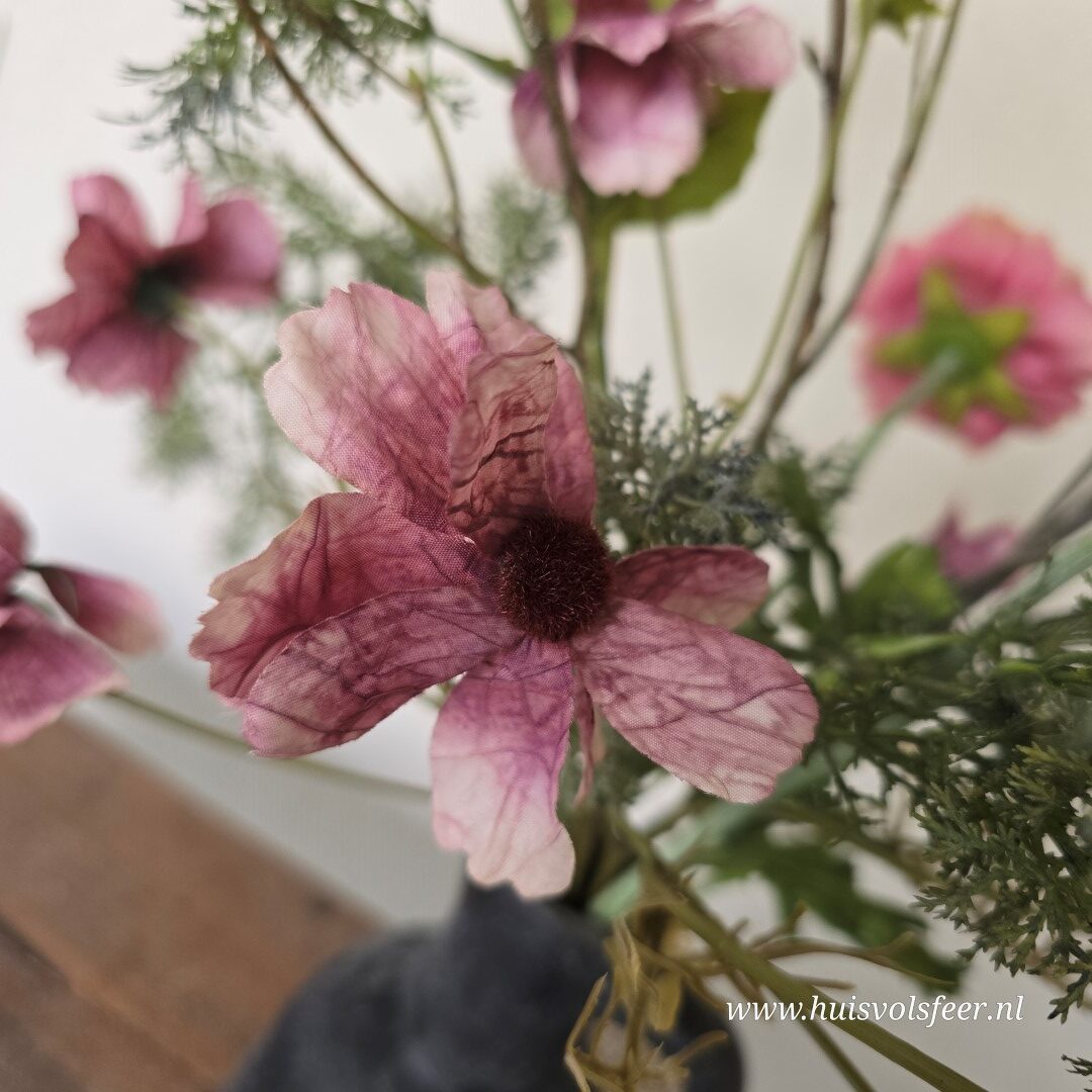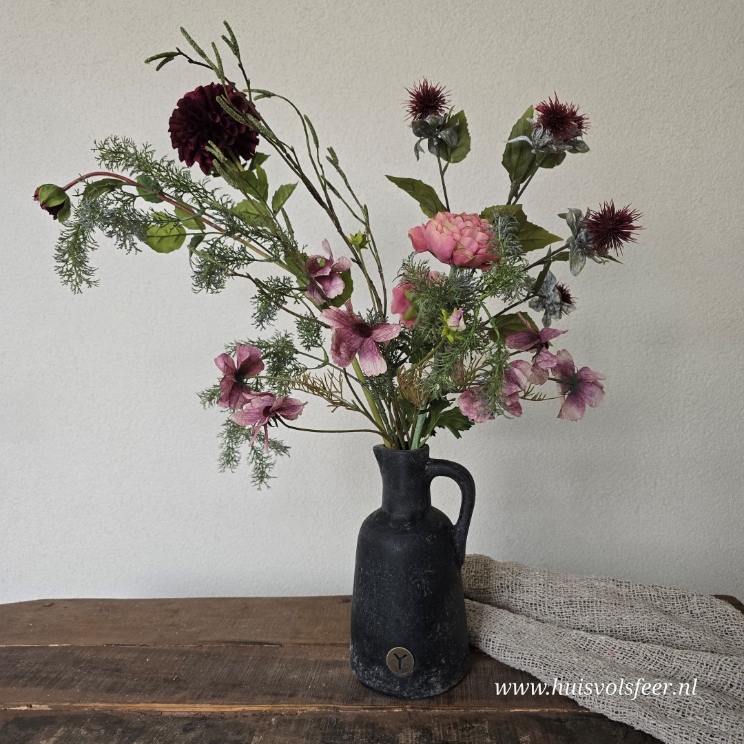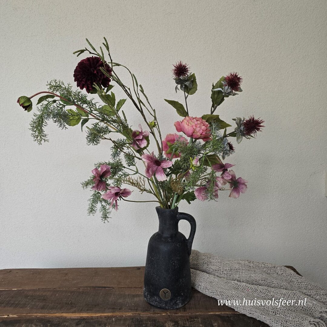 Een karaktervol en stijlvol zijdeboeket met 7 takken van ca. 90 cm hoog. Dit kunstboeket combineert warme rozetinten, diepe bordeaux accenten en verfijnd groen tot een speels en natuurlijk geheel met een licht stoere uitstraling.