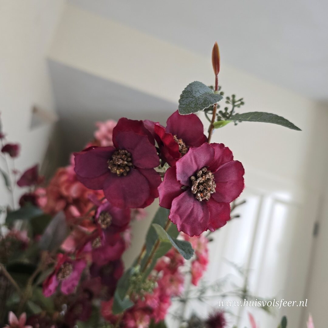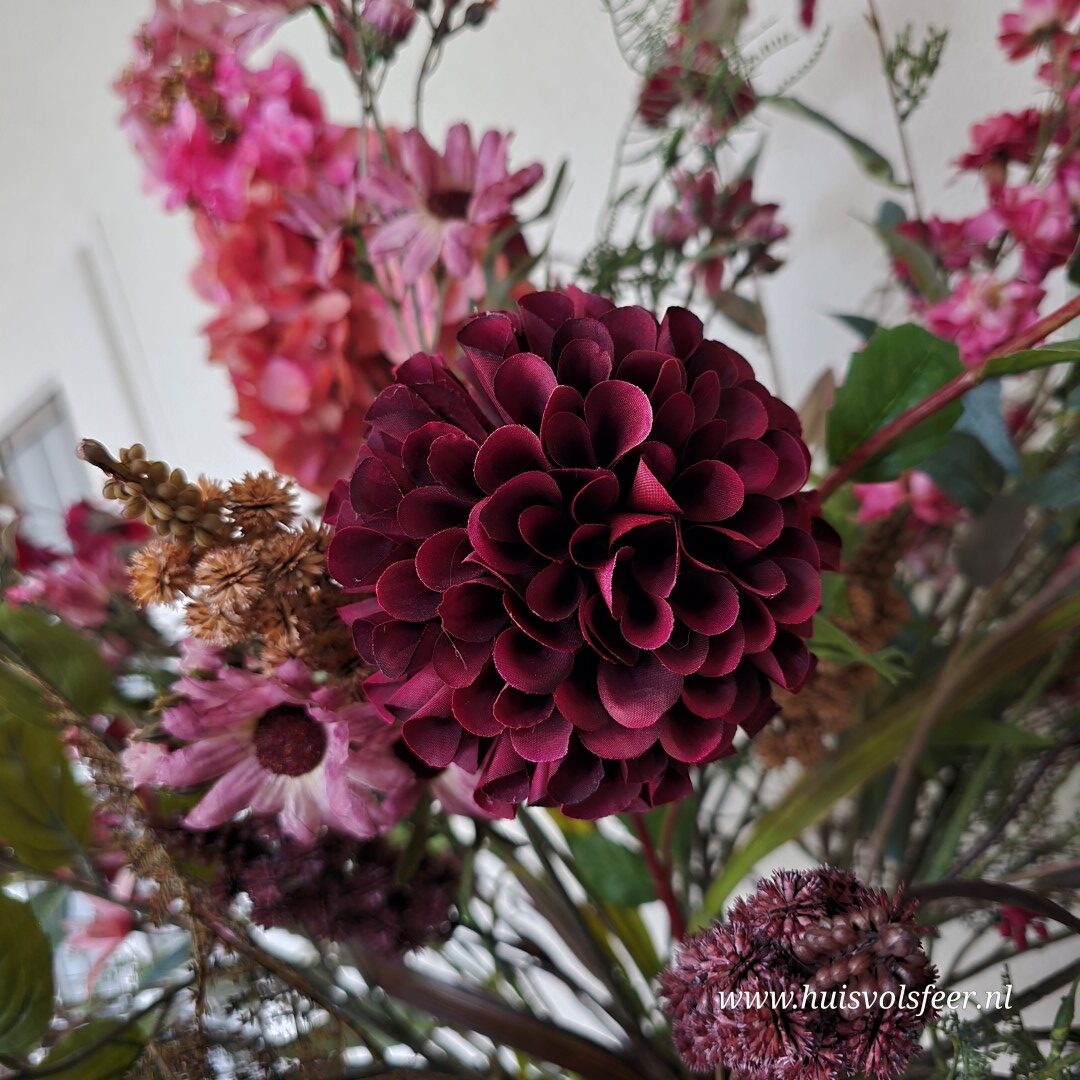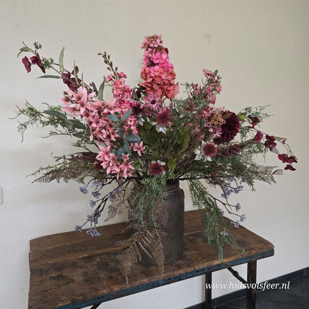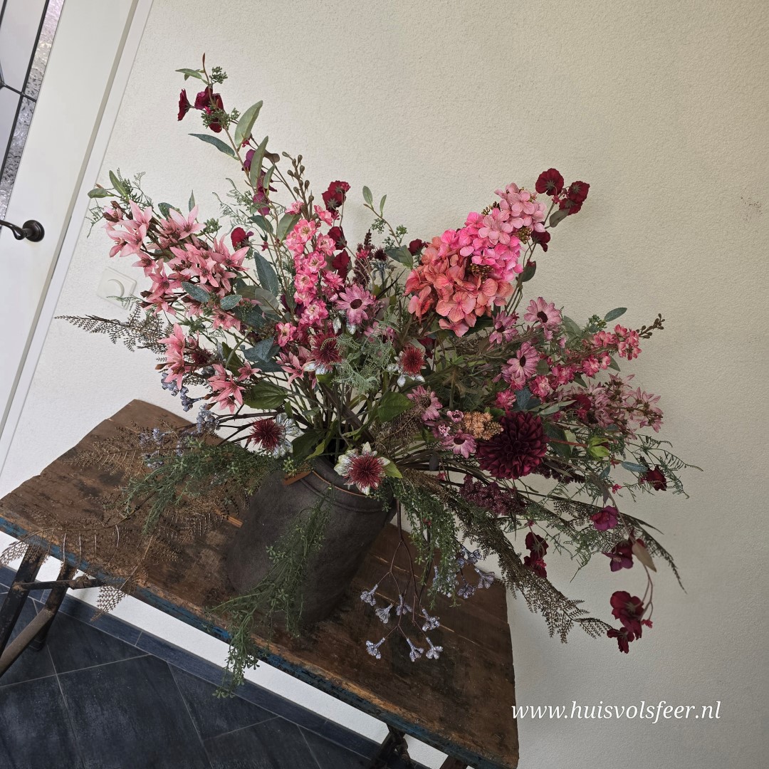 Breng sfeer, kleur en luxe in huis met dit prachtige zijdeboeket XL bestaande uit maar liefst 28 takken. Dit rijk gevulde kunstboeket in warme roze- en bordeauxtinten zorgt direct voor een stijlvolle en volle uitstraling en is een echte eyecatcher op je tafel, dressoir of keukeneiland.