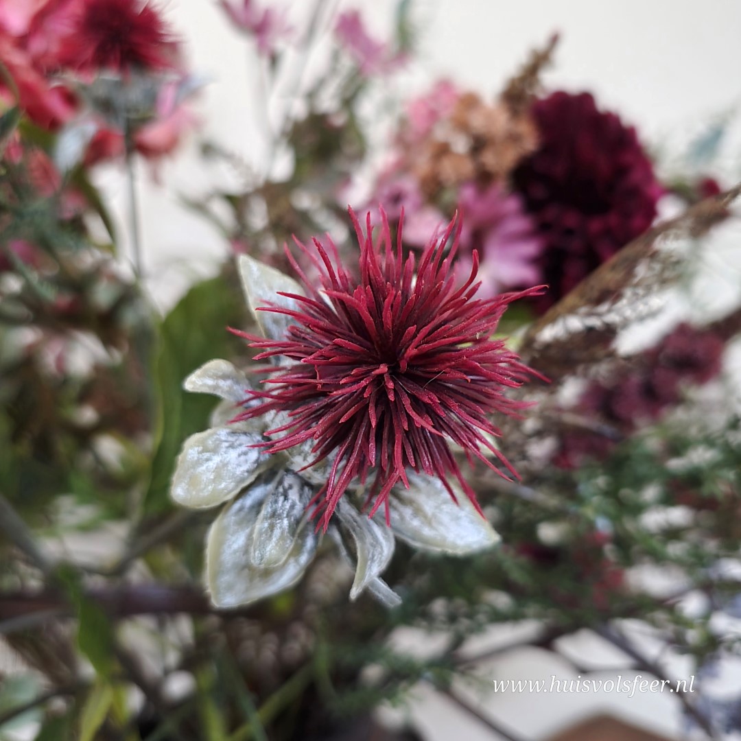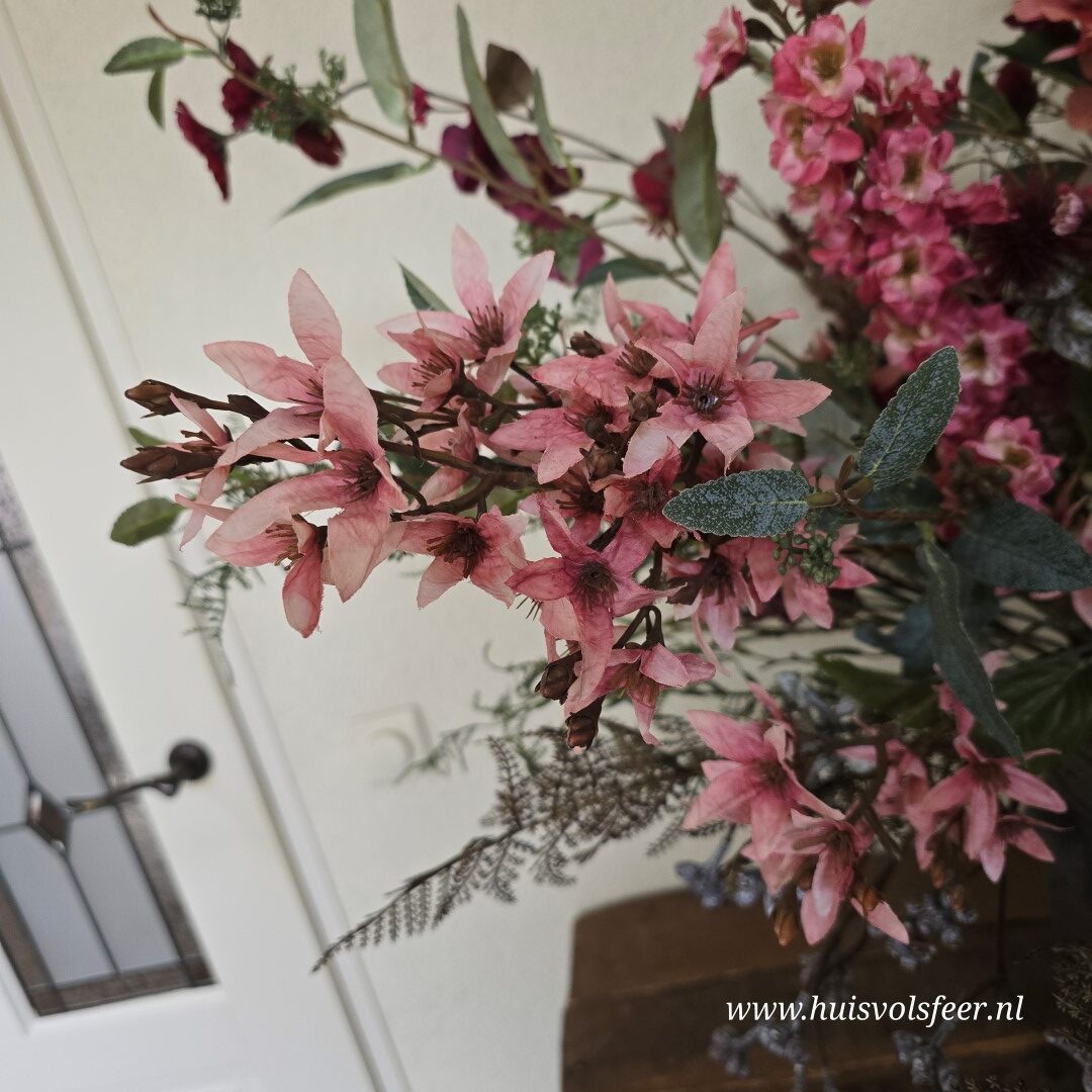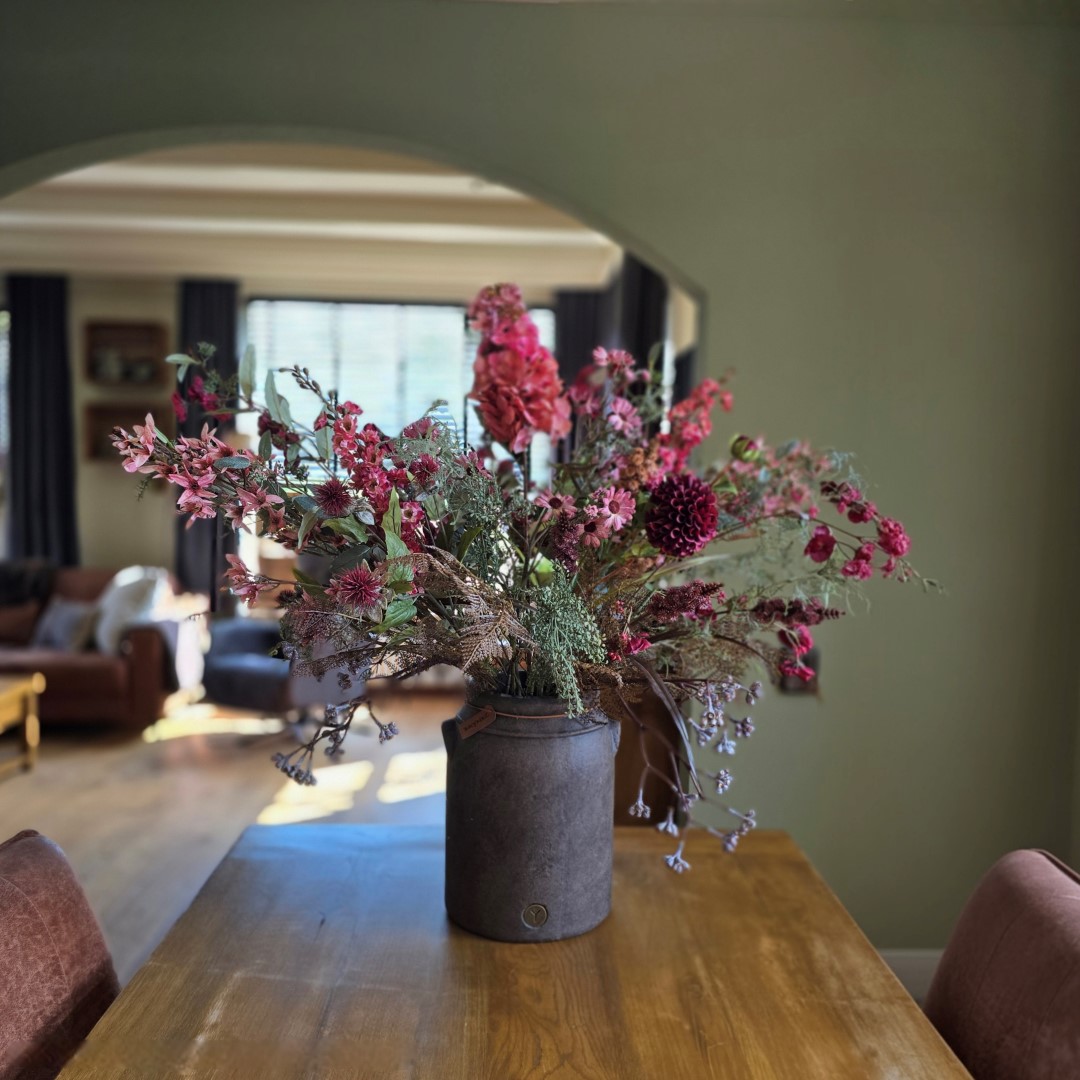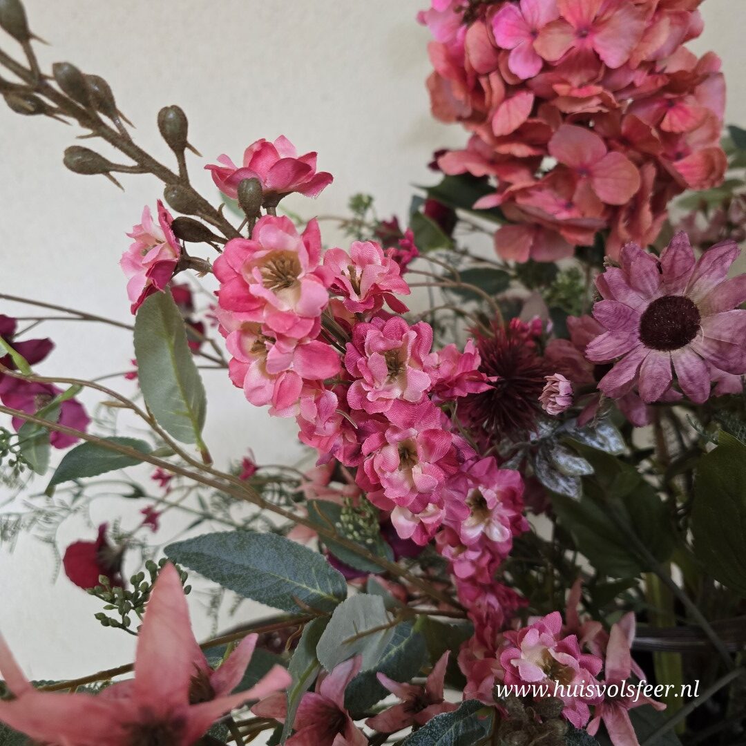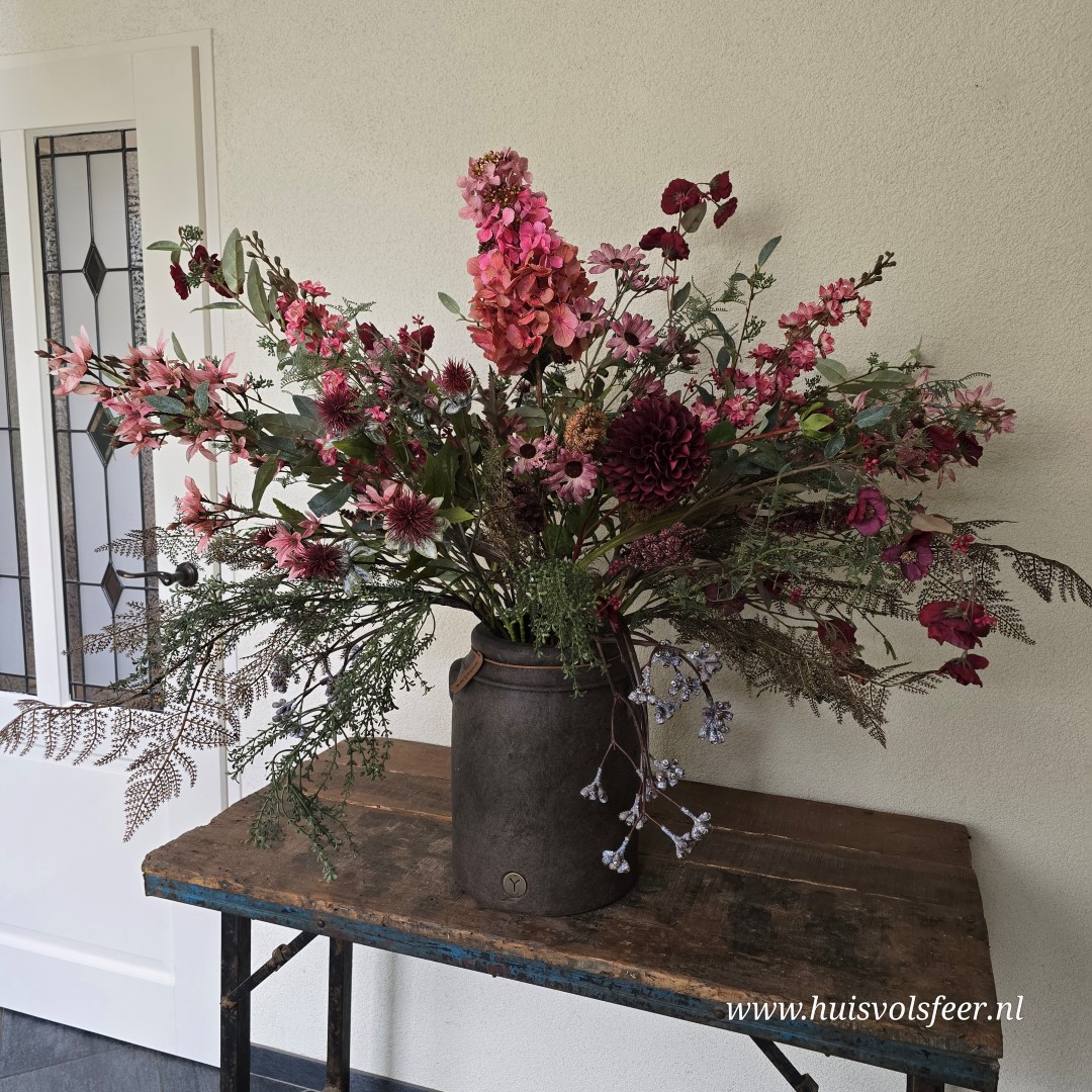 Breng sfeer, kleur en luxe in huis met dit prachtige zijdeboeket XL bestaande uit maar liefst 28 takken. Dit rijk gevulde kunstboeket in warme roze- en bordeauxtinten zorgt direct voor een stijlvolle en volle uitstraling en is een echte eyecatcher op je tafel, dressoir of keukeneiland.