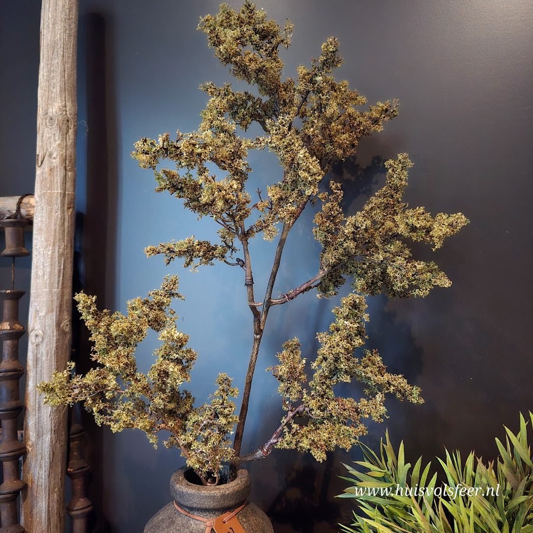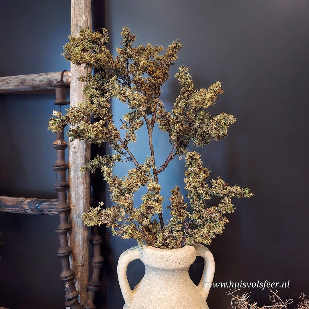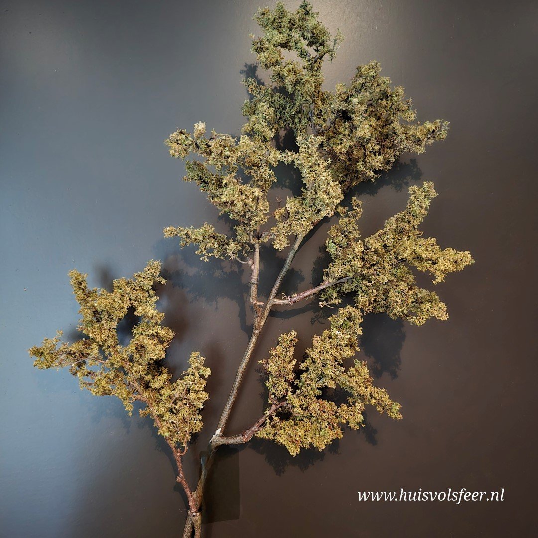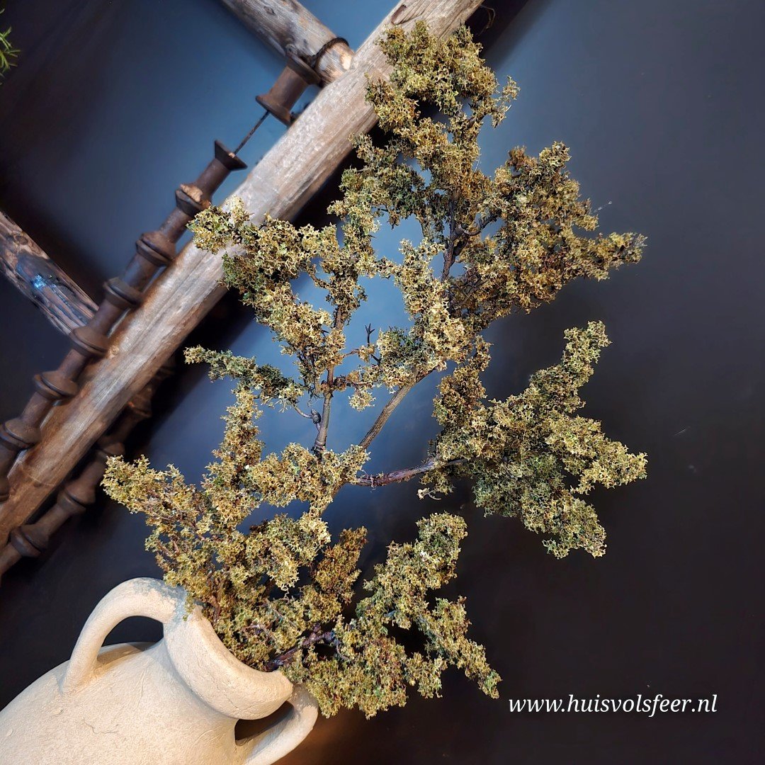 Breng natuurlijke warmte in je interieur met deze Spirea Japonica kunsttak. De tak is realistisch vormgegeven met een prachtige mosachtige structuur en een volle, vertakte vorm. De tinten groen en bruin zorgen voor een rustieke, natuurlijke uitstraling — perfect passend bij een landelijk of stoer interieur.
