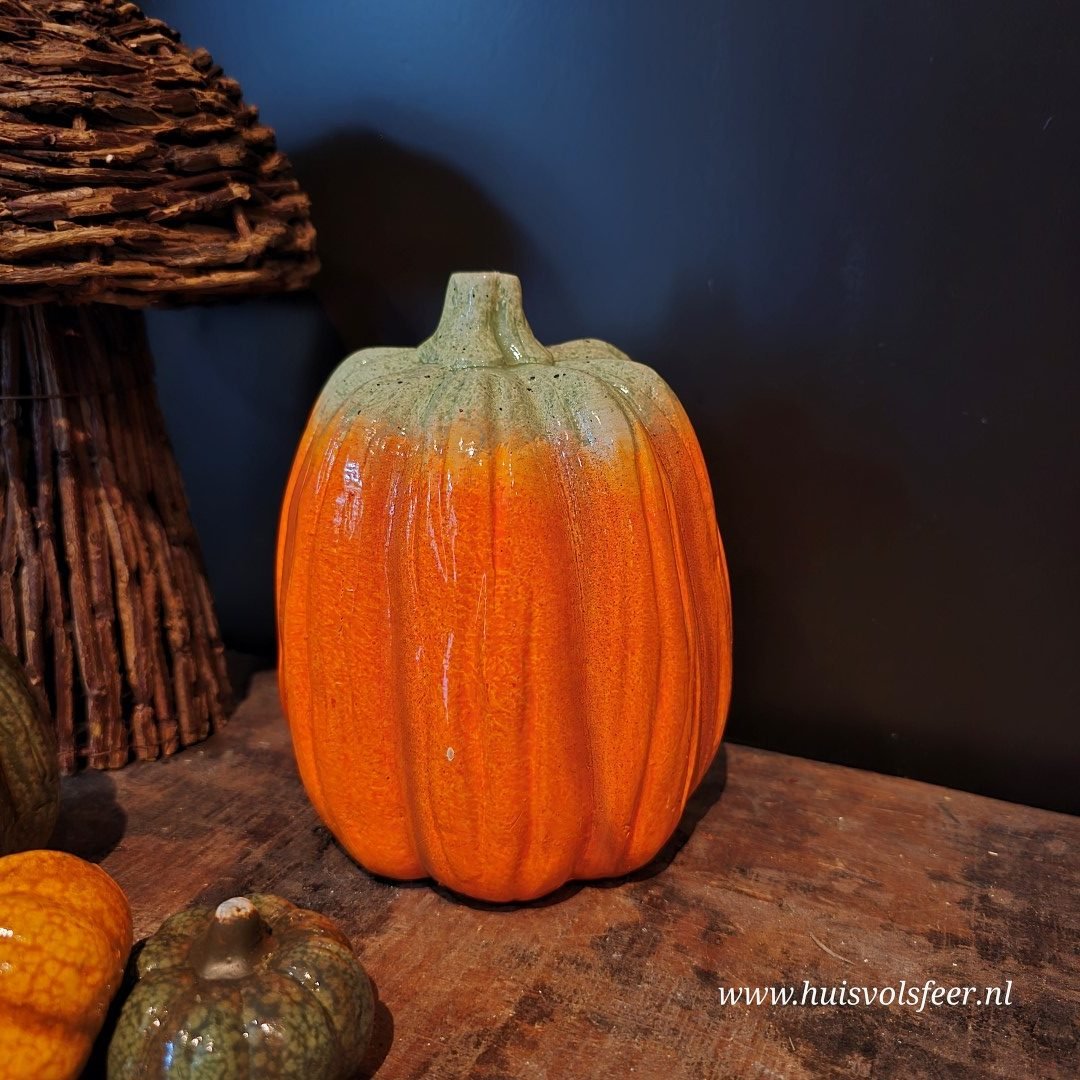 Deze vrolijke pompoen is een echte eyecatcher met zijn speelse kleurenverloop van helder oranje naar een lichtgroene top. Ideaal voor wie houdt van een knusse, landelijke herfstsfeer met een twist.
