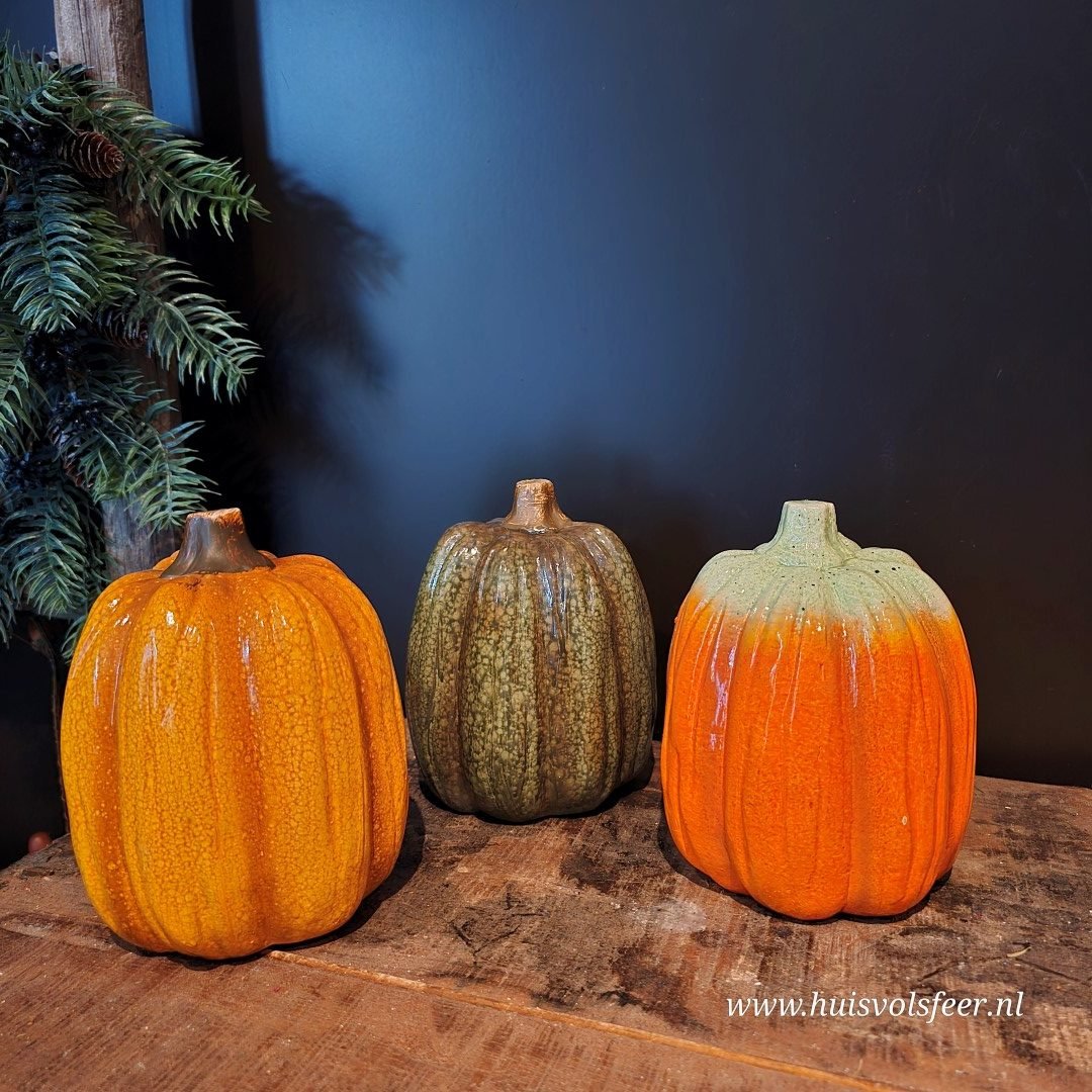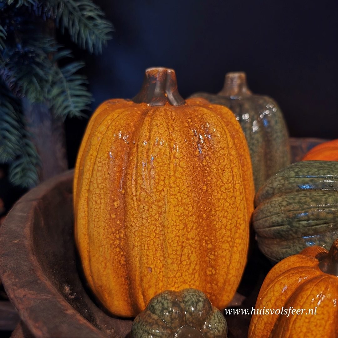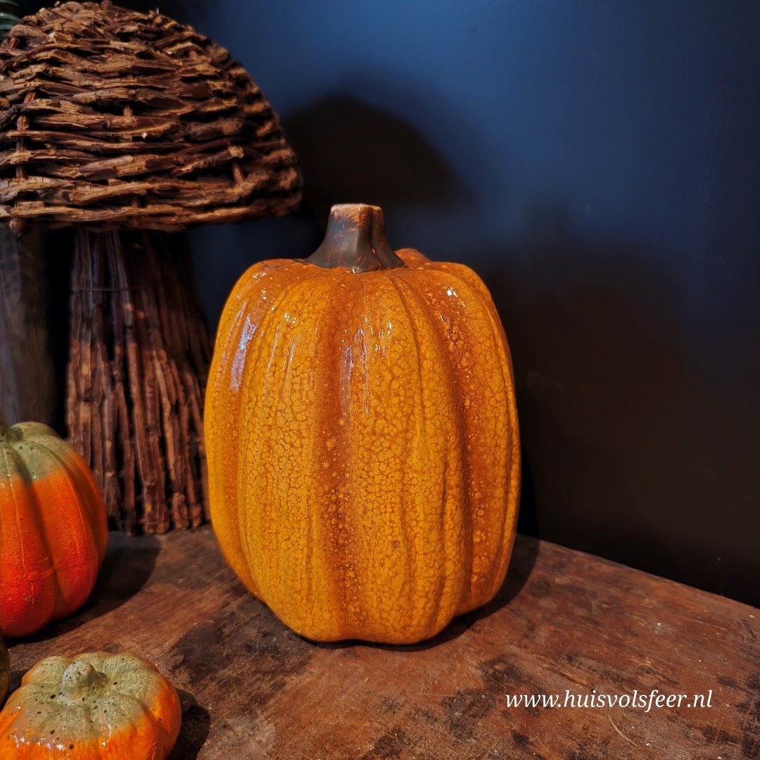 Breng direct herfstsfeer in huis met deze prachtige keramieken pompoen in een warme, diepe oranje tint. De geglazuurde afwerking geeft een subtiele glans, waardoor hij perfect combineert met hout, zink of een stoer shabby doek.