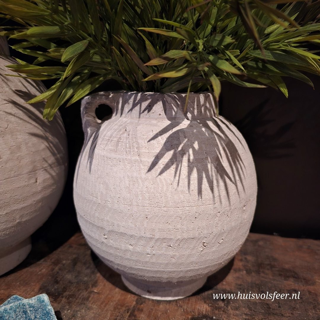 Prachtige Pors Pot van aardewerk met een authentieke uitstraling. Deze decoratieve pot heeft een natuurlijke, licht verweerde finish en een stoer oor aan de zijkant, wat zorgt voor een ambachtelijke en unieke look.