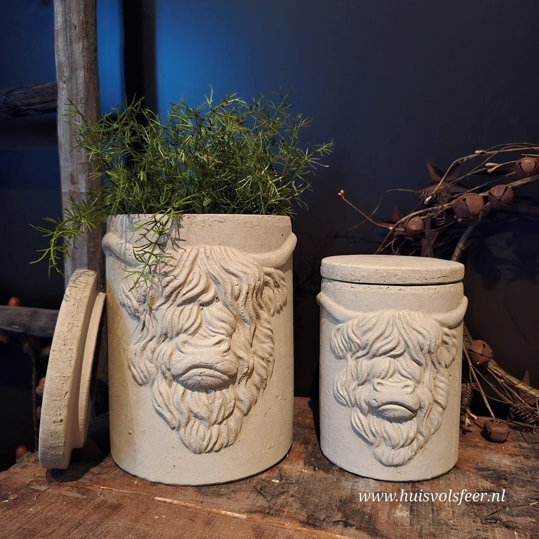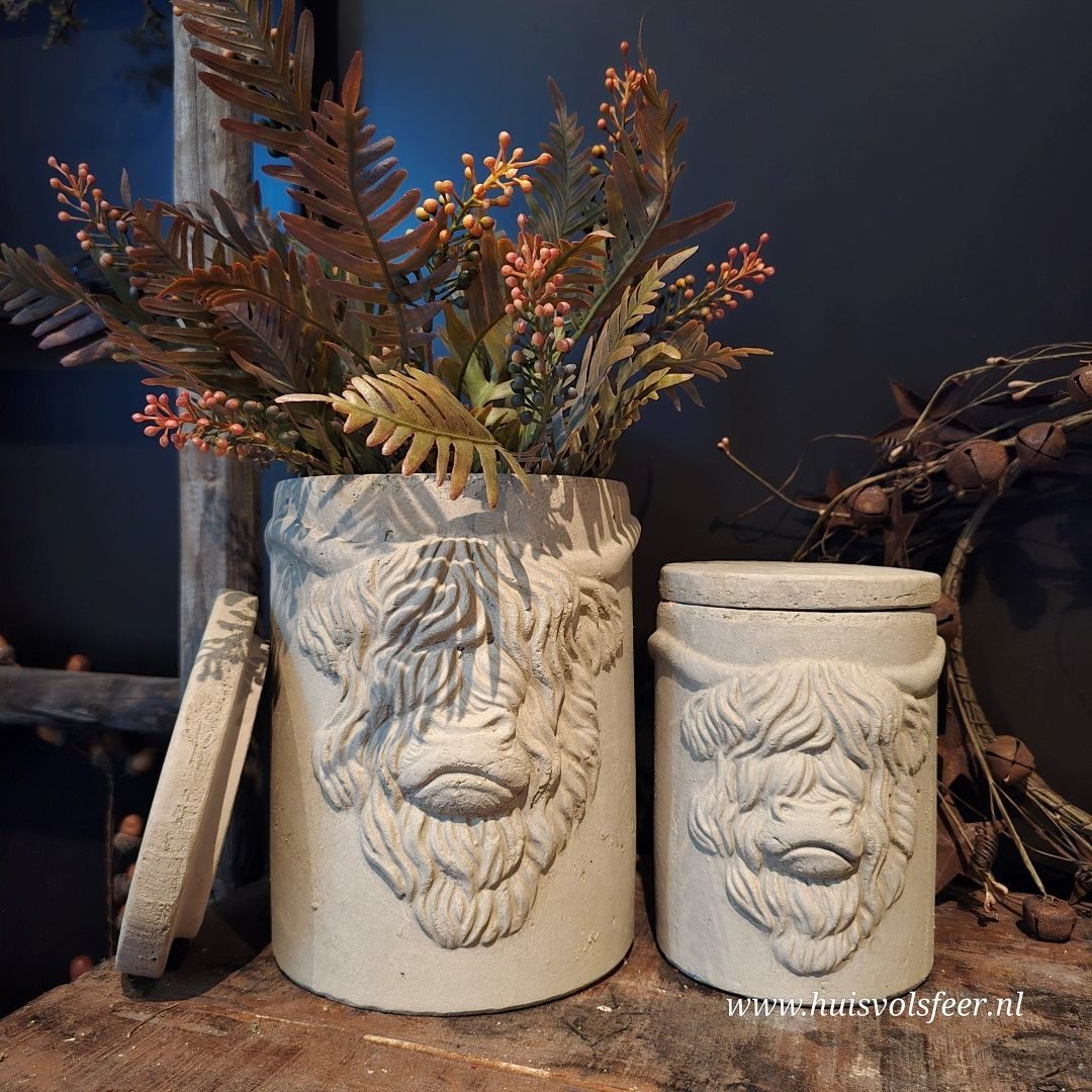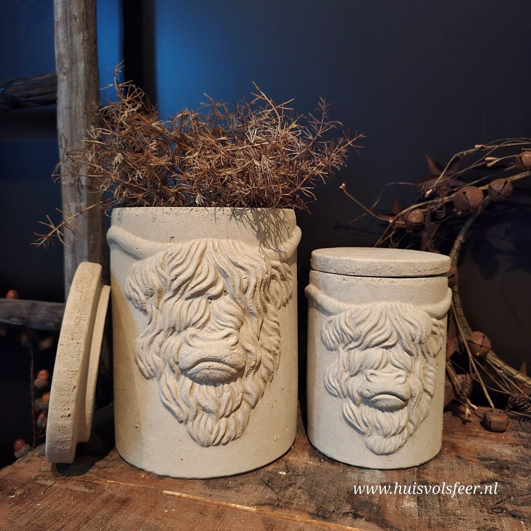 Deze pot met deksel heeft een afmeting van 14xH19 cm en toont het karakteristieke hoofd van een Schotse hooglander – stoer, krachtig en vol karakter. Ideaal voor een landelijk of sober interieur en leuk als decoratief opbergitem of als eyecatcher op een plank of kastje.