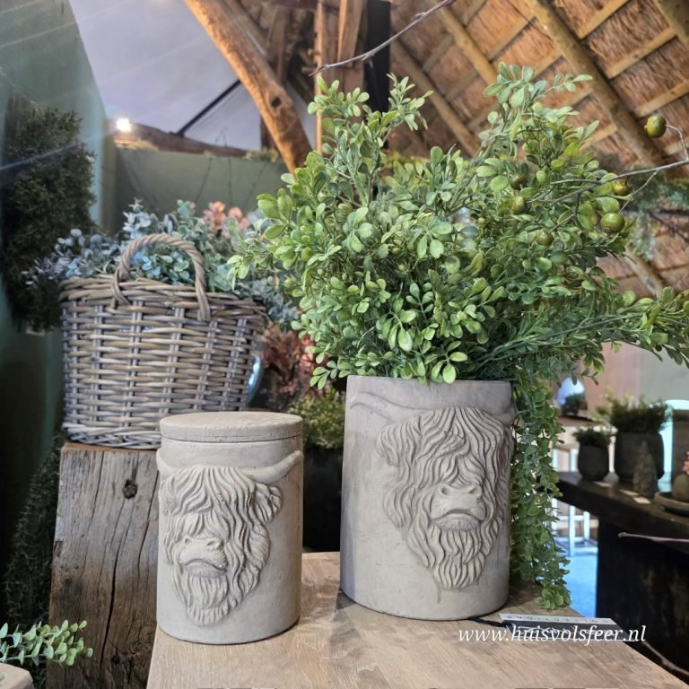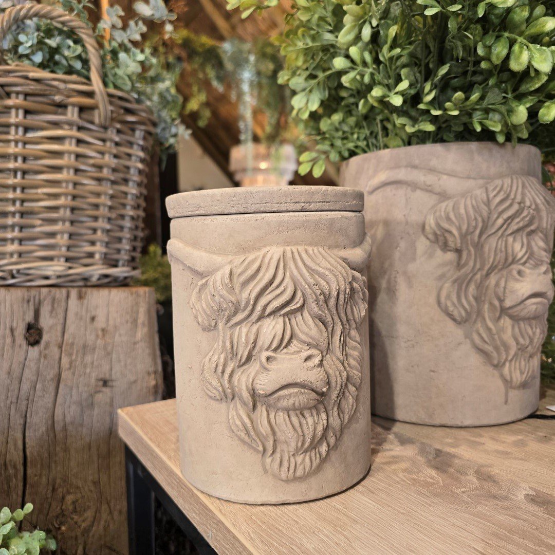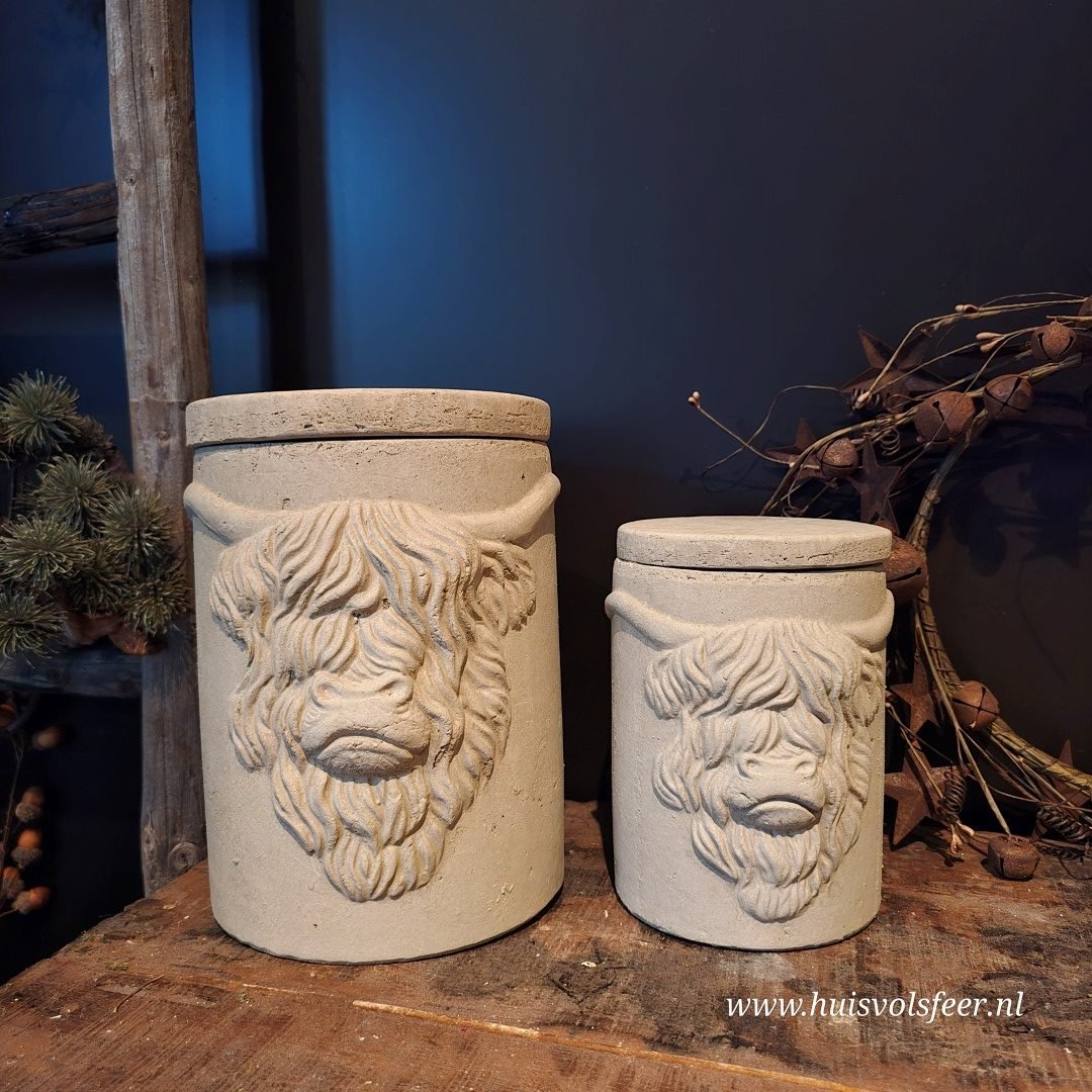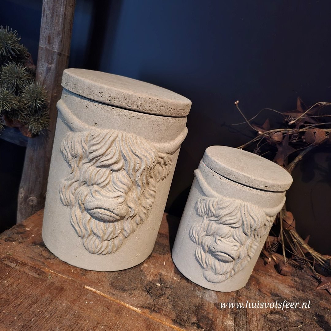 Deze pot met deksel heeft een afmeting van 14xH19 cm en toont het karakteristieke hoofd van een Schotse hooglander – stoer, krachtig en vol karakter. Ideaal voor een landelijk of sober interieur en leuk als decoratief opbergitem of als eyecatcher op een plank of kastje.