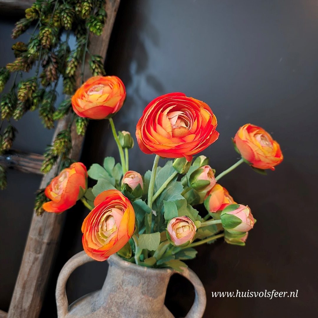 De ranunculus past moeiteloos binnen verschillende woonstijlen zoals landelijk, sober chic, romantisch of modern. Ideaal voor het voorjaar, maar door de warme kleur het hele jaar door een sfeervolle toevoeging aan je interieur.