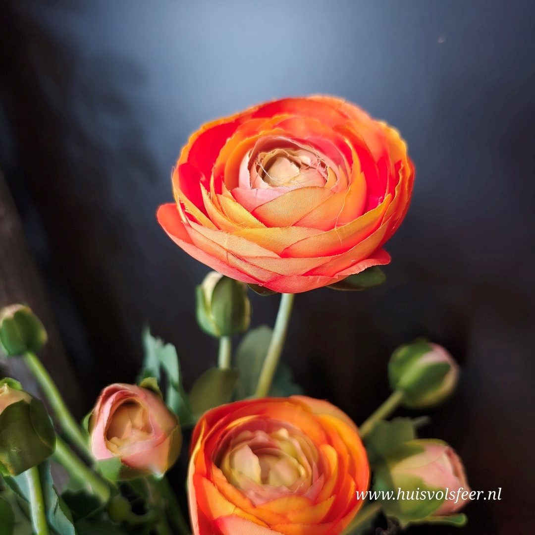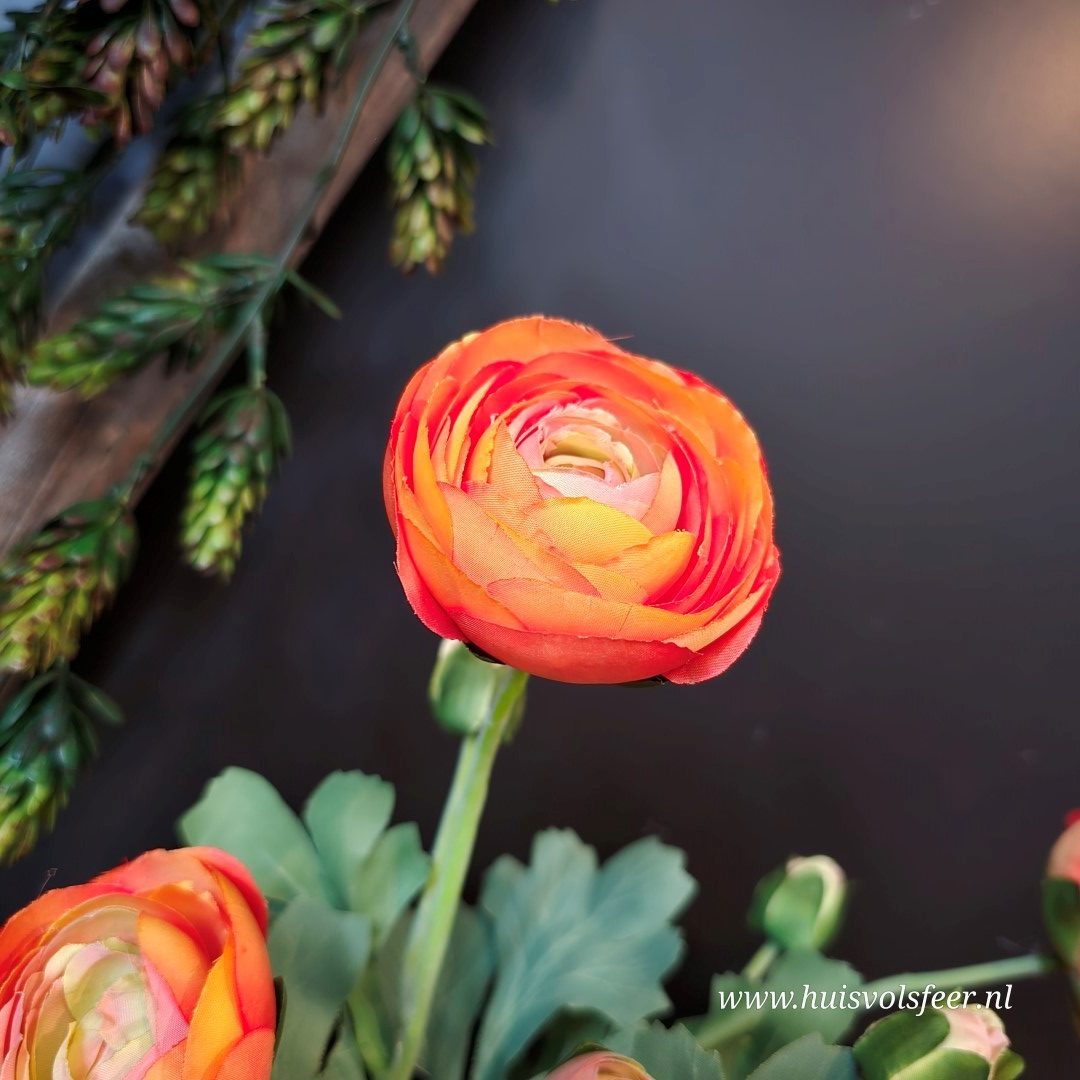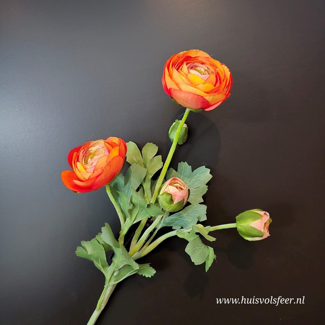 Breng warmte en kleur in huis met deze elegante Ranunculus Oranje zijdetak, ook wel bekend als ranonkel. De rijk gevulde bloemen met hun gelaagde bloemblaadjes in warme oranje tinten zorgen direct voor een levendige en sfeervolle uitstraling in ieder interieur. Dankzij de hoogwaardige zijden afwerking oogt deze kunstbloem vrijwel niet van echt te onderscheiden.