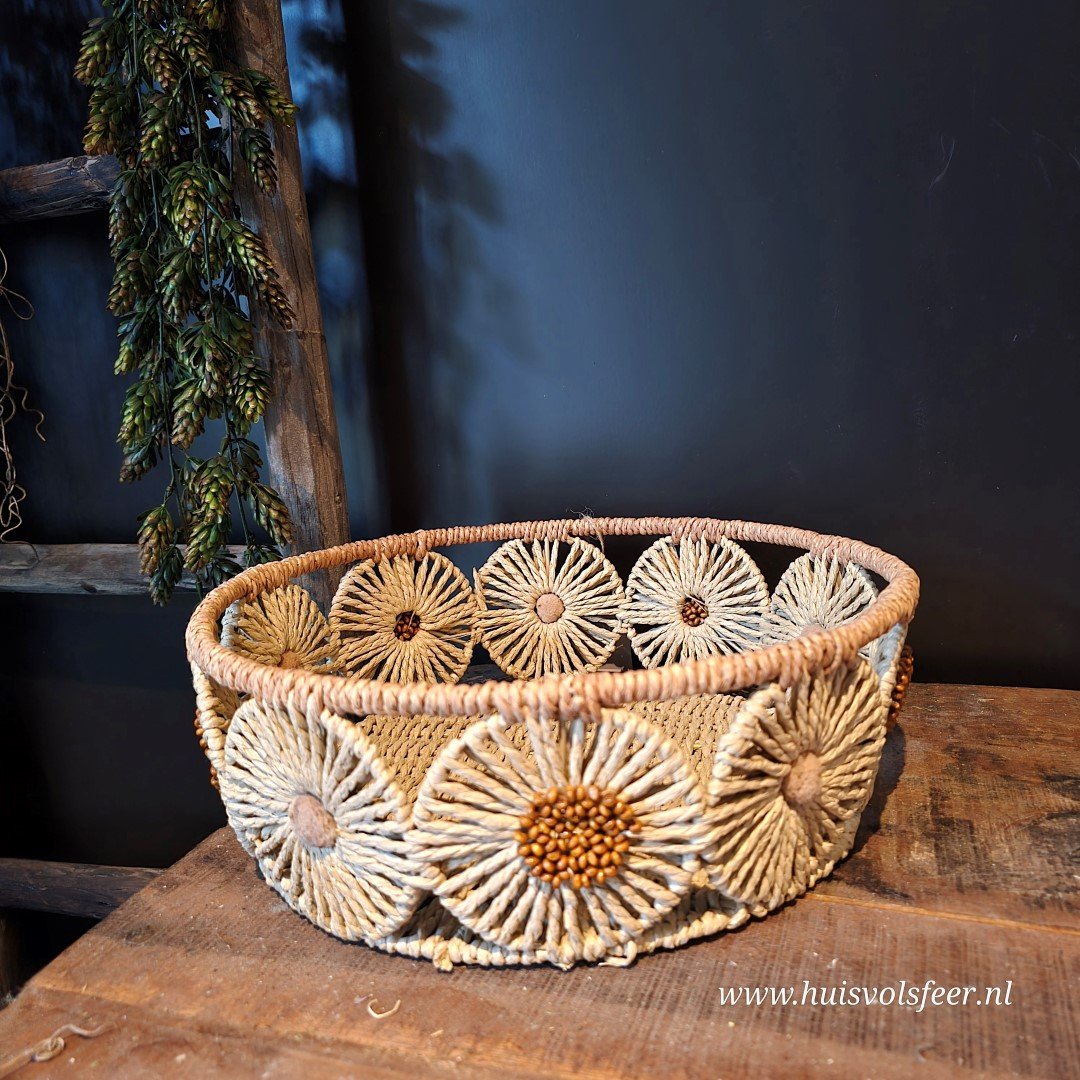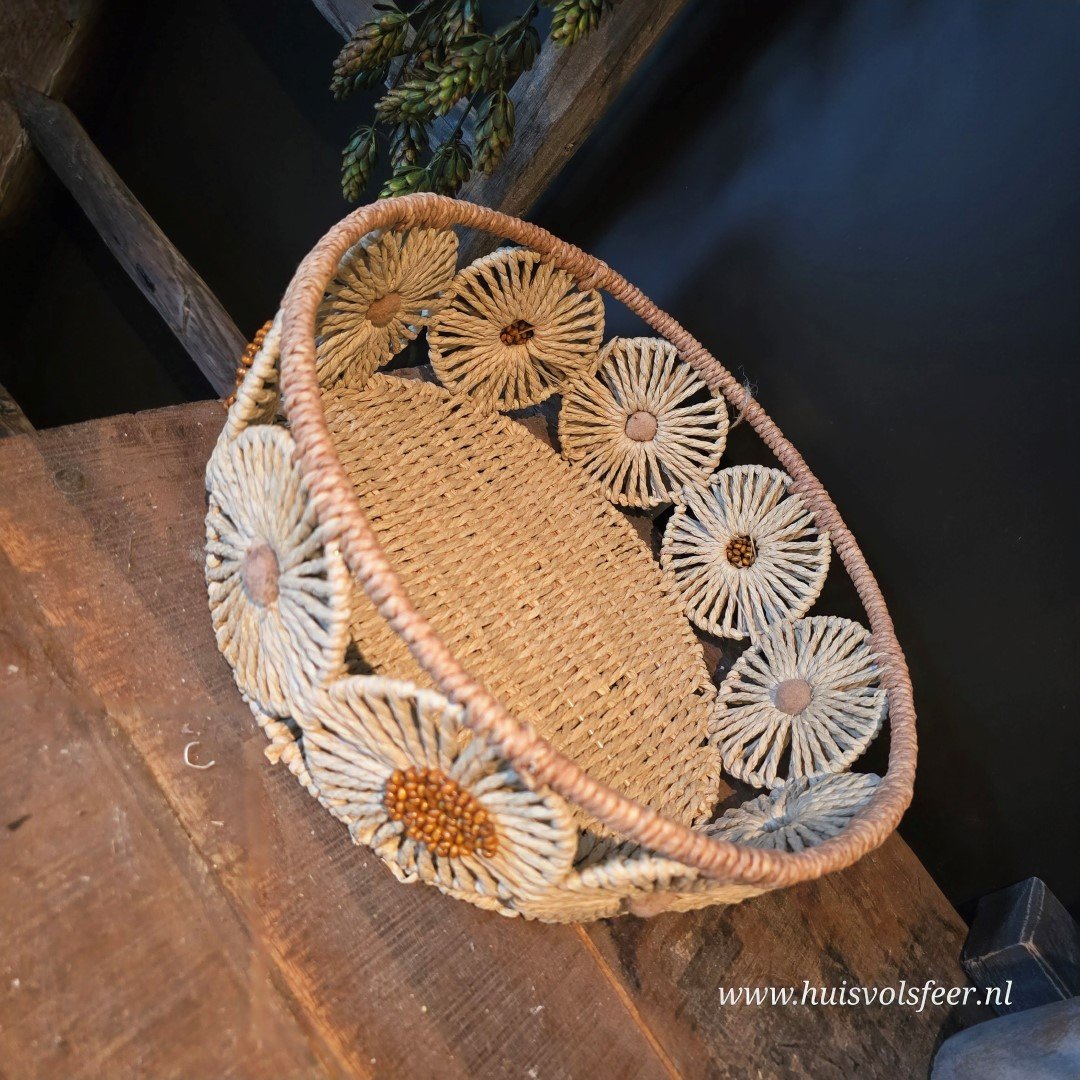 Breng een vleugje natuurlijke charme in je interieur met dit prachtige rotan dienblad. Dit unieke ontwerp is versierd met handgemaakte rotan bloemen, waarvan sommige een zachte oranje kernkleur hebben, wat zorgt voor een warme en speelse uitstraling.
