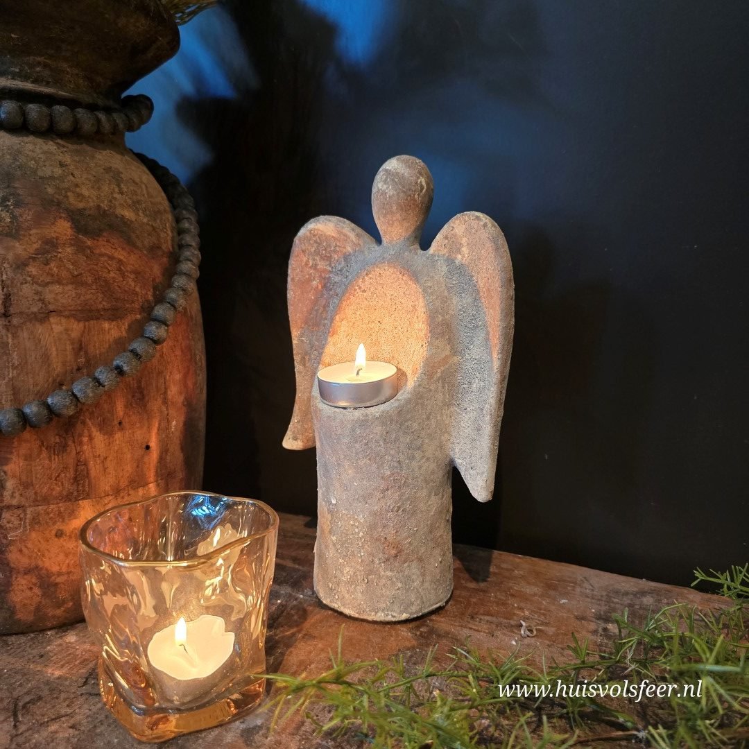 Het engeltje heeft prachtige, eenvoudige vleugels en draagt een waxinelichtje of LED-kaarsje in zijn handen. Het warme licht dat hierdoor ontstaat, benadrukt de serene uitstraling van dit beeldje. Mooi om solo neer te zetten, maar ook prachtig in combinatie met de grotere variant voor een speels en harmonieus effect.