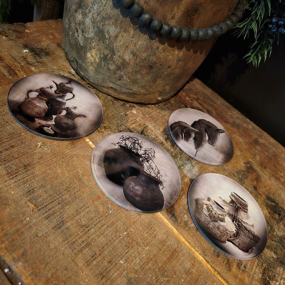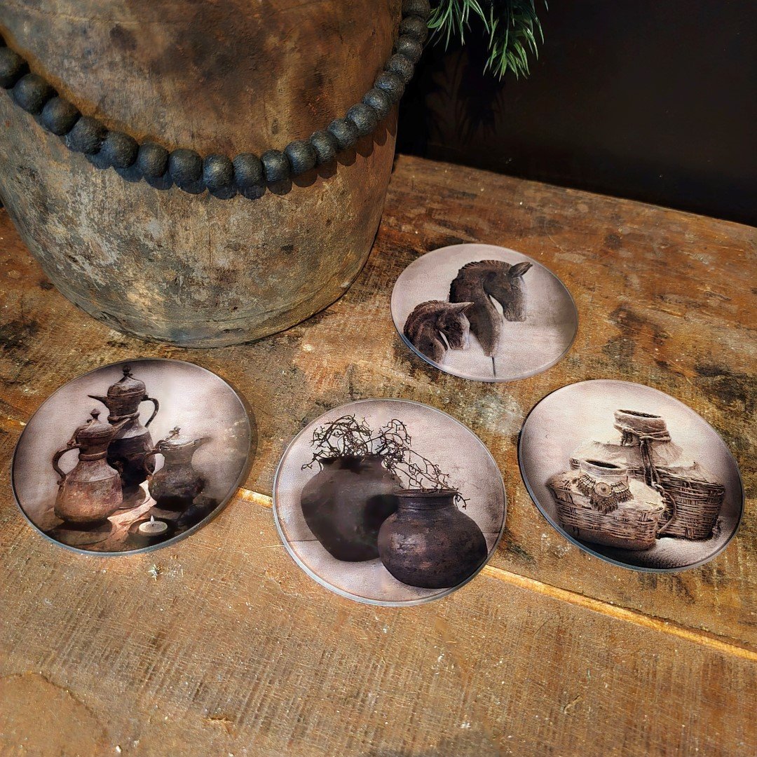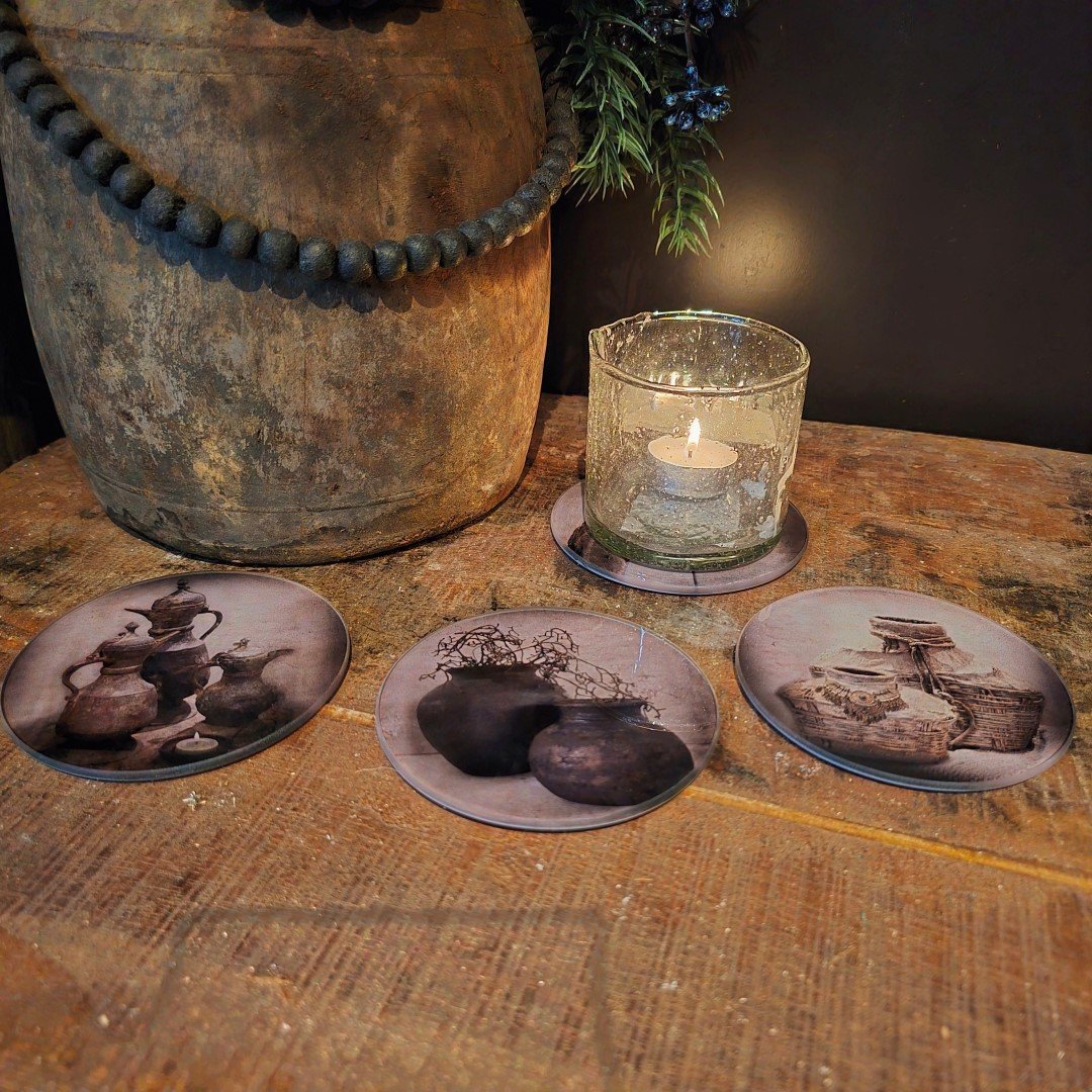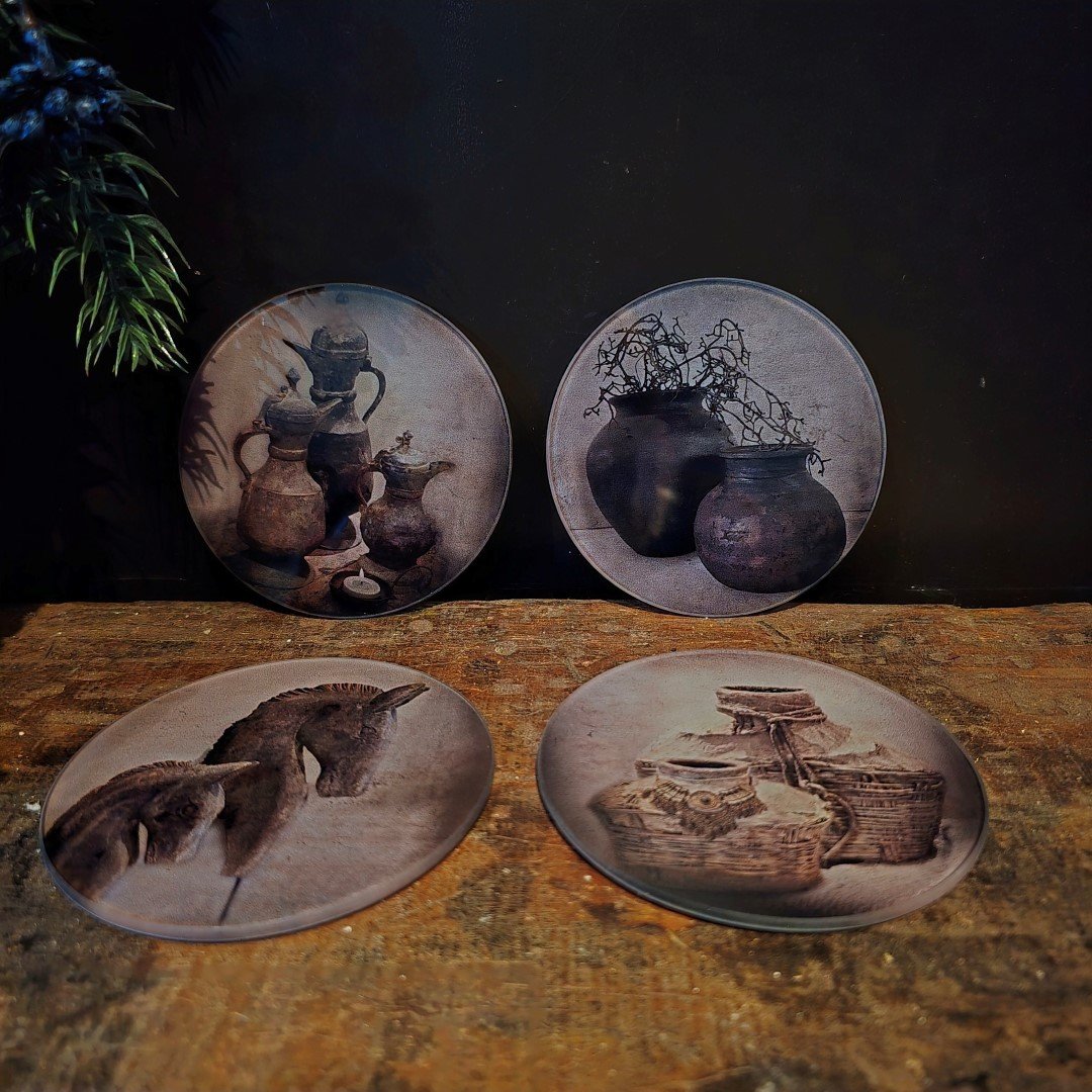 Deze stijlvolle set van 4 glazen onderzetters met landelijke, sobere afbeeldingen brengt rust en elegantie in elk interieur. De prints van kruiken, manden en natuurlijke objecten geven een authentieke sfeer — perfect voor liefhebbers van landelijke en sobere woonstijlen.