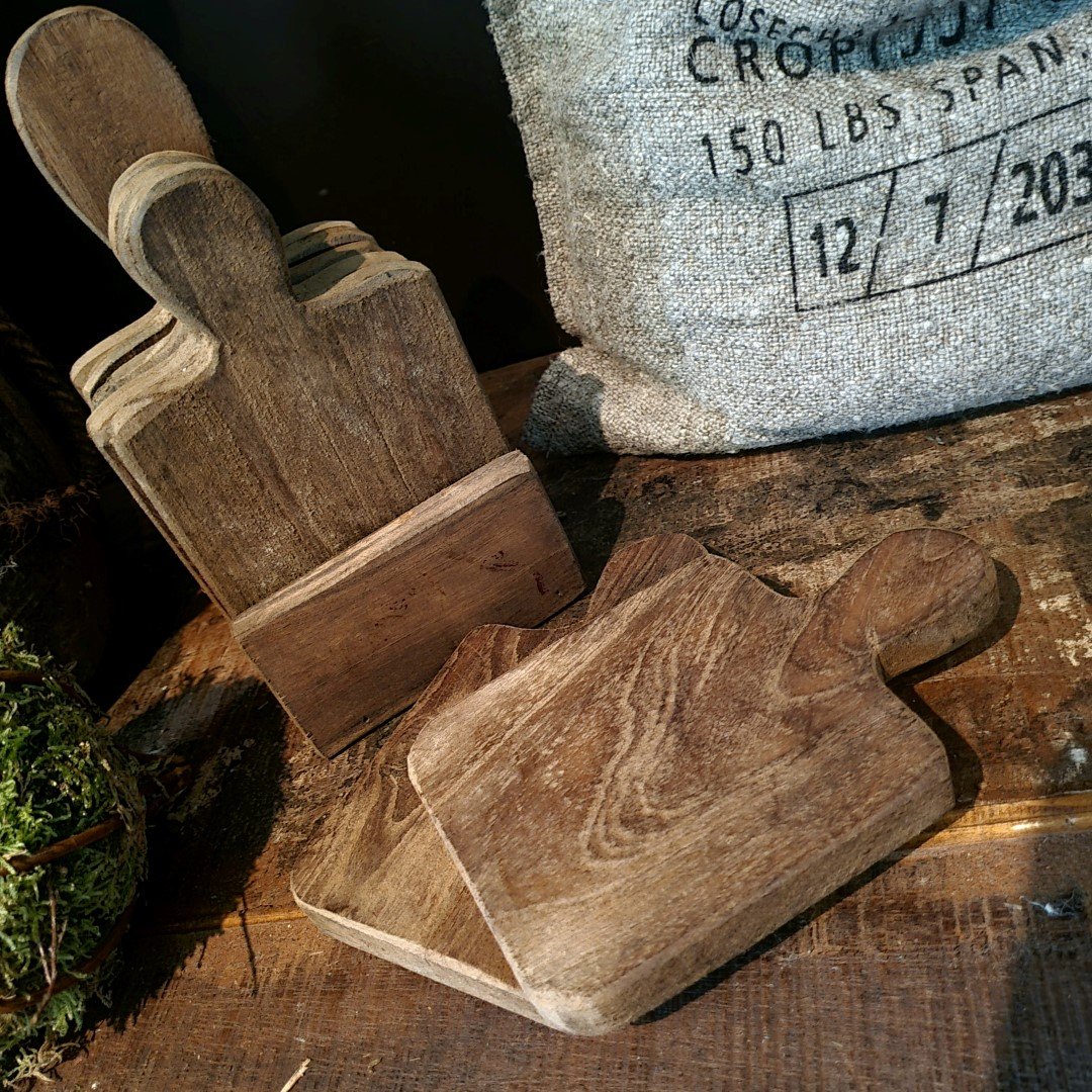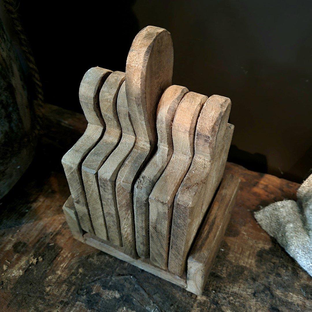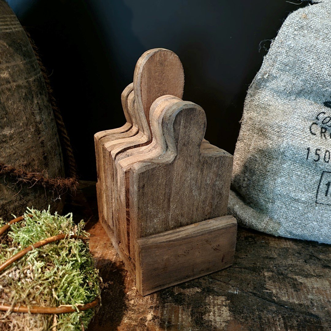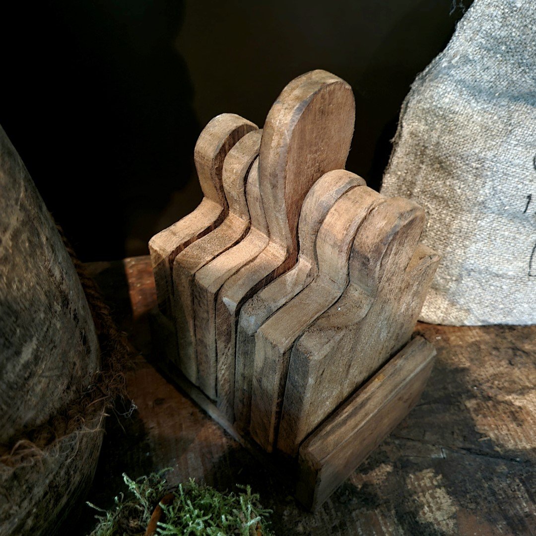 Robuust houten setje met 6 onderzetters/ plankjes in een houder.